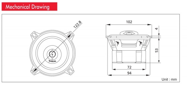| Диаметър на среднебасовия говорителДиаметърът на говорителя се посочва като диаметър на целия говорител, без да се включват монтажните закрепвания, при които при по-малките говорители (87, 100, 130 mm) закрепванията може да стърчат допълнително. Някои говорители са овални и там размерът се дава в инчове, винаги от най-късата към най-дългата страна. Един инч е приблизително 2,5 cm. | 100 mm |