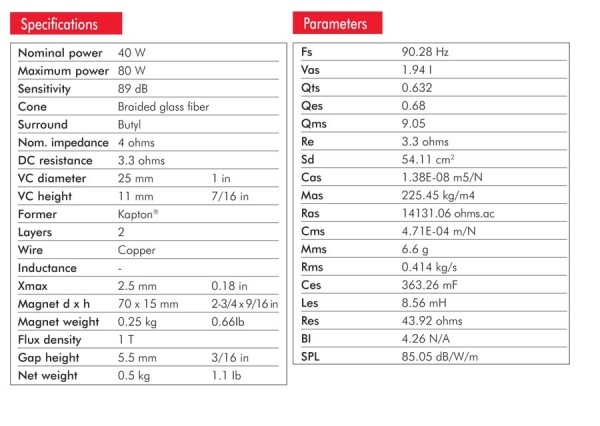 | Čувствителност (2,83V/1m)Чувствителност, сензитивност или ефективност на говорителя. Чувствителността на говорителите се посочва в децибели (dB) и накратко означава, че колкото по-висока е стойността, толкова по-малки са изискванията към мощността на усилвателя. Това всъщност е оценка за това как говорителят преобразува ватове в звук. Оценката на чувствителността е нивото на шума, измерено на 1 метър от говорителя при използване на 1 W (ват) или при подаване на 2,83 волта на източника на 1 метър. По-високото децибелово ниво означава, че говорителят е по-громък при по-ниска мощност. За всеки ръст от 3 dB чувствителността, говорителят изисква половината мощност за възпроизвеждане на същото ниво на звука. Например, ако говорител с 88 dB изисква 100 вата за постигане на определено ниво на звука, то говорител с 91 dB чувствителност изисква само 50 вата, за да достигне същото ниво. | 89 dB |