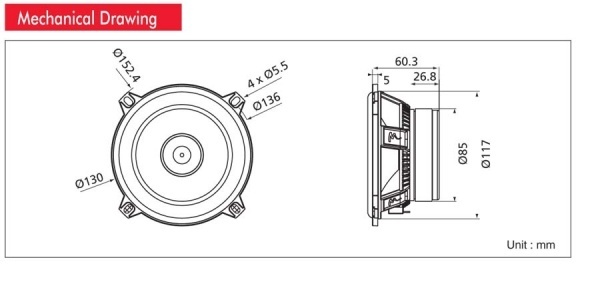 | Диаметър на среднебасовия говорителДиаметърът на говорителя се посочва като диаметър на целия говорител, без да се включват монтажните закрепвания, при които при по-малките говорители (87, 100, 130 mm) закрепванията може да стърчат допълнително. Някои говорители са овални и там размерът се дава в инчове, винаги от най-късата към най-дългата страна. Един инч е приблизително 2,5 cm. | 130 мм |