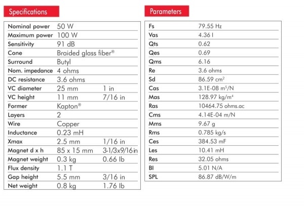 | Čувствителност (2,83V/1m)Чувствителност, сензитивност или ефективност на говорителя. Чувствителността на говорителите се посочва в децибели (dB) и накратко означава, че колкото по-висока е стойността, толкова по-малки са изискванията към мощността на усилвателя. Това всъщност е оценка за това как говорителят преобразува ватове в звук. Оценката на чувствителността е нивото на шума, измерено на 1 метър от говорителя при използване на 1 W (ват) или при подаване на 2,83 волта на източника на 1 метър. По-високото децибелово ниво означава, че говорителят е по-громък при по-ниска мощност. За всеки ръст от 3 dB чувствителността, говорителят изисква половината мощност за възпроизвеждане на същото ниво на звука. Например, ако говорител с 88 dB изисква 100 вата за постигане на определено ниво на звука, то говорител с 91 dB чувствителност изисква само 50 вата, за да достигне същото ниво. | 91 dB |