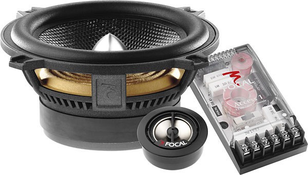 | Тип на високоговорителитеКоаксиални високоговорители: Коаксиалните високоговорители се характеризират с конструкция, наречена всичко в едно. Високочестотният и среднобасовият говорител са в един и същ кош. Предимството е по-лесен монтаж, но поради свързването или близостта на честотните диапазони в един говорител обикновено се понижава качеството на звука. Обикновено в центъра на среднобасовия говорител се намира високочестотният говорител, чиито звукова бобина работи във втората въздушна междина на общия магнитен кръг. Коаксиален говорител с три честотни диапазона се състои от среднобасов говорител, отпред на специален носач е поставен средночестотният говорител и отделен високочестотен. Компонентни високоговорители: Компонентните високоговорители се отличават с разделянето на отделни честотни диапазони: високочестотен + среднобасов + евентуално басов диапазон. Отделните говорители могат да бъдат разположени напълно отделно, което води до по-добро звуково и акустично представяне. В огромното мнозинство от случаите при компонентните високоговорители се доставя и външна кросоувърна мрежа, която разделя високите, средните/среднобасовите и при системи с три честотни диапазона и басовите честоти, както и позволява настройване на нивото в децибели на високочестотния говорител (напр. +2 dB, 0 dB, -2 dB), стръмността (напр. 6 dB/октава, 12 dB/октава) или активно/bi-amp свързване. | компонентна 2-посочна система |