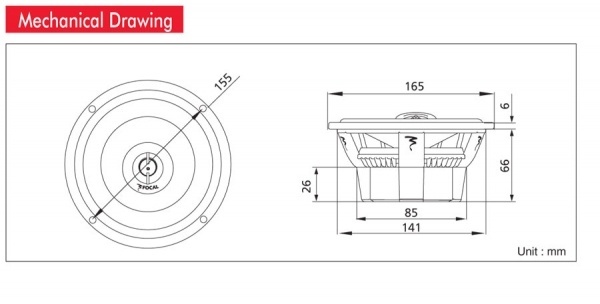 | Диаметър на среднебасовия говорителДиаметърът на говорителя се посочва като диаметър на целия говорител, без да се включват монтажните закрепвания, при които при по-малките говорители (87, 100, 130 mm) закрепванията може да стърчат допълнително. Някои говорители са овални и там размерът се дава в инчове, винаги от най-късата към най-дългата страна. Един инч е приблизително 2,5 cm. | 165 mm |