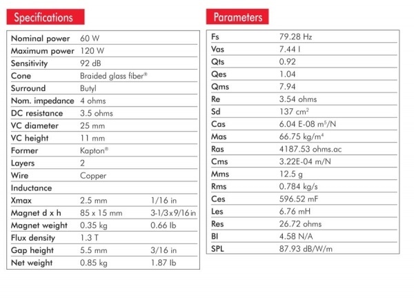 | Čувствителност (2,83V/1m)Чувствителност, сензитивност или ефективност на говорителя. Чувствителността на говорителите се посочва в децибели (dB) и накратко означава, че колкото по-висока е стойността, толкова по-малки са изискванията към мощността на усилвателя. Това всъщност е оценка за това как говорителят преобразува ватове в звук. Оценката на чувствителността е нивото на шума, измерено на 1 метър от говорителя при използване на 1 W (ват) или при подаване на 2,83 волта на източника на 1 метър. По-високото децибелово ниво означава, че говорителят е по-громък при по-ниска мощност. За всеки ръст от 3 dB чувствителността, говорителят изисква половината мощност за възпроизвеждане на същото ниво на звука. Например, ако говорител с 88 dB изисква 100 вата за постигане на определено ниво на звука, то говорител с 91 dB чувствителност изисква само 50 вата, за да достигне същото ниво. | 92 dB |