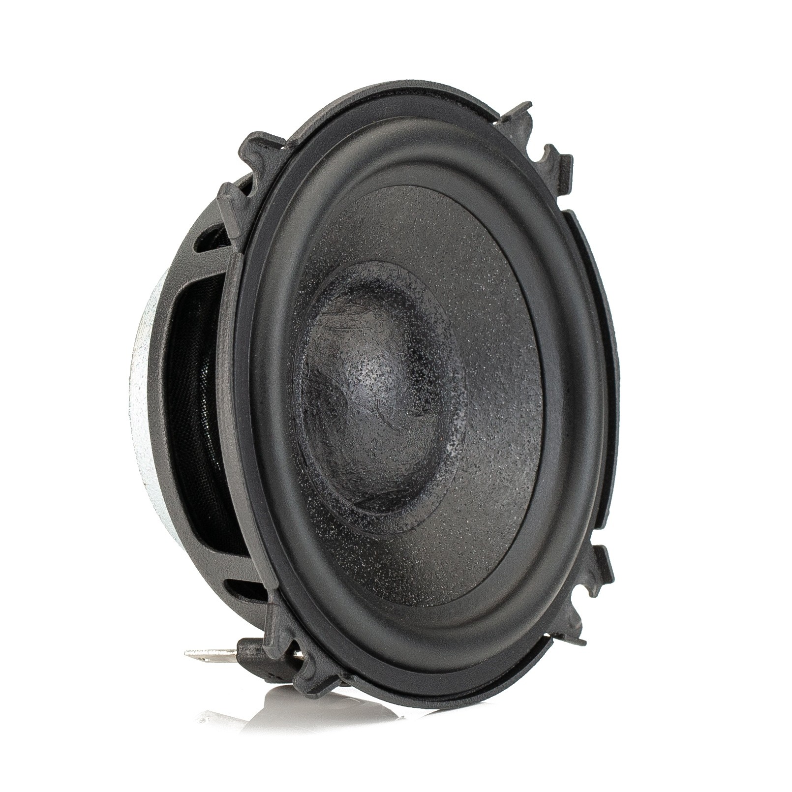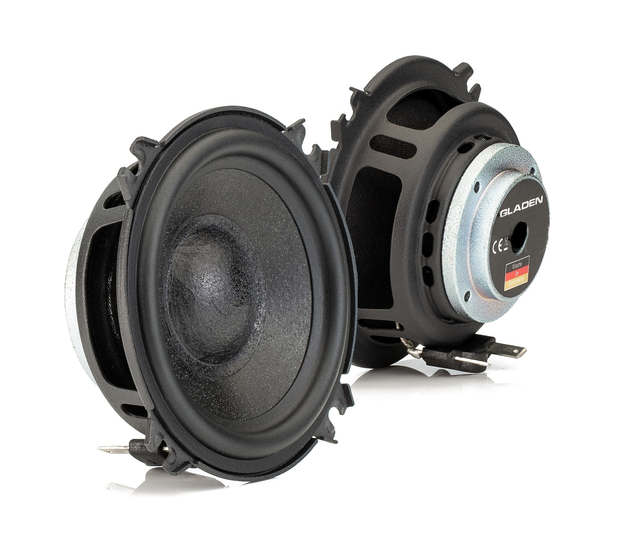 | Тип на високоговорителитеКоаксиални високоговорители: Коаксиалните високоговорители се характеризират с конструкция, наречена всичко в едно. Високочестотният и среднобасовият говорител са в един и същ кош. Предимството е по-лесен монтаж, но поради свързването или близостта на честотните диапазони в един говорител обикновено се понижава качеството на звука. Обикновено в центъра на среднобасовия говорител се намира високочестотният говорител, чиито звукова бобина работи във втората въздушна междина на общия магнитен кръг. Коаксиален говорител с три честотни диапазона се състои от среднобасов говорител, отпред на специален носач е поставен средночестотният говорител и отделен високочестотен. Компонентни високоговорители: Компонентните високоговорители се отличават с разделянето на отделни честотни диапазони: високочестотен + среднобасов + евентуално басов диапазон. Отделните говорители могат да бъдат разположени напълно отделно, което води до по-добро звуково и акустично представяне. В огромното мнозинство от случаите при компонентните високоговорители се доставя и външна кросоувърна мрежа, която разделя високите, средните/среднобасовите и при системи с три честотни диапазона и басовите честоти, както и позволява настройване на нивото в децибели на високочестотния говорител (напр. +2 dB, 0 dB, -2 dB), стръмността (напр. 6 dB/октава, 12 dB/октава) или активно/bi-amp свързване. | Среднобасови |