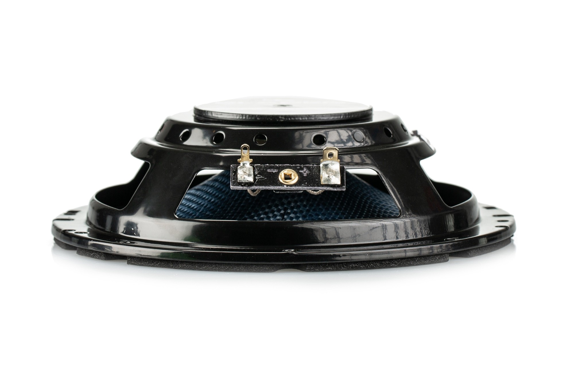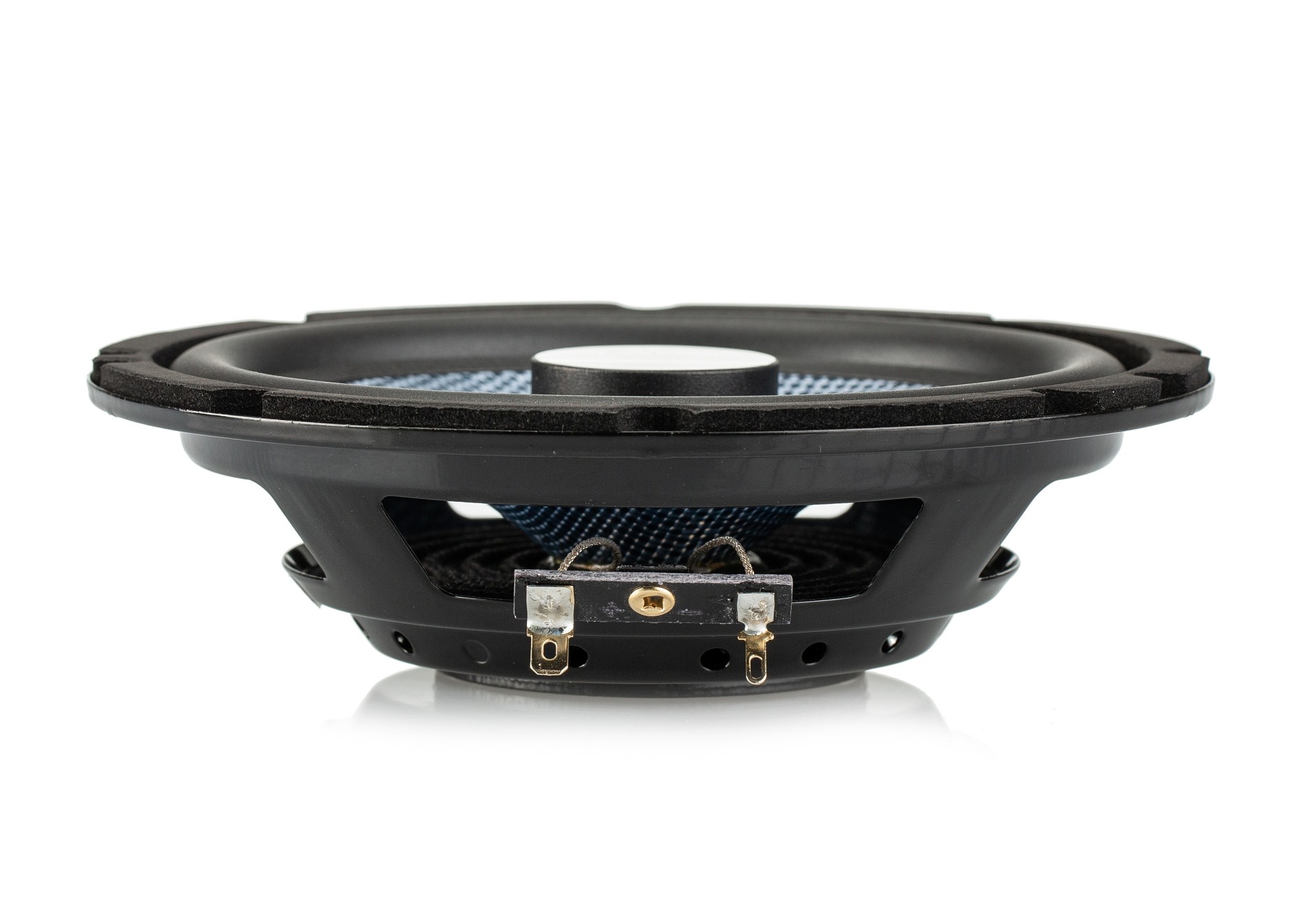 | Тип на високоговорителитеКоаксиални високоговорители: Коаксиалните високоговорители се характеризират с конструкция, наречена всичко в едно. Високочестотният и среднобасовият говорител са в един и същ кош. Предимството е по-лесен монтаж, но поради свързването или близостта на честотните диапазони в един говорител обикновено се понижава качеството на звука. Обикновено в центъра на среднобасовия говорител се намира високочестотният говорител, чиито звукова бобина работи във втората въздушна междина на общия магнитен кръг. Коаксиален говорител с три честотни диапазона се състои от среднобасов говорител, отпред на специален носач е поставен средночестотният говорител и отделен високочестотен. Компонентни високоговорители: Компонентните високоговорители се отличават с разделянето на отделни честотни диапазони: високочестотен + среднобасов + евентуално басов диапазон. Отделните говорители могат да бъдат разположени напълно отделно, което води до по-добро звуково и акустично представяне. В огромното мнозинство от случаите при компонентните високоговорители се доставя и външна кросоувърна мрежа, която разделя високите, средните/среднобасовите и при системи с три честотни диапазона и басовите честоти, както и позволява настройване на нивото в децибели на високочестотния говорител (напр. +2 dB, 0 dB, -2 dB), стръмността (напр. 6 dB/октава, 12 dB/октава) или активно/bi-amp свързване. | Компонентни двулентови |
