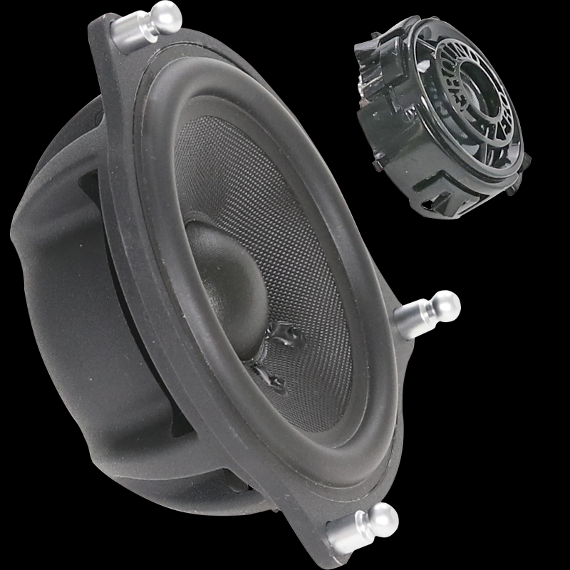 | Тип на високоговорителитеКоаксиални високоговорители: Коаксиалните високоговорители се характеризират с конструкция, наречена всичко в едно. Високочестотният и среднобасовият говорител са в един и същ кош. Предимството е по-лесен монтаж, но поради свързването или близостта на честотните диапазони в един говорител обикновено се понижава качеството на звука. Обикновено в центъра на среднобасовия говорител се намира високочестотният говорител, чиито звукова бобина работи във втората въздушна междина на общия магнитен кръг. Коаксиален говорител с три честотни диапазона се състои от среднобасов говорител, отпред на специален носач е поставен средночестотният говорител и отделен високочестотен. Компонентни високоговорители: Компонентните високоговорители се отличават с разделянето на отделни честотни диапазони: високочестотен + среднобасов + евентуално басов диапазон. Отделните говорители могат да бъдат разположени напълно отделно, което води до по-добро звуково и акустично представяне. В огромното мнозинство от случаите при компонентните високоговорители се доставя и външна кросоувърна мрежа, която разделя високите, средните/среднобасовите и при системи с три честотни диапазона и басовите честоти, както и позволява настройване на нивото в децибели на високочестотния говорител (напр. +2 dB, 0 dB, -2 dB), стръмността (напр. 6 dB/октава, 12 dB/октава) или активно/bi-amp свързване. | Компонентни 2-посочни |