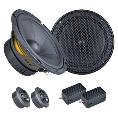 | Тип на високоговорителитеКоаксиални високоговорители: Коаксиалните високоговорители се характеризират с конструкция, наречена всичко в едно. Високочестотният и среднобасовият говорител са в един и същ кош. Предимството е по-лесен монтаж, но поради свързването или близостта на честотните диапазони в един говорител обикновено се понижава качеството на звука. Обикновено в центъра на среднобасовия говорител се намира високочестотният говорител, чиито звукова бобина работи във втората въздушна междина на общия магнитен кръг. Коаксиален говорител с три честотни диапазона се състои от среднобасов говорител, отпред на специален носач е поставен средночестотният говорител и отделен високочестотен. Компонентни високоговорители: Компонентните високоговорители се отличават с разделянето на отделни честотни диапазони: високочестотен + среднобасов + евентуално басов диапазон. Отделните говорители могат да бъдат разположени напълно отделно, което води до по-добро звуково и акустично представяне. В огромното мнозинство от случаите при компонентните високоговорители се доставя и външна кросоувърна мрежа, която разделя високите, средните/среднобасовите и при системи с три честотни диапазона и басовите честоти, както и позволява настройване на нивото в децибели на високочестотния говорител (напр. +2 dB, 0 dB, -2 dB), стръмността (напр. 6 dB/октава, 12 dB/октава) или активно/bi-amp свързване. | Компонентни двулентови |