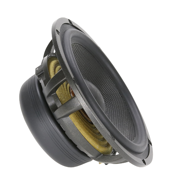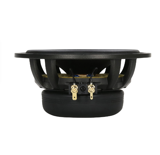| Тип на високоговорителитеКоаксиални високоговорители: Коаксиалните високоговорители се характеризират с конструкция, наречена всичко в едно. Високочестотният и среднобасовият говорител са в един и същ кош. Предимството е по-лесен монтаж, но поради свързването или близостта на честотните диапазони в един говорител обикновено се понижава качеството на звука. Обикновено в центъра на среднобасовия говорител се намира високочестотният говорител, чиито звукова бобина работи във втората въздушна междина на общия магнитен кръг. Коаксиален говорител с три честотни диапазона се състои от среднобасов говорител, отпред на специален носач е поставен средночестотният говорител и отделен високочестотен. Компонентни високоговорители: Компонентните високоговорители се отличават с разделянето на отделни честотни диапазони: високочестотен + среднобасов + евентуално басов диапазон. Отделните говорители могат да бъдат разположени напълно отделно, което води до по-добро звуково и акустично представяне. В огромното мнозинство от случаите при компонентните високоговорители се доставя и външна кросоувърна мрежа, която разделя високите, средните/среднобасовите и при системи с три честотни диапазона и басовите честоти, както и позволява настройване на нивото в децибели на високочестотния говорител (напр. +2 dB, 0 dB, -2 dB), стръмността (напр. 6 dB/октава, 12 dB/октава) или активно/bi-amp свързване. | Среднобасови |