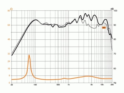 | Čувствителност (2,83V/1m)Чувствителност, сензитивност или ефективност на говорителя. Чувствителността на говорителите се посочва в децибели (dB) и накратко означава, че колкото по-висока е стойността, толкова по-малки са изискванията към мощността на усилвателя. Това всъщност е оценка за това как говорителят преобразува ватове в звук. Оценката на чувствителността е нивото на шума, измерено на 1 метър от говорителя при използване на 1 W (ват) или при подаване на 2,83 волта на източника на 1 метър. По-високото децибелово ниво означава, че говорителят е по-громък при по-ниска мощност. За всеки ръст от 3 dB чувствителността, говорителят изисква половината мощност за възпроизвеждане на същото ниво на звука. Например, ако говорител с 88 dB изисква 100 вата за постигане на определено ниво на звука, то говорител с 91 dB чувствителност изисква само 50 вата, за да достигне същото ниво. | 94 dB |