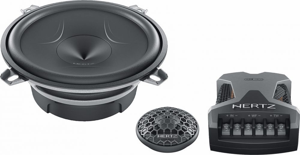 | Тип на високоговорителитеКоаксиални високоговорители: Коаксиалните високоговорители се характеризират с конструкция, наречена всичко в едно. Високочестотният и среднобасовият говорител са в един и същ кош. Предимството е по-лесен монтаж, но поради свързването или близостта на честотните диапазони в един говорител обикновено се понижава качеството на звука. Обикновено в центъра на среднобасовия говорител се намира високочестотният говорител, чиито звукова бобина работи във втората въздушна междина на общия магнитен кръг. Коаксиален говорител с три честотни диапазона се състои от среднобасов говорител, отпред на специален носач е поставен средночестотният говорител и отделен високочестотен. Компонентни високоговорители: Компонентните високоговорители се отличават с разделянето на отделни честотни диапазони: високочестотен + среднобасов + евентуално басов диапазон. Отделните говорители могат да бъдат разположени напълно отделно, което води до по-добро звуково и акустично представяне. В огромното мнозинство от случаите при компонентните високоговорители се доставя и външна кросоувърна мрежа, която разделя високите, средните/среднобасовите и при системи с три честотни диапазона и басовите честоти, както и позволява настройване на нивото в децибели на високочестотния говорител (напр. +2 dB, 0 dB, -2 dB), стръмността (напр. 6 dB/октава, 12 dB/октава) или активно/bi-amp свързване. | Компонентни 2-лентови |