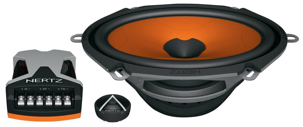| Тип на високоговорителитеКоаксиални високоговорители: Коаксиалните високоговорители се характеризират с конструкция, наречена всичко в едно. Високочестотният и среднобасовият говорител са в един и същ кош. Предимството е по-лесен монтаж, но поради свързването или близостта на честотните диапазони в един говорител обикновено се понижава качеството на звука. Обикновено в центъра на среднобасовия говорител се намира високочестотният говорител, чиито звукова бобина работи във втората въздушна междина на общия магнитен кръг. Коаксиален говорител с три честотни диапазона се състои от среднобасов говорител, отпред на специален носач е поставен средночестотният говорител и отделен високочестотен. Компонентни високоговорители: Компонентните високоговорители се отличават с разделянето на отделни честотни диапазони: високочестотен + среднобасов + евентуално басов диапазон. Отделните говорители могат да бъдат разположени напълно отделно, което води до по-добро звуково и акустично представяне. В огромното мнозинство от случаите при компонентните високоговорители се доставя и външна кросоувърна мрежа, която разделя високите, средните/среднобасовите и при системи с три честотни диапазона и басовите честоти, както и позволява настройване на нивото в децибели на високочестотния говорител (напр. +2 dB, 0 dB, -2 dB), стръмността (напр. 6 dB/октава, 12 dB/октава) или активно/bi-amp свързване. | компонентни 2-лентови |