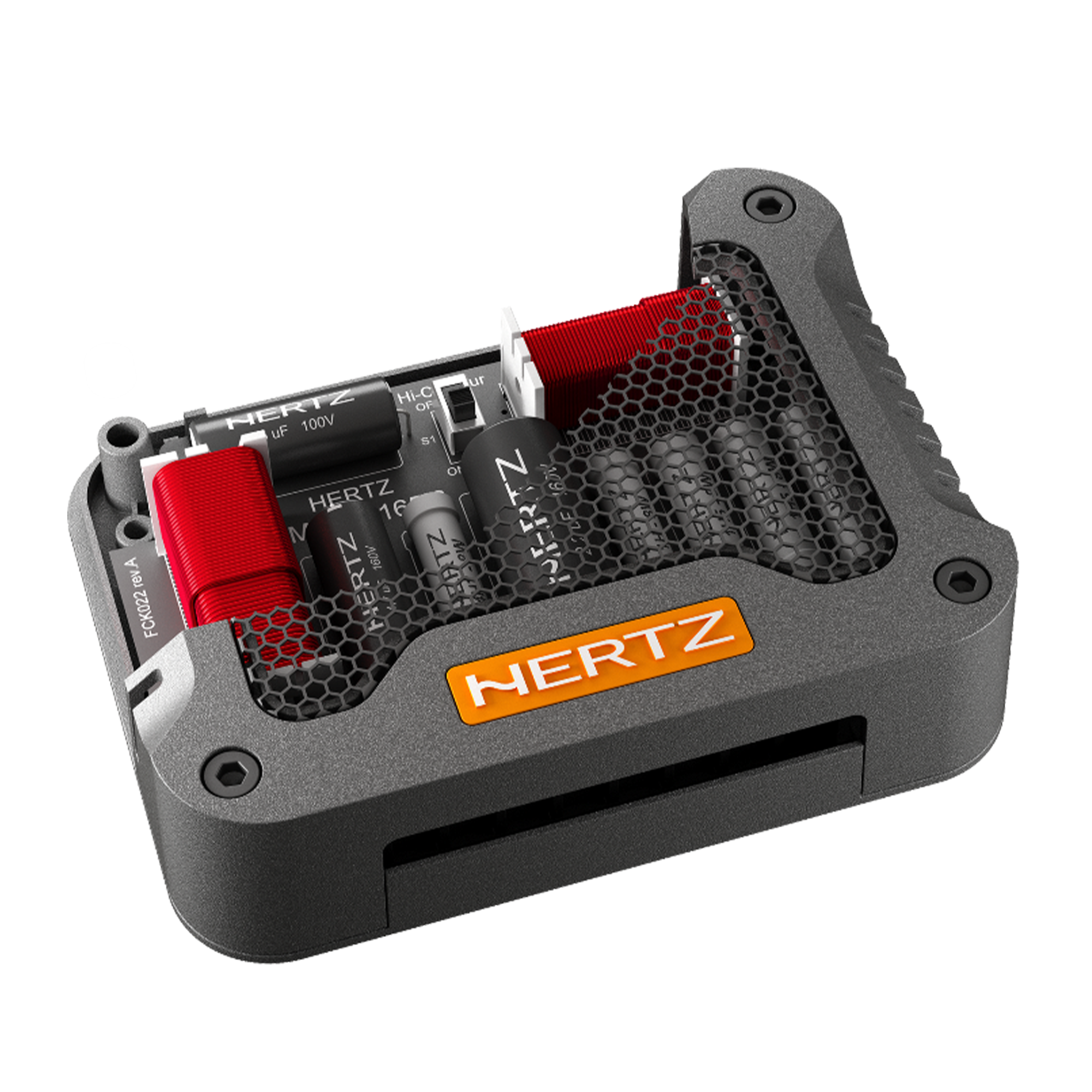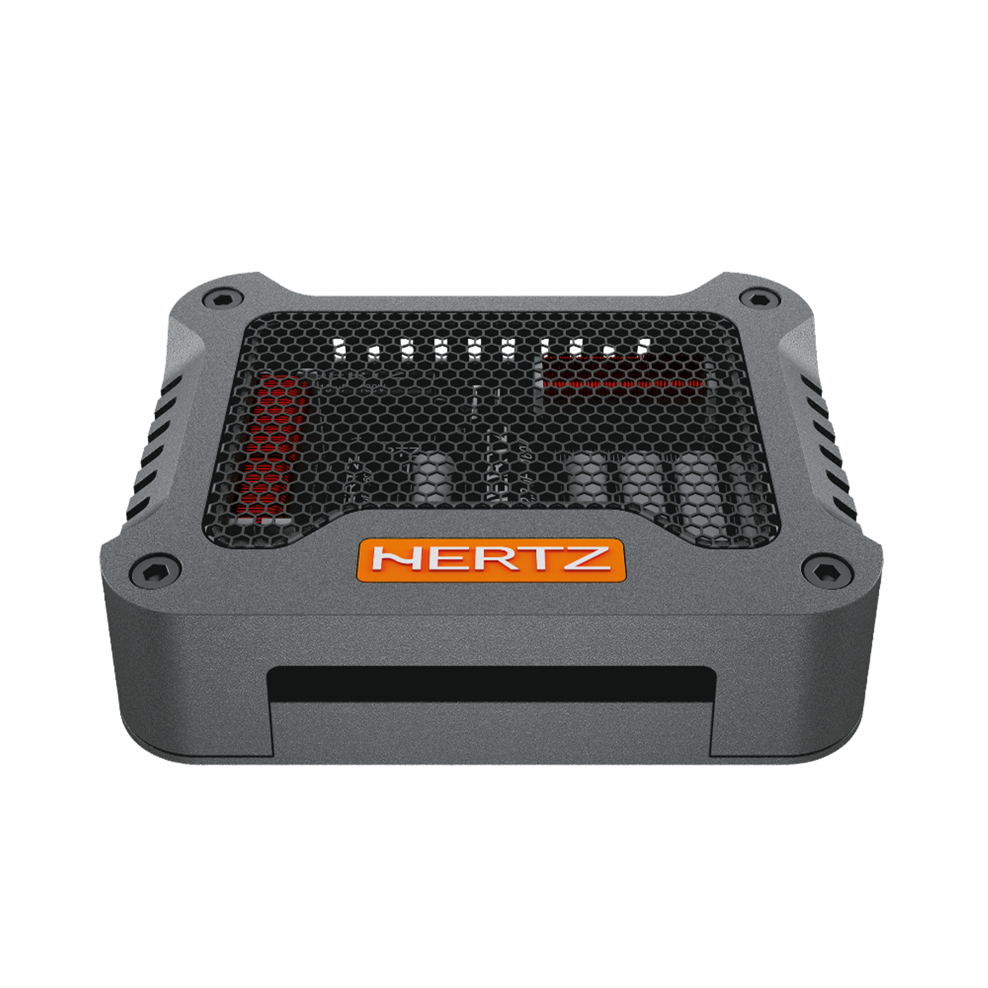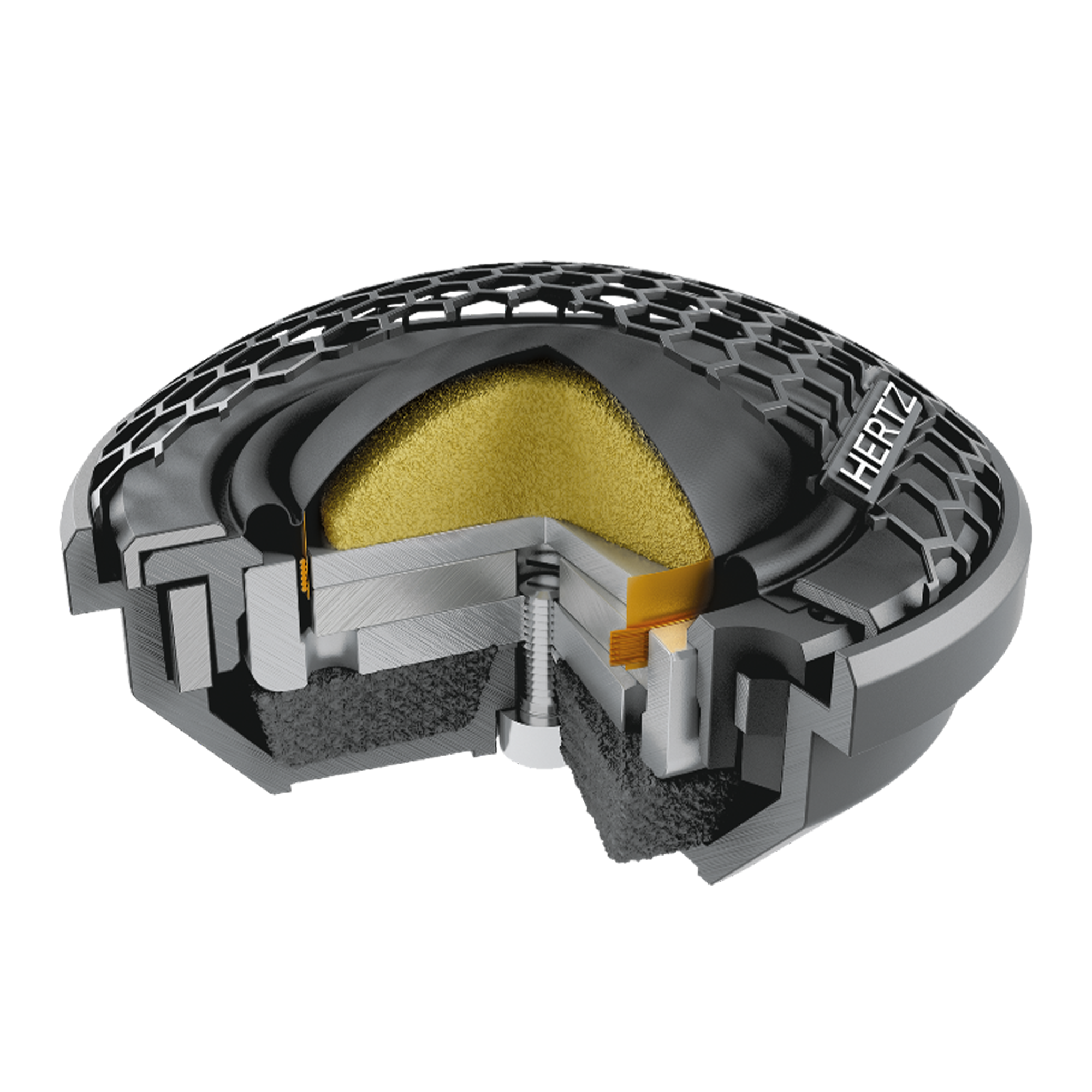 - Ниска монтажна дълбочина, акустично прозрачна кошница от алуминиева сплав с елегантно лого Hertz.