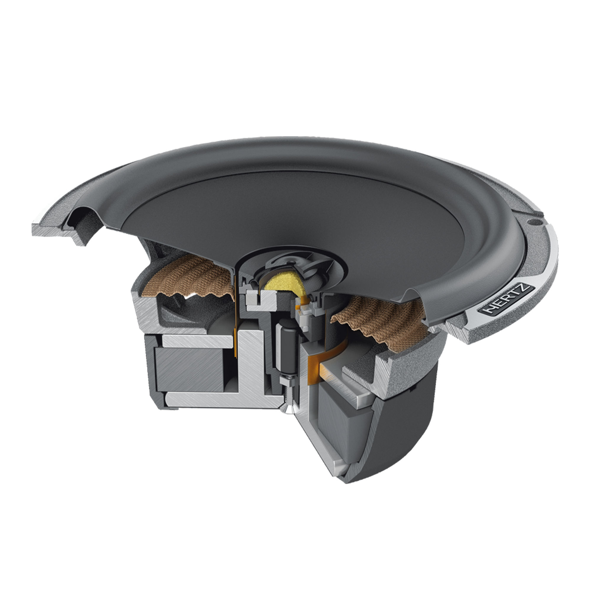 - Ниска монтажна дълбочина, акустично прозрачна кошница от алуминиева сплав с елегантното лого Hertz.