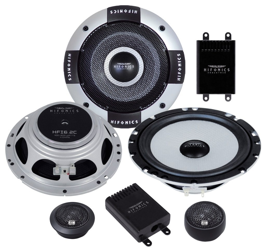 | Тип на високоговорителитеКоаксиални високоговорители: Коаксиалните високоговорители се характеризират с конструкция, наречена всичко в едно. Високочестотният и среднобасовият говорител са в един и същ кош. Предимството е по-лесен монтаж, но поради свързването или близостта на честотните диапазони в един говорител обикновено се понижава качеството на звука. Обикновено в центъра на среднобасовия говорител се намира високочестотният говорител, чиито звукова бобина работи във втората въздушна междина на общия магнитен кръг. Коаксиален говорител с три честотни диапазона се състои от среднобасов говорител, отпред на специален носач е поставен средночестотният говорител и отделен високочестотен. Компонентни високоговорители: Компонентните високоговорители се отличават с разделянето на отделни честотни диапазони: високочестотен + среднобасов + евентуално басов диапазон. Отделните говорители могат да бъдат разположени напълно отделно, което води до по-добро звуково и акустично представяне. В огромното мнозинство от случаите при компонентните високоговорители се доставя и външна кросоувърна мрежа, която разделя високите, средните/среднобасовите и при системи с три честотни диапазона и басовите честоти, както и позволява настройване на нивото в децибели на високочестотния говорител (напр. +2 dB, 0 dB, -2 dB), стръмността (напр. 6 dB/октава, 12 dB/октава) или активно/bi-amp свързване. | компонентни двулентови |