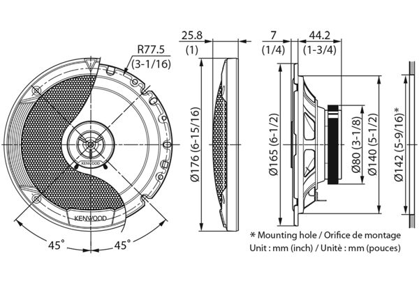 | Монтажна дълбочина на среднебасовия говорителМонтажната дълбочина на говорителя се измерва от най-долния ръб на магнита до долния ръб на металния, пластмасов или отлят кош/корпус на говорителя, т.е. до опорната повърхност на говорителя. | 44,2 mm |