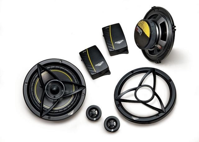 | Тип на високоговорителитеКоаксиални високоговорители: Коаксиалните високоговорители се характеризират с конструкция, наречена всичко в едно. Високочестотният и среднобасовият говорител са в един и същ кош. Предимството е по-лесен монтаж, но поради свързването или близостта на честотните диапазони в един говорител обикновено се понижава качеството на звука. Обикновено в центъра на среднобасовия говорител се намира високочестотният говорител, чиито звукова бобина работи във втората въздушна междина на общия магнитен кръг. Коаксиален говорител с три честотни диапазона се състои от среднобасов говорител, отпред на специален носач е поставен средночестотният говорител и отделен високочестотен. Компонентни високоговорители: Компонентните високоговорители се отличават с разделянето на отделни честотни диапазони: високочестотен + среднобасов + евентуално басов диапазон. Отделните говорители могат да бъдат разположени напълно отделно, което води до по-добро звуково и акустично представяне. В огромното мнозинство от случаите при компонентните високоговорители се доставя и външна кросоувърна мрежа, която разделя високите, средните/среднобасовите и при системи с три честотни диапазона и басовите честоти, както и позволява настройване на нивото в децибели на високочестотния говорител (напр. +2 dB, 0 dB, -2 dB), стръмността (напр. 6 dB/октава, 12 dB/октава) или активно/bi-amp свързване. | компонентни двулентови |