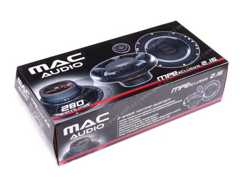 Предимството на 2-лентовата компонентна система MPE 2.16 е инжектираната полипропиленова мембрана с усилено подсилване на ръбовете. Това ефективно елиминира неприятните частични вибрации и създава естествено звучене. Високочестотният говорител е покрит с алуминиево покритие, има качествен гумен окачващ пръстен и с помощта на системата Klippel е оптимизирана производителността и магнитното поле на говорителя. В комплекта е включена дизайнерска пластмасова защитна решетка с гравирано лого Mac Audio. Говорителите Mac Audio, които са създадени за дълъг живот и издръжливост!