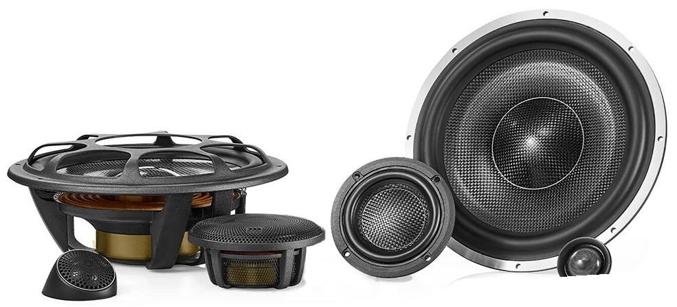 | Тип на високоговорителитеКоаксиални високоговорители: Коаксиалните високоговорители се характеризират с конструкция, наречена всичко в едно. Високочестотният и среднобасовият говорител са в един и същ кош. Предимството е по-лесен монтаж, но поради свързването или близостта на честотните диапазони в един говорител обикновено се понижава качеството на звука. Обикновено в центъра на среднобасовия говорител се намира високочестотният говорител, чиито звукова бобина работи във втората въздушна междина на общия магнитен кръг. Коаксиален говорител с три честотни диапазона се състои от среднобасов говорител, отпред на специален носач е поставен средночестотният говорител и отделен високочестотен. Компонентни високоговорители: Компонентните високоговорители се отличават с разделянето на отделни честотни диапазони: високочестотен + среднобасов + евентуално басов диапазон. Отделните говорители могат да бъдат разположени напълно отделно, което води до по-добро звуково и акустично представяне. В огромното мнозинство от случаите при компонентните високоговорители се доставя и външна кросоувърна мрежа, която разделя високите, средните/среднобасовите и при системи с три честотни диапазона и басовите честоти, както и позволява настройване на нивото в децибели на високочестотния говорител (напр. +2 dB, 0 dB, -2 dB), стръмността (напр. 6 dB/октава, 12 dB/октава) или активно/bi-amp свързване. | Компонентен 3-пътен |
