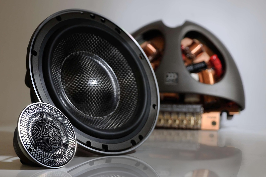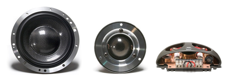 | Тип на високоговорителитеКоаксиални високоговорители: Коаксиалните високоговорители се характеризират с конструкция, наречена всичко в едно. Високочестотният и среднобасовият говорител са в един и същ кош. Предимството е по-лесен монтаж, но поради свързването или близостта на честотните диапазони в един говорител обикновено се понижава качеството на звука. Обикновено в центъра на среднобасовия говорител се намира високочестотният говорител, чиито звукова бобина работи във втората въздушна междина на общия магнитен кръг. Коаксиален говорител с три честотни диапазона се състои от среднобасов говорител, отпред на специален носач е поставен средночестотният говорител и отделен високочестотен. Компонентни високоговорители: Компонентните високоговорители се отличават с разделянето на отделни честотни диапазони: високочестотен + среднобасов + евентуално басов диапазон. Отделните говорители могат да бъдат разположени напълно отделно, което води до по-добро звуково и акустично представяне. В огромното мнозинство от случаите при компонентните високоговорители се доставя и външна кросоувърна мрежа, която разделя високите, средните/среднобасовите и при системи с три честотни диапазона и басовите честоти, както и позволява настройване на нивото в децибели на високочестотния говорител (напр. +2 dB, 0 dB, -2 dB), стръмността (напр. 6 dB/октава, 12 dB/октава) или активно/bi-amp свързване. | Компонентни 2-лентови |
