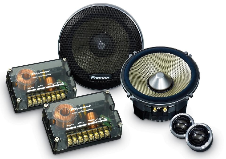 | Тип на високоговорителитеКоаксиални високоговорители: Коаксиалните високоговорители се характеризират с конструкция, наречена всичко в едно. Високочестотният и среднобасовият говорител са в един и същ кош. Предимството е по-лесен монтаж, но поради свързването или близостта на честотните диапазони в един говорител обикновено се понижава качеството на звука. Обикновено в центъра на среднобасовия говорител се намира високочестотният говорител, чиито звукова бобина работи във втората въздушна междина на общия магнитен кръг. Коаксиален говорител с три честотни диапазона се състои от среднобасов говорител, отпред на специален носач е поставен средночестотният говорител и отделен високочестотен. Компонентни високоговорители: Компонентните високоговорители се отличават с разделянето на отделни честотни диапазони: високочестотен + среднобасов + евентуално басов диапазон. Отделните говорители могат да бъдат разположени напълно отделно, което води до по-добро звуково и акустично представяне. В огромното мнозинство от случаите при компонентните високоговорители се доставя и външна кросоувърна мрежа, която разделя високите, средните/среднобасовите и при системи с три честотни диапазона и басовите честоти, както и позволява настройване на нивото в децибели на високочестотния говорител (напр. +2 dB, 0 dB, -2 dB), стръмността (напр. 6 dB/октава, 12 dB/октава) или активно/bi-amp свързване. | компонентни двулентови |