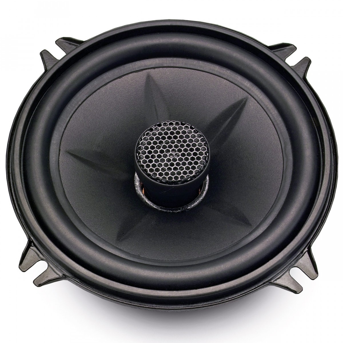 | Тип на високоговорителитеКоаксиални високоговорители: Коаксиалните високоговорители се характеризират с конструкция, наречена всичко в едно. Високочестотният и среднобасовият говорител са в един и същ кош. Предимството е по-лесен монтаж, но поради свързването или близостта на честотните диапазони в един говорител обикновено се понижава качеството на звука. Обикновено в центъра на среднобасовия говорител се намира високочестотният говорител, чиито звукова бобина работи във втората въздушна междина на общия магнитен кръг. Коаксиален говорител с три честотни диапазона се състои от среднобасов говорител, отпред на специален носач е поставен средночестотният говорител и отделен високочестотен. Компонентни високоговорители: Компонентните високоговорители се отличават с разделянето на отделни честотни диапазони: високочестотен + среднобасов + евентуално басов диапазон. Отделните говорители могат да бъдат разположени напълно отделно, което води до по-добро звуково и акустично представяне. В огромното мнозинство от случаите при компонентните високоговорители се доставя и външна кросоувърна мрежа, която разделя високите, средните/среднобасовите и при системи с три честотни диапазона и басовите честоти, както и позволява настройване на нивото в децибели на високочестотния говорител (напр. +2 dB, 0 dB, -2 dB), стръмността (напр. 6 dB/октава, 12 dB/октава) или активно/bi-amp свързване. | Коаксиален 2-посочен |