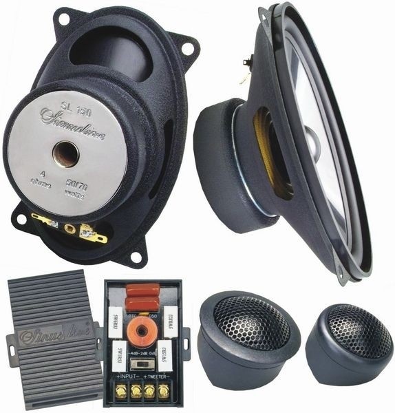 | Тип на високоговорителитеКоаксиални високоговорители: Коаксиалните високоговорители се характеризират с конструкция, наречена всичко в едно. Високочестотният и среднобасовият говорител са в един и същ кош. Предимството е по-лесен монтаж, но поради свързването или близостта на честотните диапазони в един говорител обикновено се понижава качеството на звука. Обикновено в центъра на среднобасовия говорител се намира високочестотният говорител, чиито звукова бобина работи във втората въздушна междина на общия магнитен кръг. Коаксиален говорител с три честотни диапазона се състои от среднобасов говорител, отпред на специален носач е поставен средночестотният говорител и отделен високочестотен. Компонентни високоговорители: Компонентните високоговорители се отличават с разделянето на отделни честотни диапазони: високочестотен + среднобасов + евентуално басов диапазон. Отделните говорители могат да бъдат разположени напълно отделно, което води до по-добро звуково и акустично представяне. В огромното мнозинство от случаите при компонентните високоговорители се доставя и външна кросоувърна мрежа, която разделя високите, средните/среднобасовите и при системи с три честотни диапазона и басовите честоти, както и позволява настройване на нивото в децибели на високочестотния говорител (напр. +2 dB, 0 dB, -2 dB), стръмността (напр. 6 dB/октава, 12 dB/октава) или активно/bi-amp свързване. | компонентни 2-посочни |