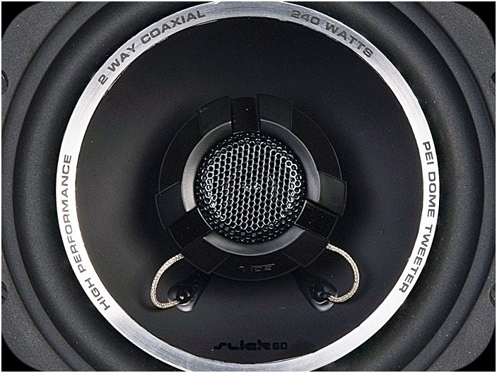 | Тип на високоговорителитеКоаксиални високоговорители: Коаксиалните високоговорители се характеризират с конструкция, наречена всичко в едно. Високочестотният и среднобасовият говорител са в един и същ кош. Предимството е по-лесен монтаж, но поради свързването или близостта на честотните диапазони в един говорител обикновено се понижава качеството на звука. Обикновено в центъра на среднобасовия говорител се намира високочестотният говорител, чиито звукова бобина работи във втората въздушна междина на общия магнитен кръг. Коаксиален говорител с три честотни диапазона се състои от среднобасов говорител, отпред на специален носач е поставен средночестотният говорител и отделен високочестотен. Компонентни високоговорители: Компонентните високоговорители се отличават с разделянето на отделни честотни диапазони: високочестотен + среднобасов + евентуално басов диапазон. Отделните говорители могат да бъдат разположени напълно отделно, което води до по-добро звуково и акустично представяне. В огромното мнозинство от случаите при компонентните високоговорители се доставя и външна кросоувърна мрежа, която разделя високите, средните/среднобасовите и при системи с три честотни диапазона и басовите честоти, както и позволява настройване на нивото в децибели на високочестотния говорител (напр. +2 dB, 0 dB, -2 dB), стръмността (напр. 6 dB/октава, 12 dB/октава) или активно/bi-amp свързване. | коаксиални 2-пътни |