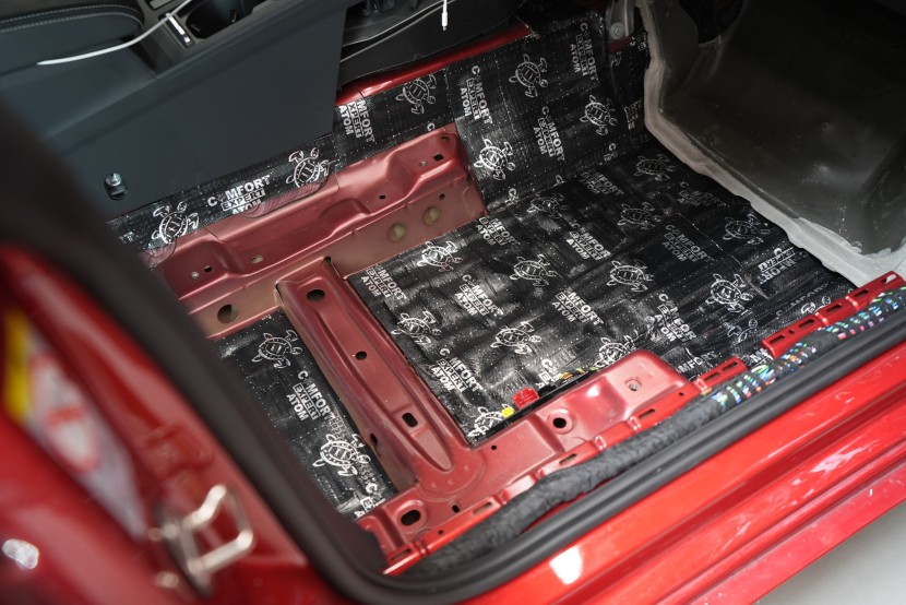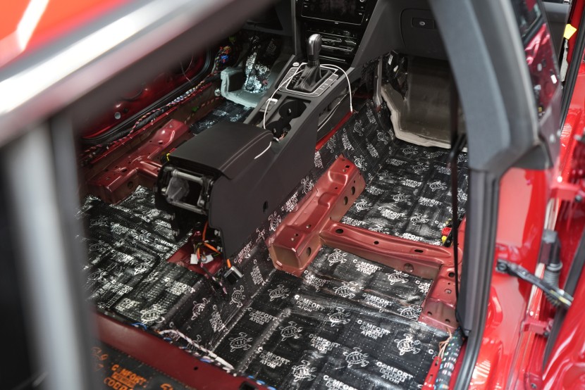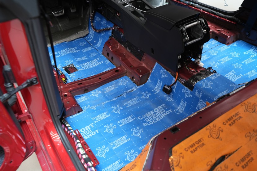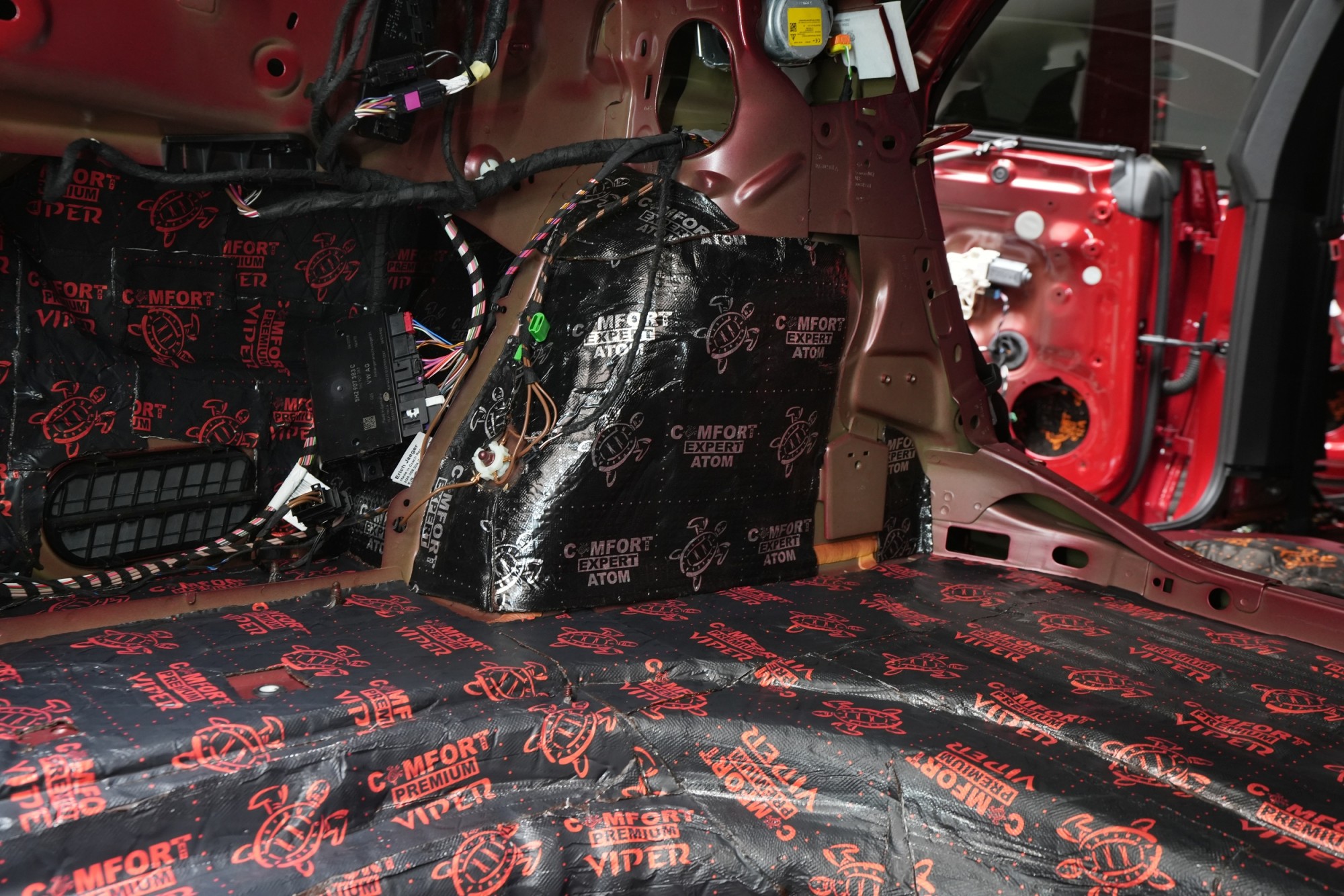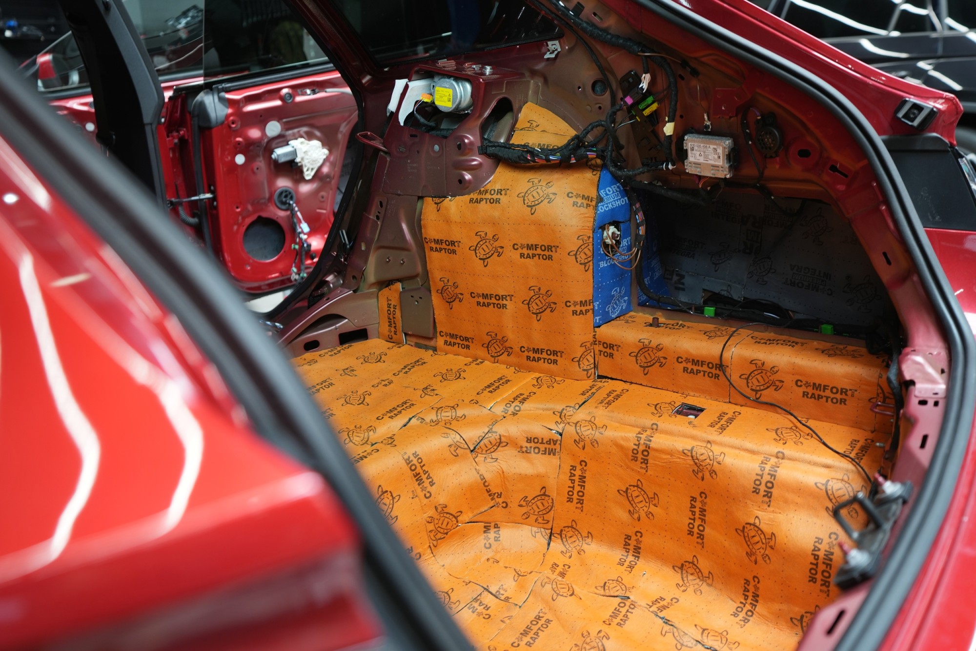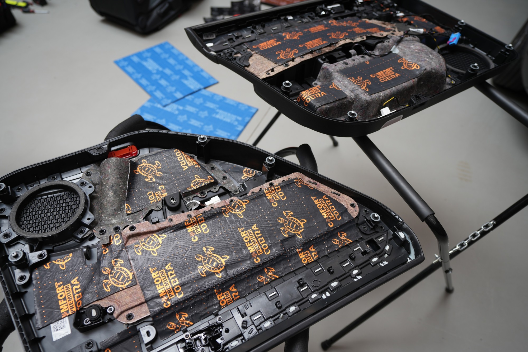 В рамките на пакета Expert, който при нас е най-обширната програма за шумоизолация, се насочихме към всички ключови зони на автомобила. Използвахме висококласни материали от най-високите серии Comfortmat Premium и Expert, които комбинират изключително ефективни антивибрационни пластове с напреднали звукоизолационни материали за потискане на шума, пренасян по въздух. При най-шумните зони, като пода и арките на колелата, са важни не само опитът, но и правилният избор на материал. Затова нанасяме антивибрационен материал с дебелина 4 mm и звукоизолационна мембранна материя със способност за намаляване на шума до 36 dB. Високо ефективните материали обаче прилагаме и върху останалите части на каросерията. Шумоизолирахме предните и задните врати, целия под включително задната част, багажното отделение, покрива, таблото и също предните арки от страната на интериора.