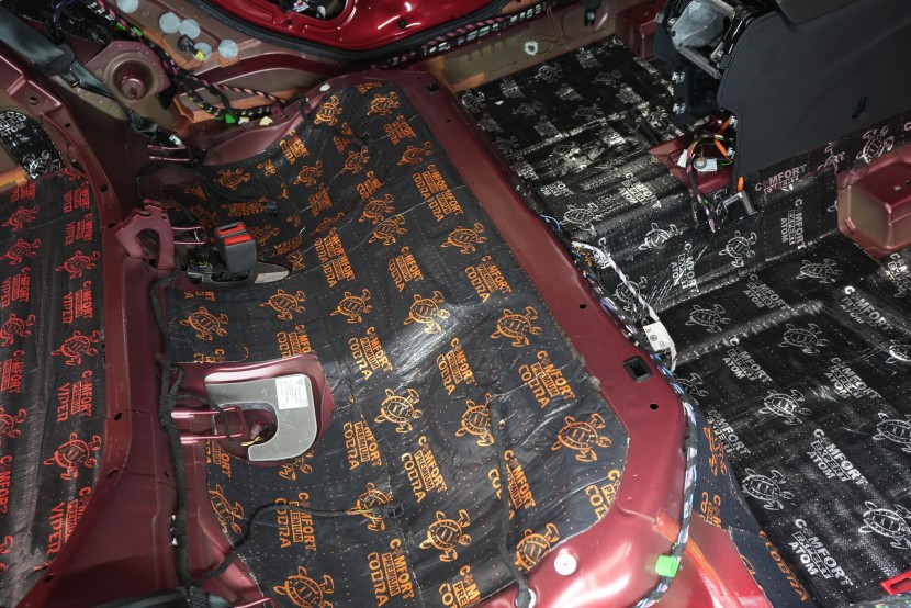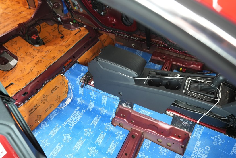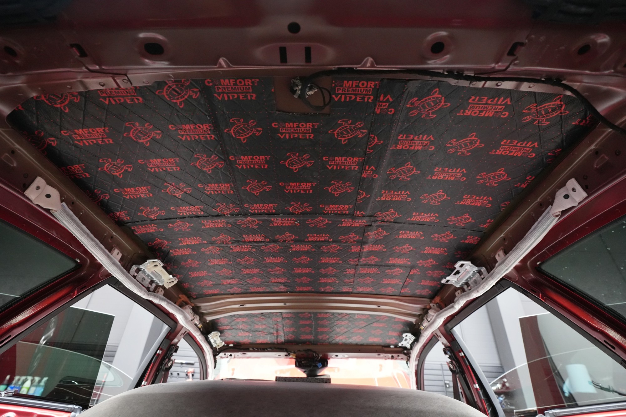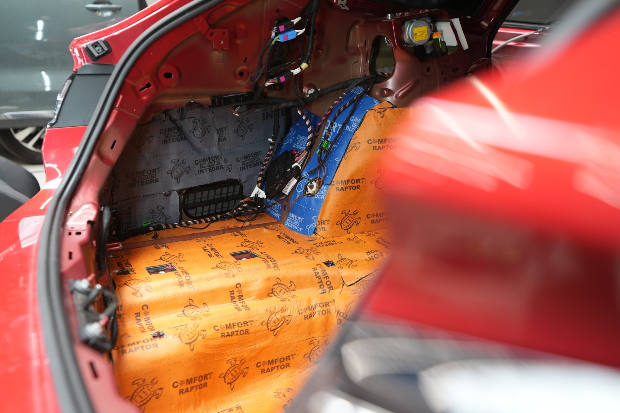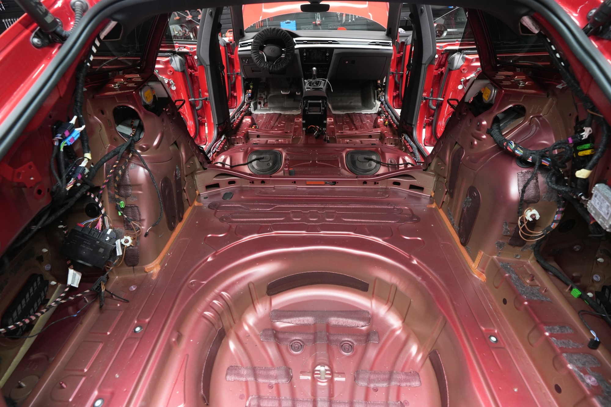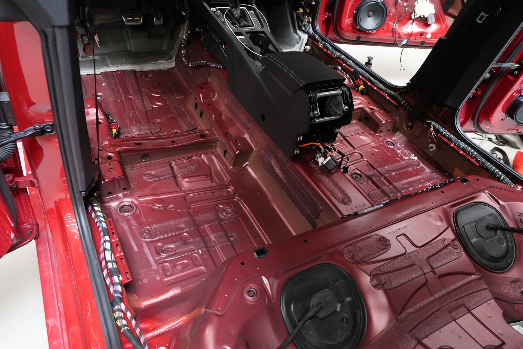 В рамките на пакета Expert, който при нас е най-обширната програма за шумоизолация, се насочихме към всички ключови зони на автомобила. Използвахме висококласни материали от най-високите серии Comfortmat Premium и Expert, които комбинират изключително ефективни антивибрационни пластове с напреднали звукоизолационни материали за потискане на шума, пренасян по въздух. При най-шумните зони, като пода и арките на колелата, са важни не само опитът, но и правилният избор на материал. Затова нанасяме антивибрационен материал с дебелина 4 mm и звукоизолационна мембранна материя със способност за намаляване на шума до 36 dB. Високо ефективните материали обаче прилагаме и върху останалите части на каросерията. Шумоизолирахме предните и задните врати, целия под включително задната част, багажното отделение, покрива, таблото и също предните арки от страната на интериора.