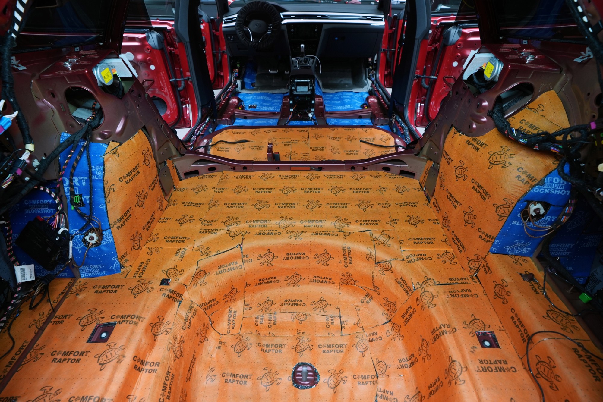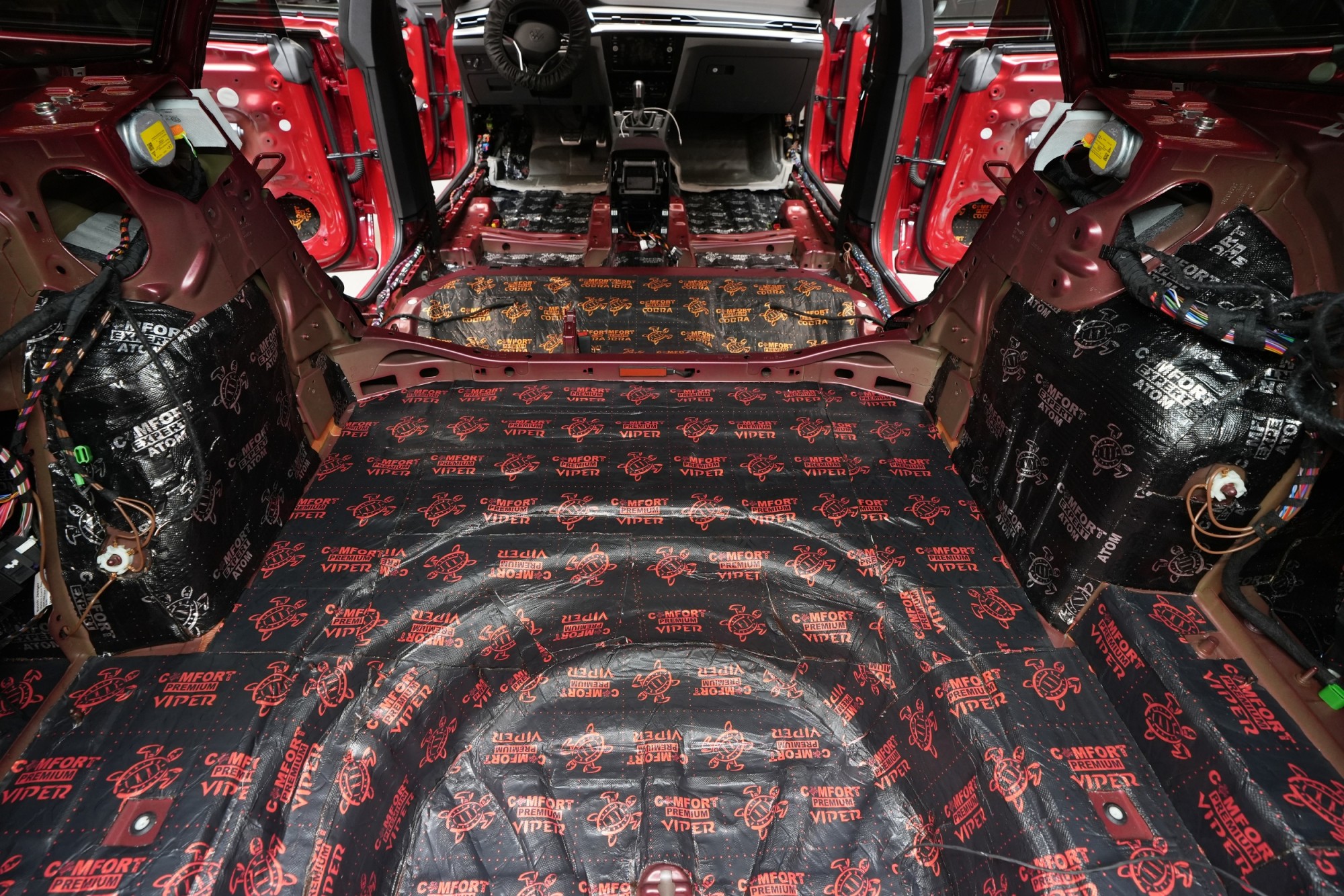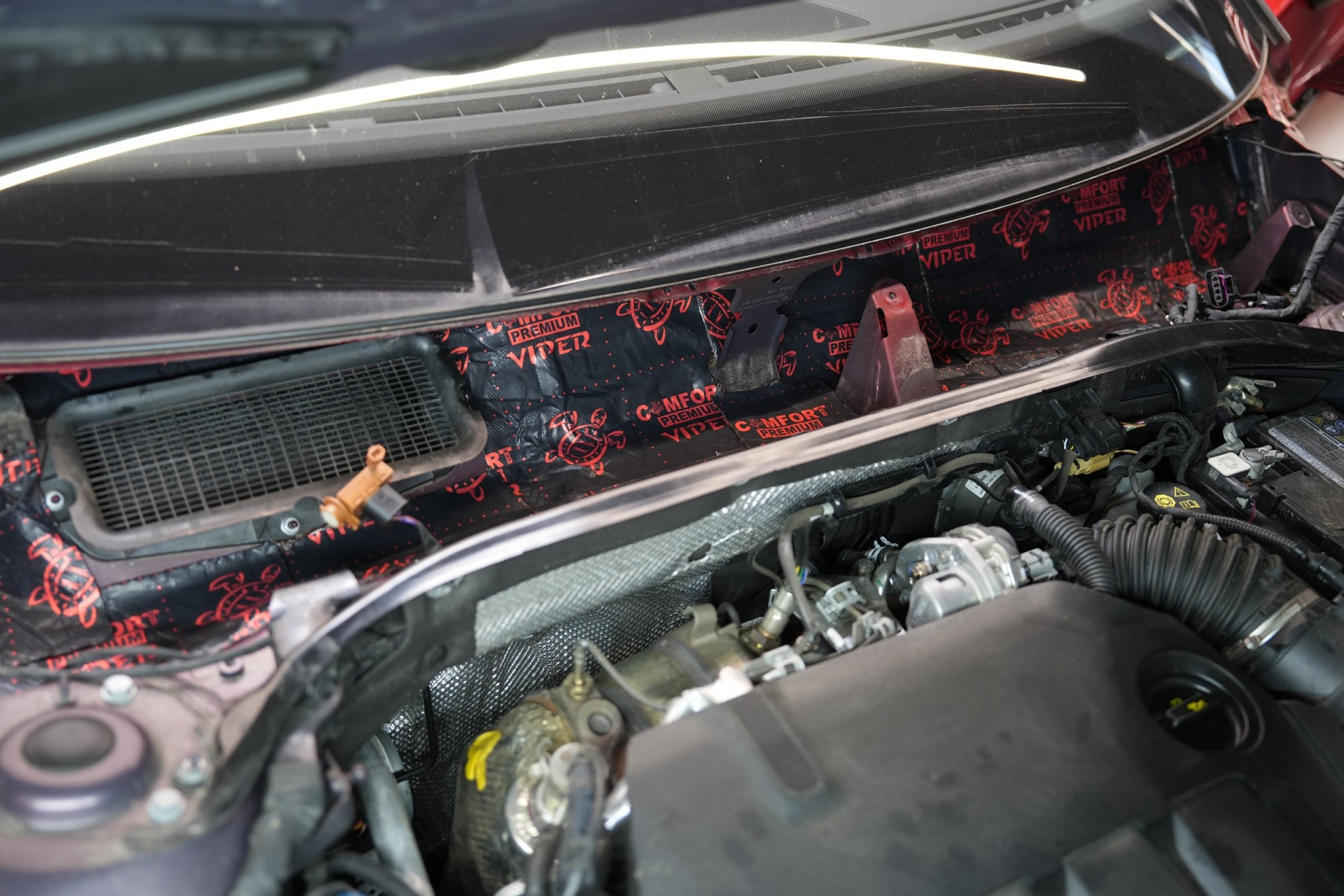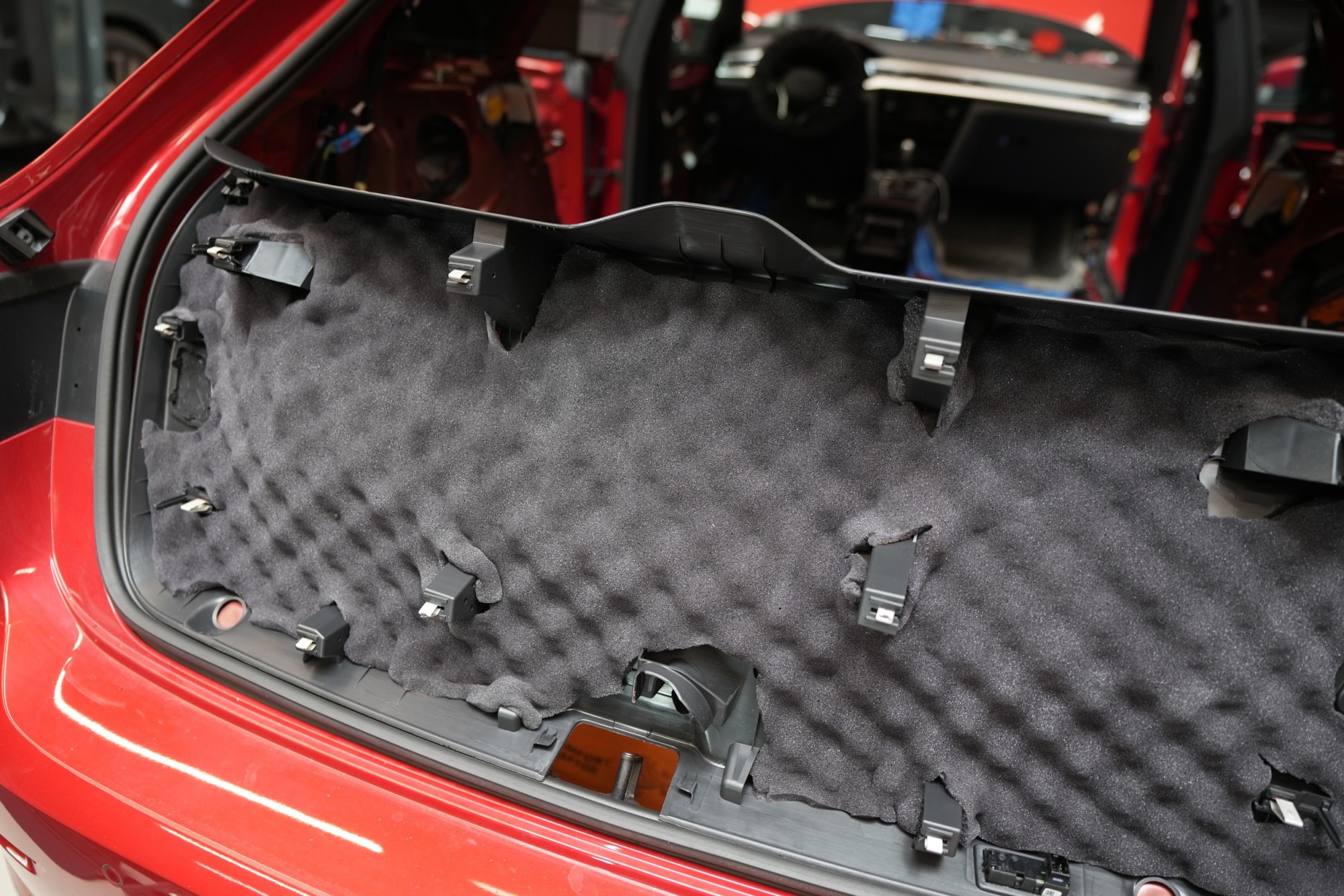 В рамките на пакета Expert, който при нас е най-обширната програма за шумоизолация, се насочихме към всички ключови зони на автомобила. Използвахме висококласни материали от най-високите серии Comfortmat Premium и Expert, които комбинират изключително ефективни антивибрационни пластове с напреднали звукоизолационни материали за потискане на шума, пренасян по въздух. При най-шумните зони, като пода и арките на колелата, са важни не само опитът, но и правилният избор на материал. Затова нанасяме антивибрационен материал с дебелина 4 mm и звукоизолационна мембранна материя със способност за намаляване на шума до 36 dB. Високо ефективните материали обаче прилагаме и върху останалите части на каросерията. Шумоизолирахме предните и задните врати, целия под включително задната част, багажното отделение, покрива, таблото и също предните арки от страната на интериора.