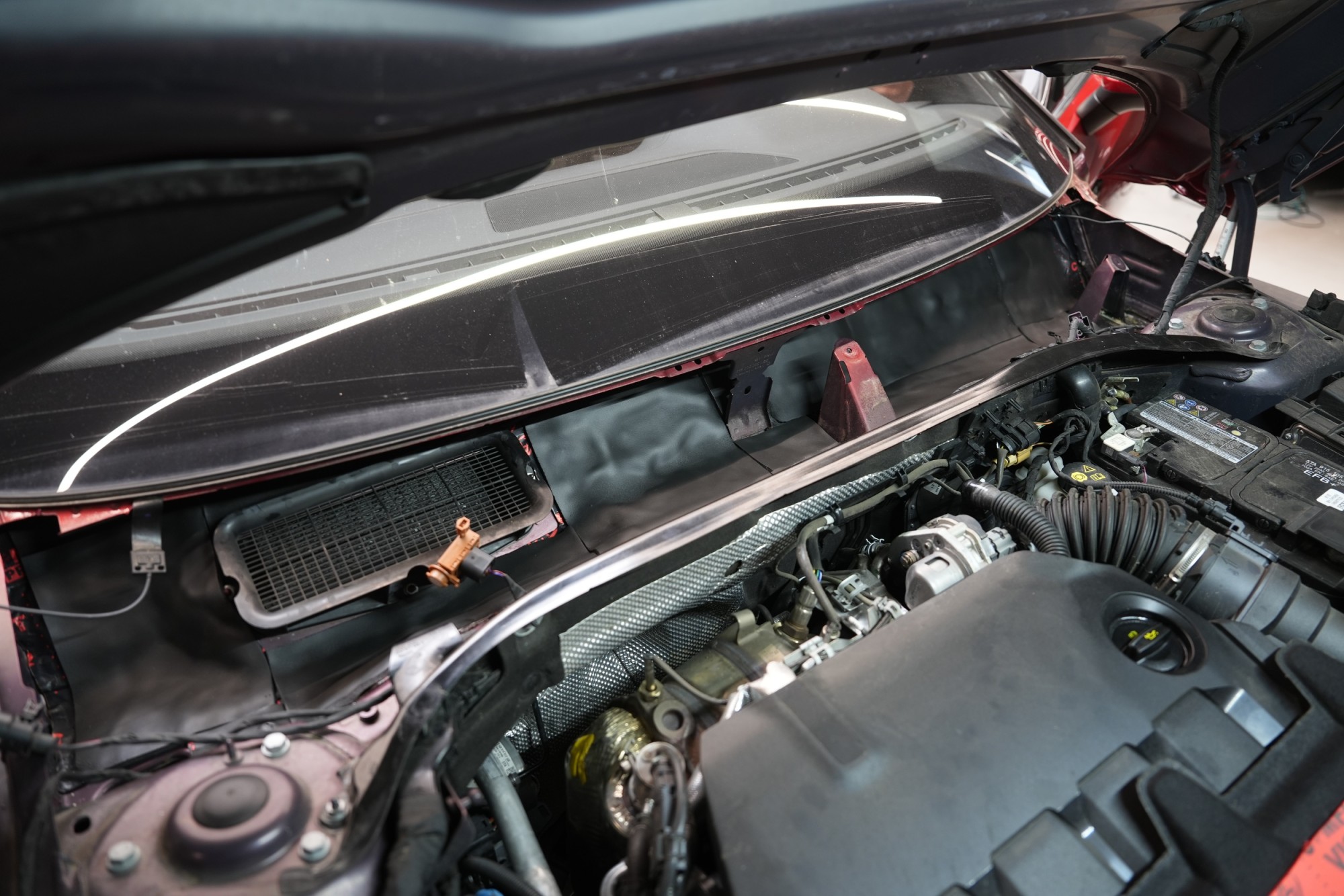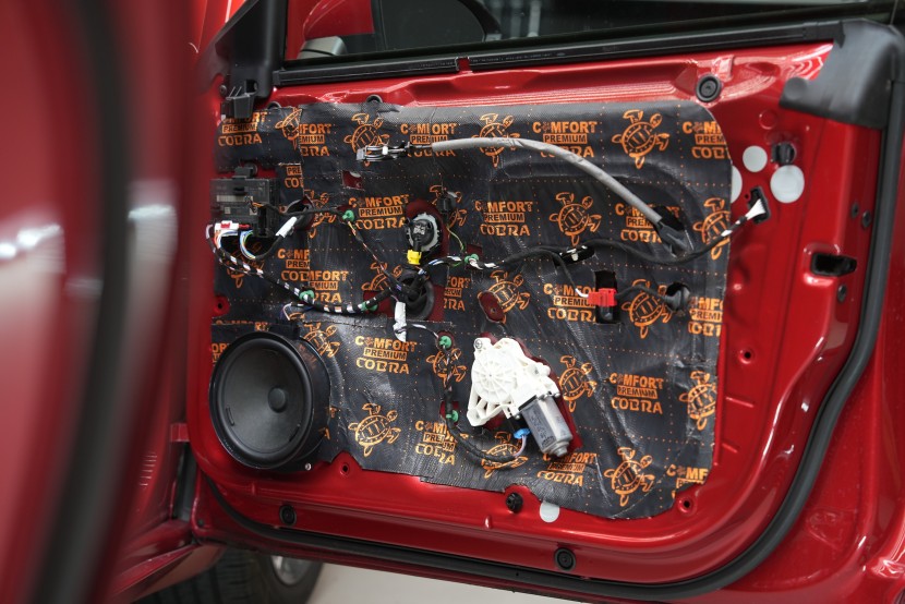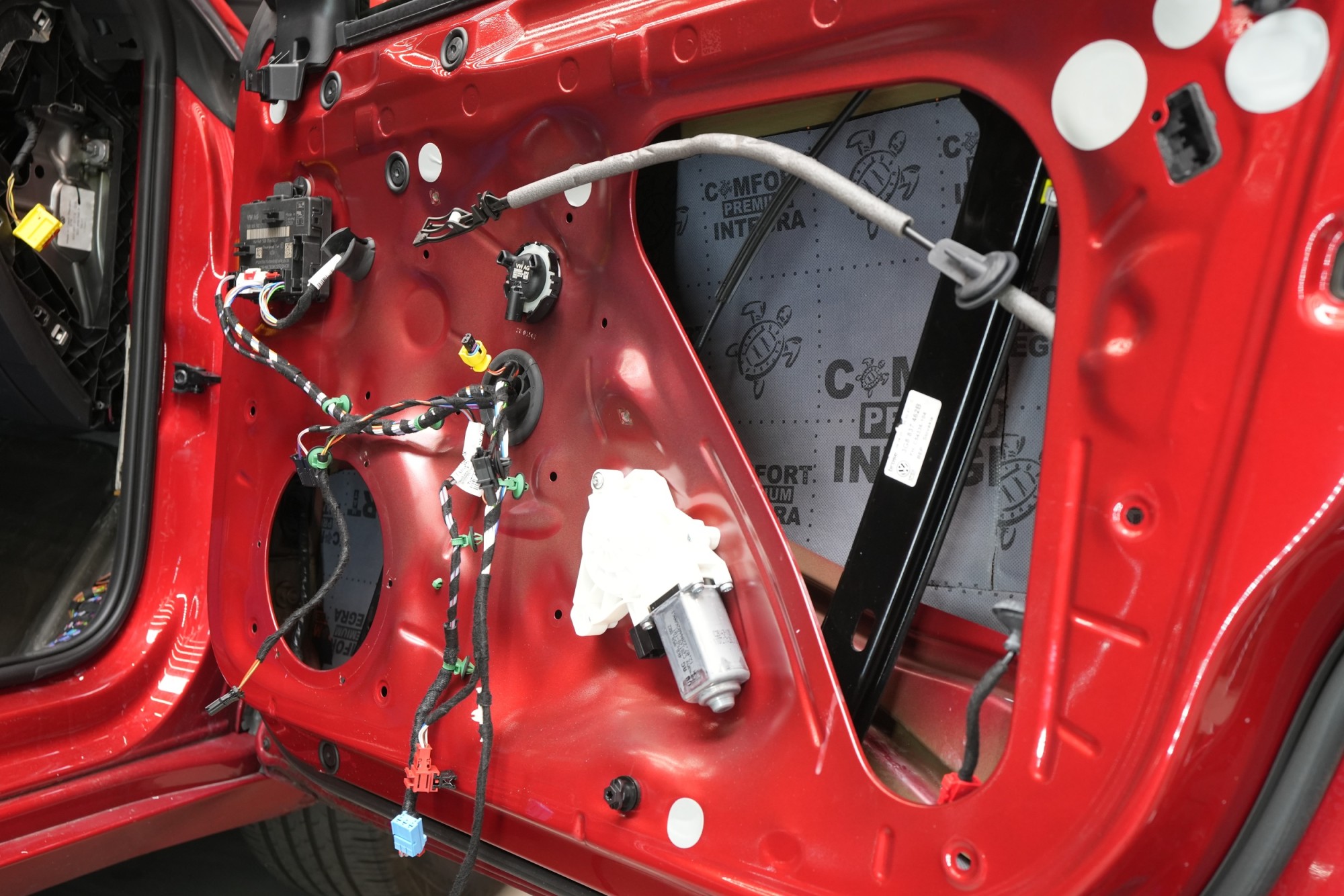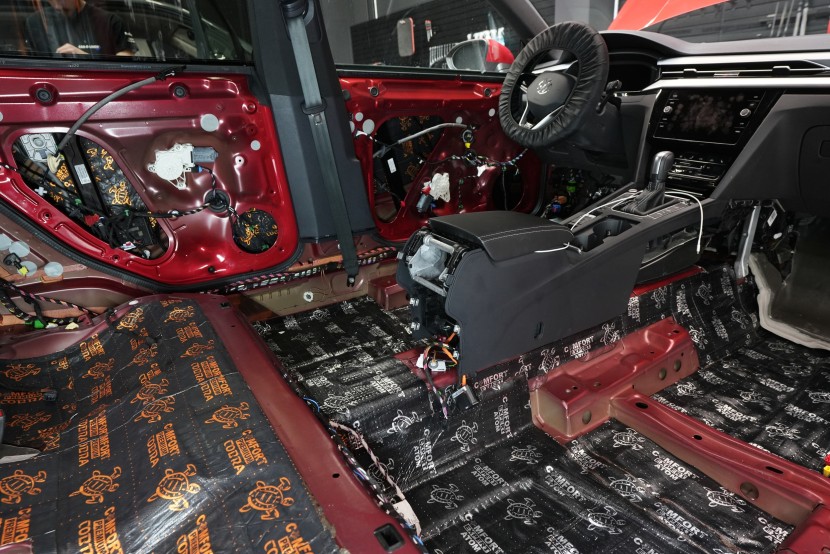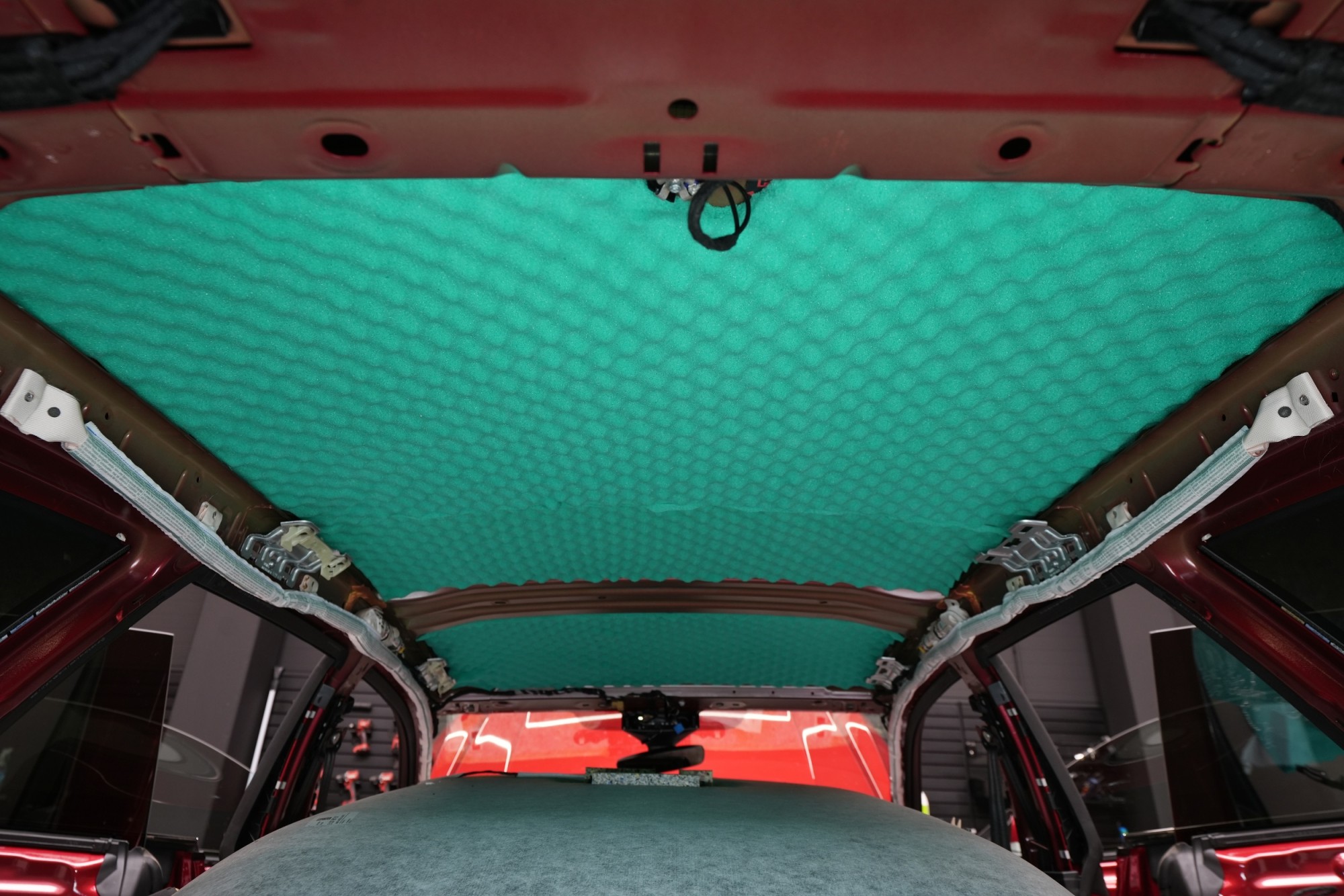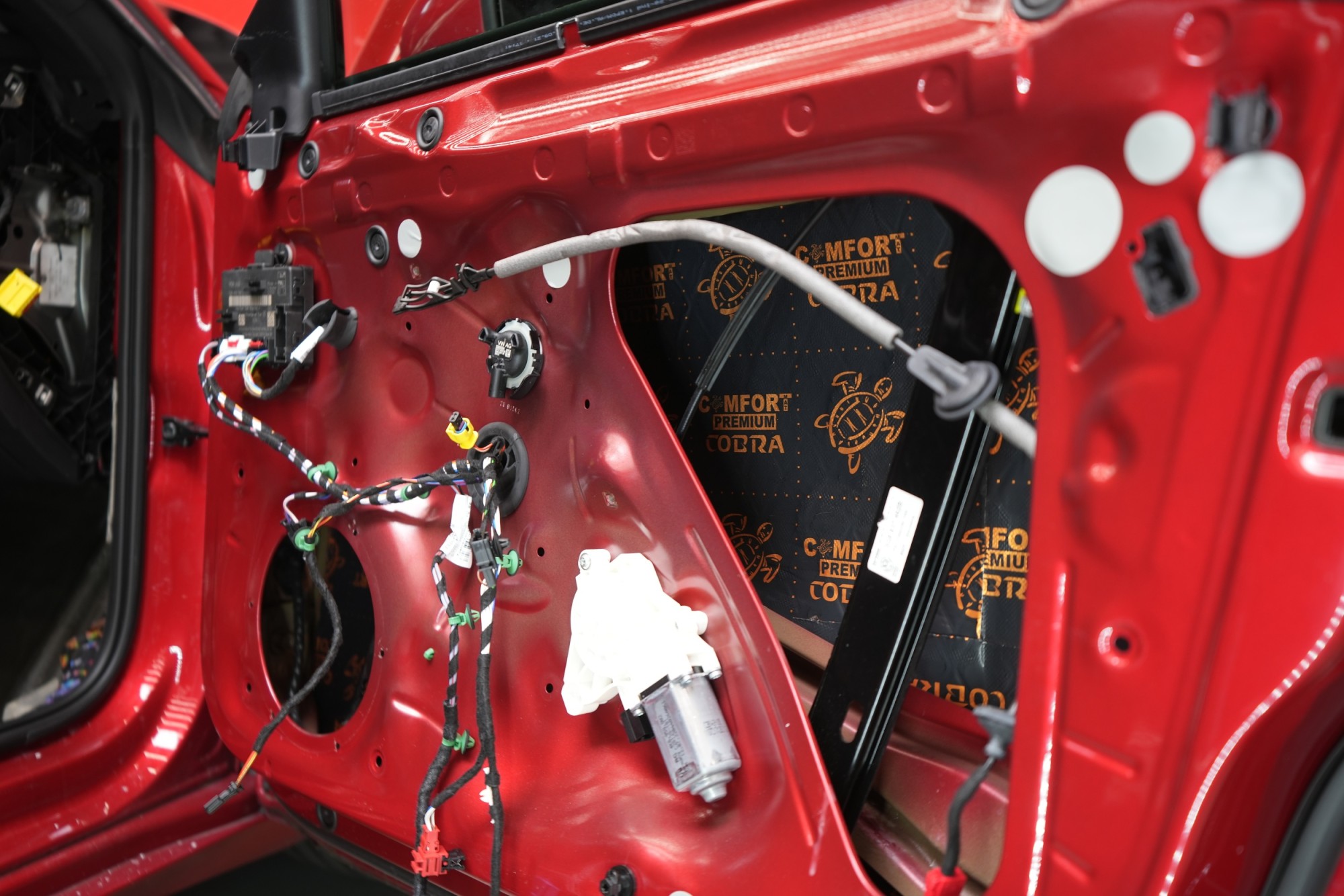 В рамките на пакета Expert, който при нас е най-обширната програма за шумоизолация, се насочихме към всички ключови зони на автомобила. Използвахме висококласни материали от най-високите серии Comfortmat Premium и Expert, които комбинират изключително ефективни антивибрационни пластове с напреднали звукоизолационни материали за потискане на шума, пренасян по въздух. При най-шумните зони, като пода и арките на колелата, са важни не само опитът, но и правилният избор на материал. Затова нанасяме антивибрационен материал с дебелина 4 mm и звукоизолационна мембранна материя със способност за намаляване на шума до 36 dB. Високо ефективните материали обаче прилагаме и върху останалите части на каросерията. Шумоизолирахме предните и задните врати, целия под включително задната част, багажното отделение, покрива, таблото и също предните арки от страната на интериора.
