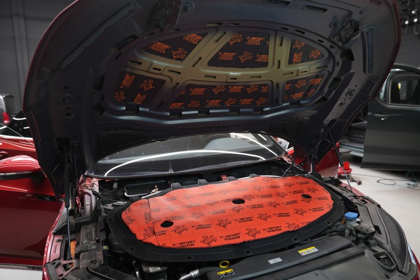 На монтажа работеха четирима наши техници и целият процес отне един работен ден. Резултатът е значително по-тихо купе и преди всичко комфортно пътуване, което отговаря на премиум амбициите на този модел. Според наши предишни измервания на шума при автомобили от този клас с материали Comfortmat постигнахме намаление на шума в интериора средно с 3,5 до 4 dB, което представлява повече от двукратно намаление спрямо фабричната звукоизолация. И това много се усеща в комфорта на интериора.