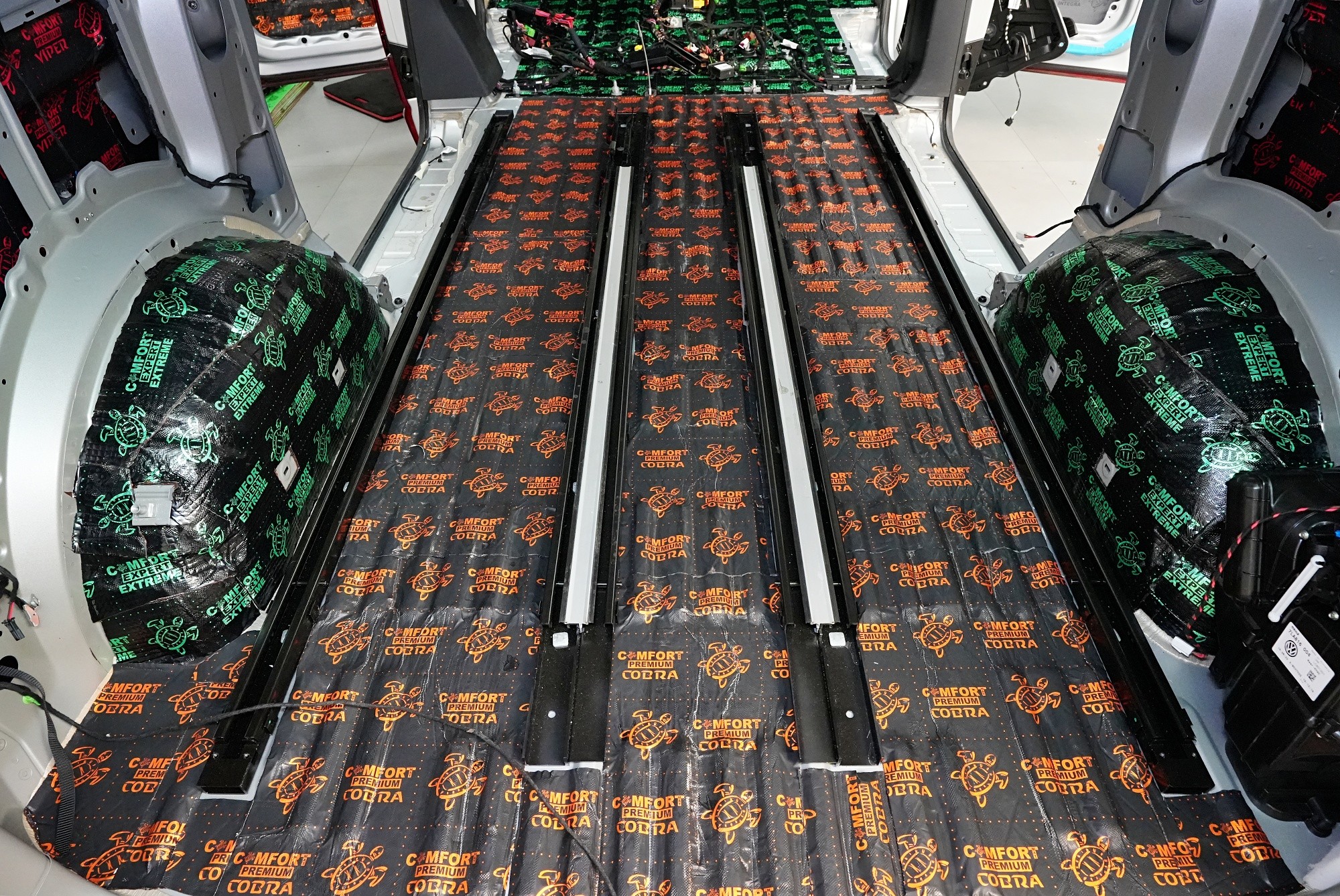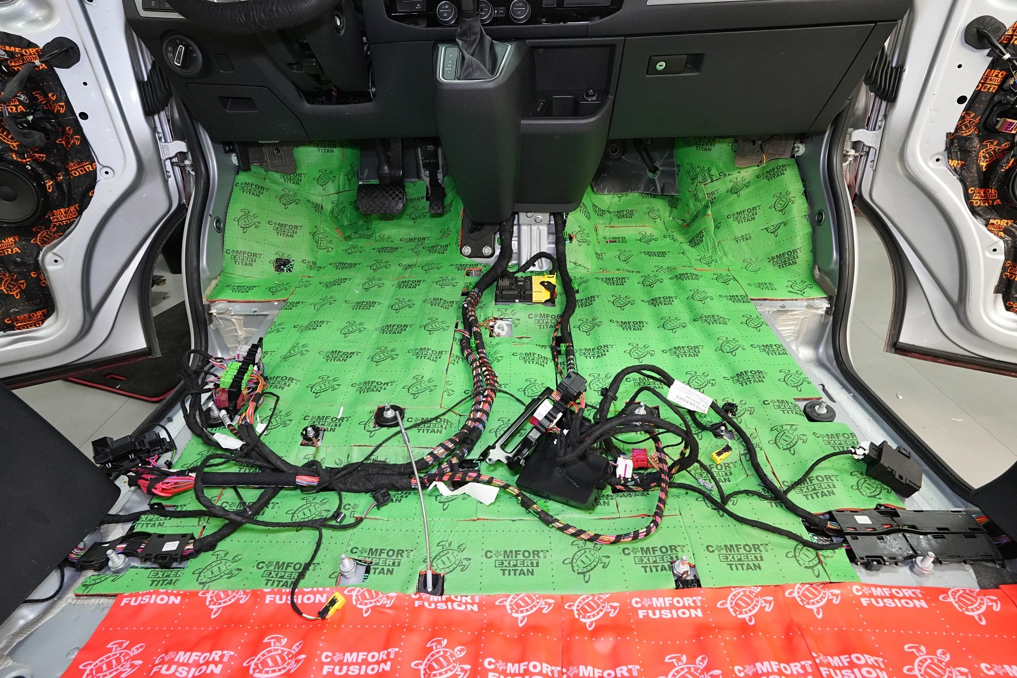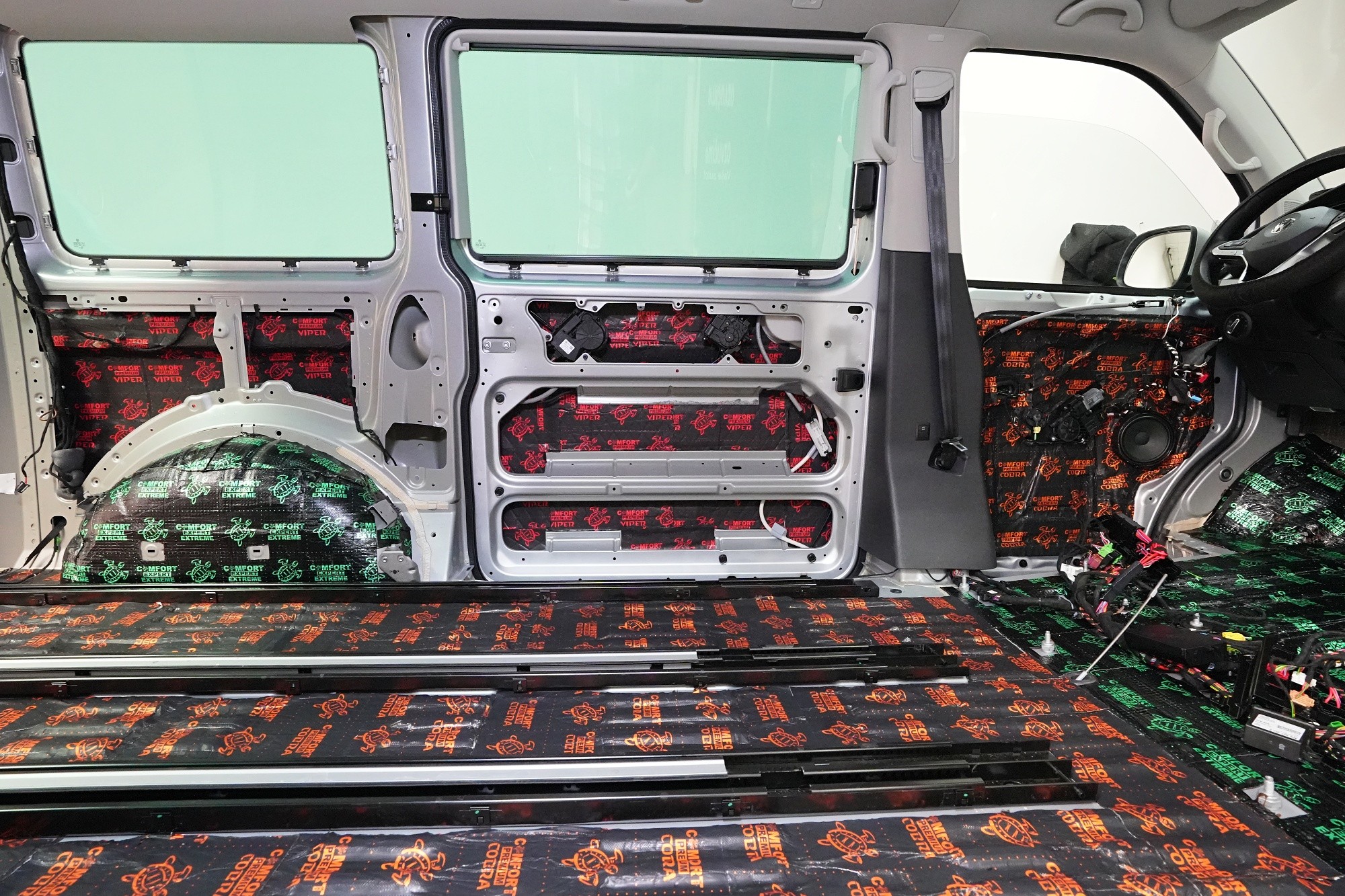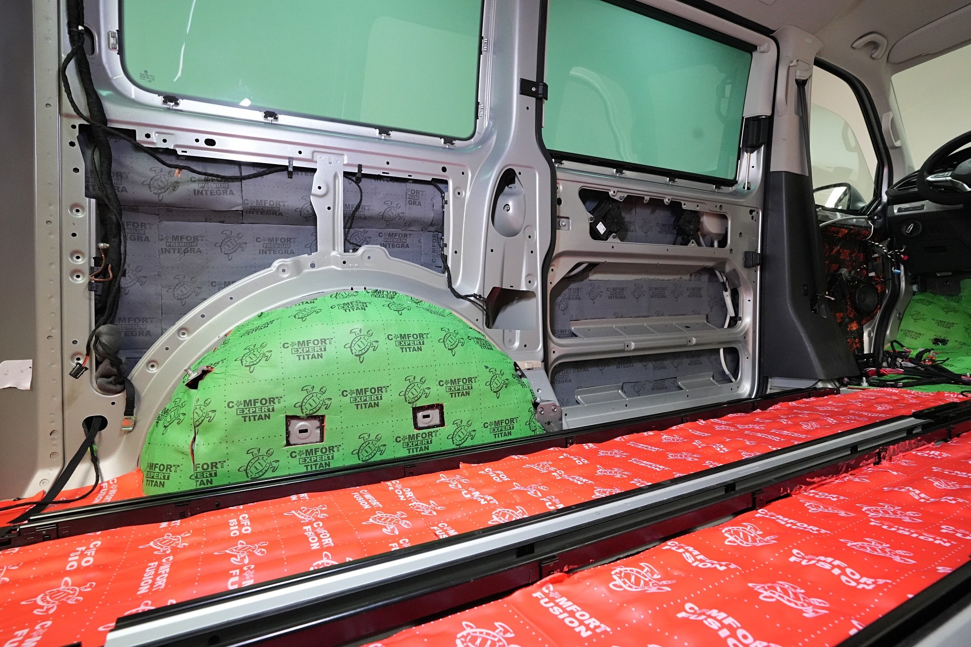 Пълна шумоизолация на автомобил Volkswagen T6. Този популярен MPV във всички поколения е, след V-класата на Mercedes, най-често шумоизолираният автомобил в нашия сервиз. И двата модела имат едно общо нещо – практически нулева фабрична изолация. Поради конструкцията на автомобила не може да се очаква нищо друго, освен много изразен шум в интериора. Най-големият проблем е аеродинамичният шум, шумът от гуми и пътя, както и шумът от двигателя, скоростната кутия и окачването на колелата. Единственото решение е автомобилът да бъде шумоизолиран изцяло. Заедно със собственика избрахме нашия най-ефективен пакет шумоизолация Expert Plus, който включва всички важни зони на автомобила. Конкретно се насочихме към предни, плъзгащи и пета врата, пода, покрива, страни, предни и задни подкалници, торпедо и капак. Шумоизолираме, разбира се, и повечето пластмасови части в интериора. При пакета Expert Plus избираме, в сравнение с класическия пакет Expert, по-ефективни и по-дебели материали и автомобилът е шумоизиран до възможния максимум. При такъв голям автомобил цената е увеличена спрямо обичайните автомобили, защото прекарахме повече време на автомобила и използвахме по-голям брой парчета материали. За шумоизолацията работят едновременно трима наши техници и монтажът се справят в рамките на 1 работен ден. Тъй като всички материали Comfortmat са и топлоизолационни, този автомобил вече е защитен от топлинни загуби и топлоизолационните свойства ще оцените не само през зимата, но и през лятото.