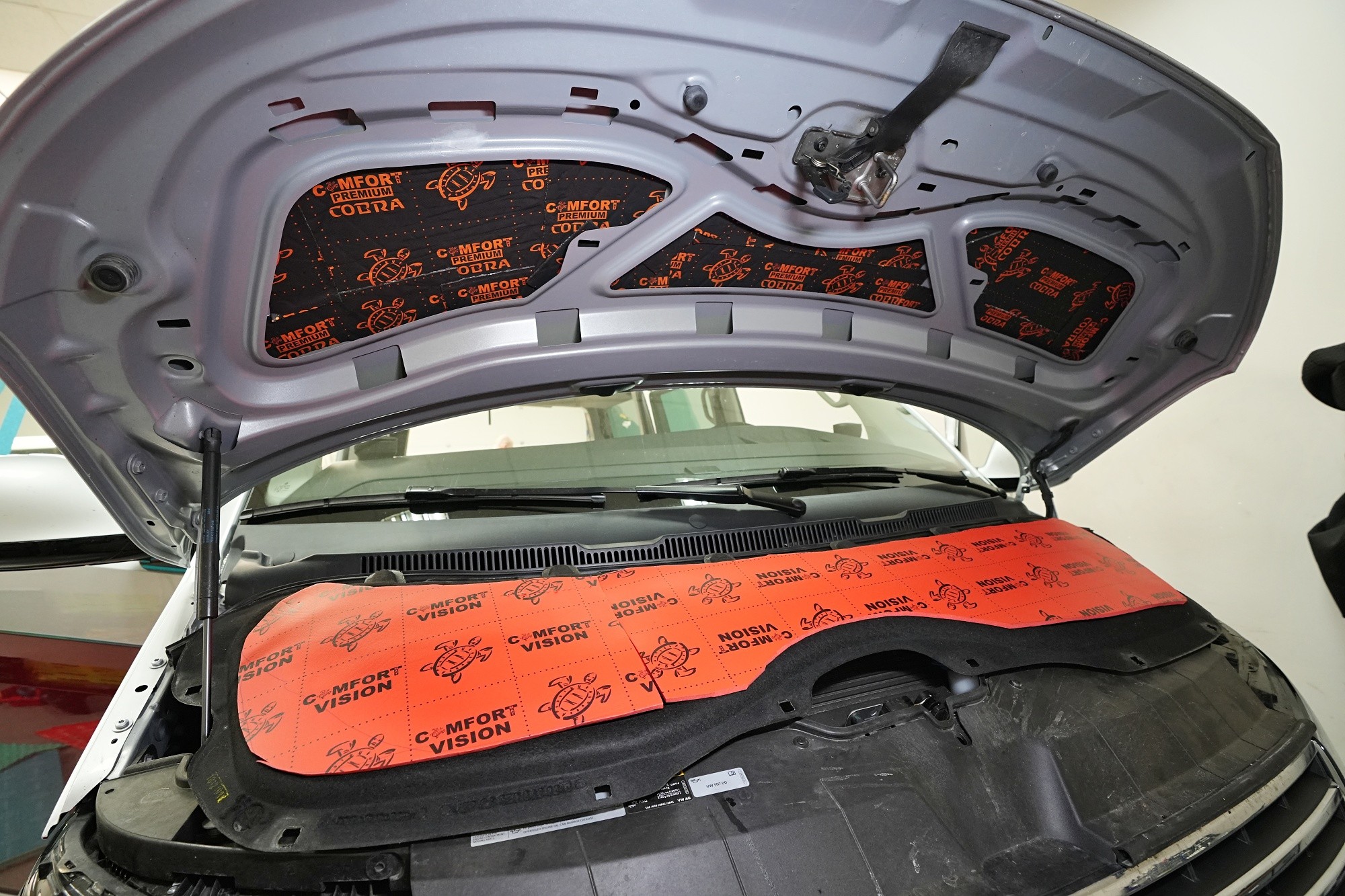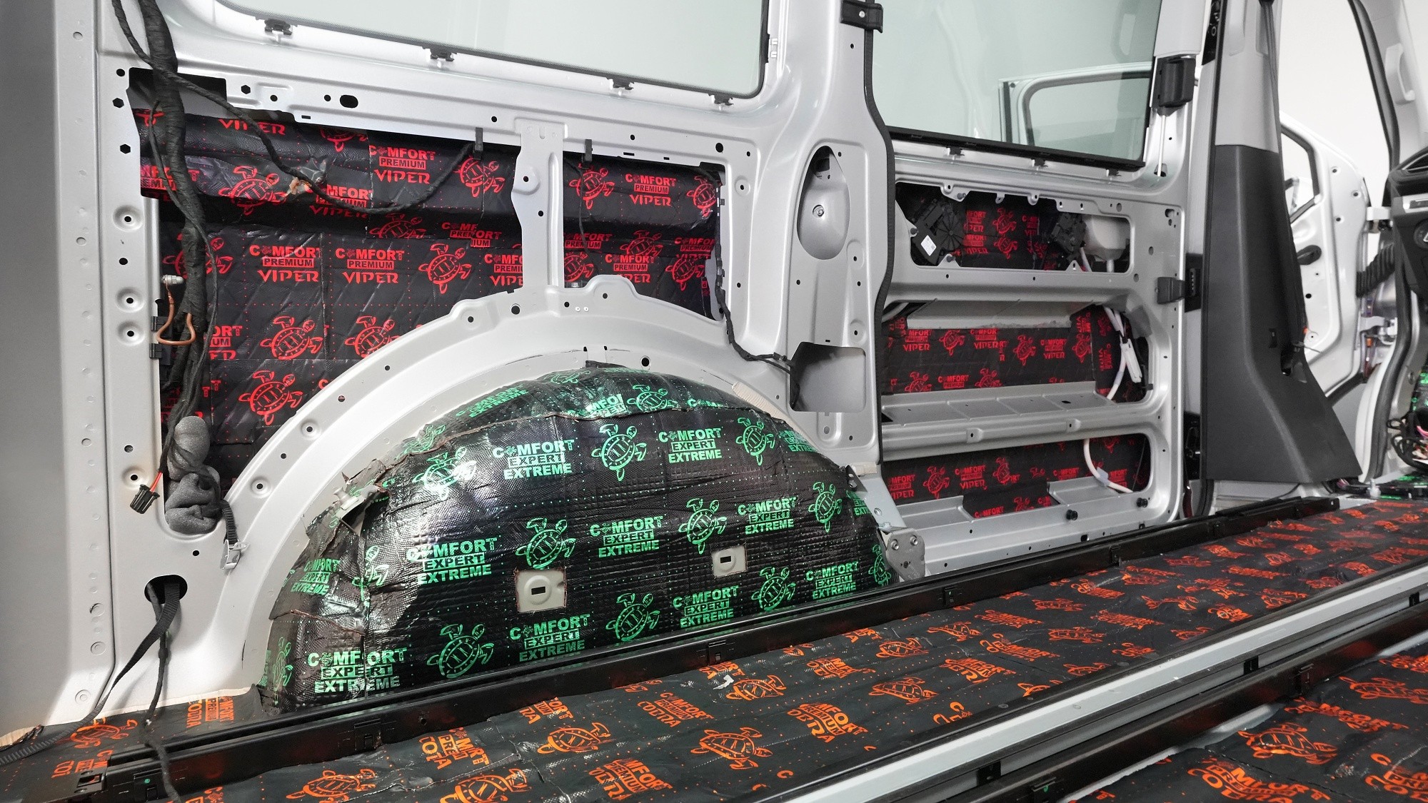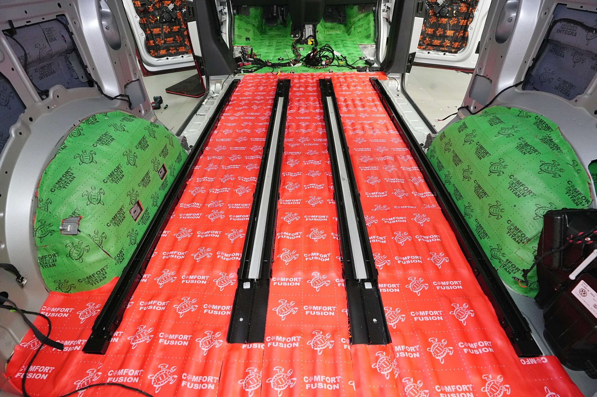 Пълна шумоизолация на автомобил Volkswagen T6. Този популярен MPV във всички поколения е, след V-класата на Mercedes, най-често шумоизолираният автомобил в нашия сервиз. И двата модела имат едно общо нещо – практически нулева фабрична изолация. Поради конструкцията на автомобила не може да се очаква нищо друго, освен много изразен шум в интериора. Най-големият проблем е аеродинамичният шум, шумът от гуми и пътя, както и шумът от двигателя, скоростната кутия и окачването на колелата. Единственото решение е автомобилът да бъде шумоизолиран изцяло. Заедно със собственика избрахме нашия най-ефективен пакет шумоизолация Expert Plus, който включва всички важни зони на автомобила. Конкретно се насочихме към предни, плъзгащи и пета врата, пода, покрива, страни, предни и задни подкалници, торпедо и капак. Шумоизолираме, разбира се, и повечето пластмасови части в интериора. При пакета Expert Plus избираме, в сравнение с класическия пакет Expert, по-ефективни и по-дебели материали и автомобилът е шумоизиран до възможния максимум. При такъв голям автомобил цената е увеличена спрямо обичайните автомобили, защото прекарахме повече време на автомобила и използвахме по-голям брой парчета материали. За шумоизолацията работят едновременно трима наши техници и монтажът се справят в рамките на 1 работен ден. Тъй като всички материали Comfortmat са и топлоизолационни, този автомобил вече е защитен от топлинни загуби и топлоизолационните свойства ще оцените не само през зимата, но и през лятото.