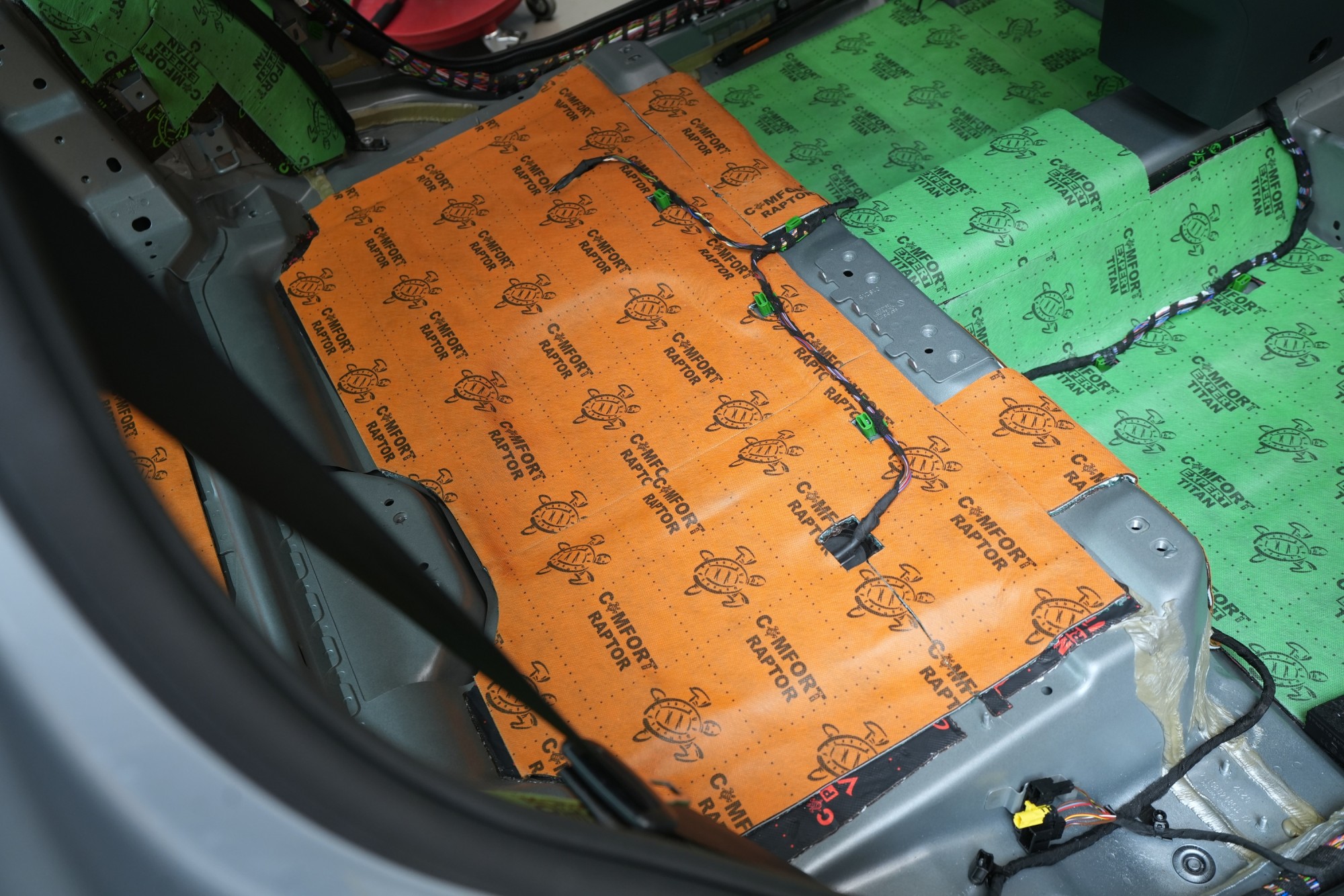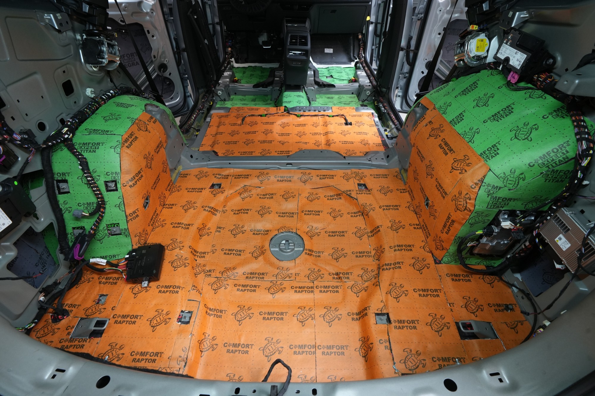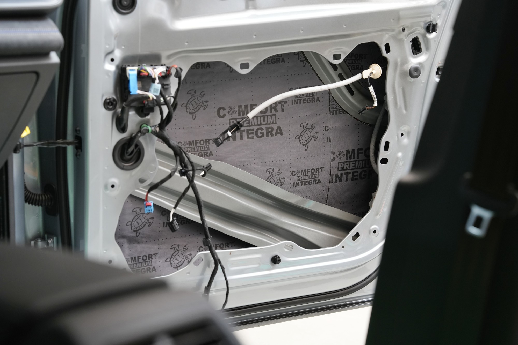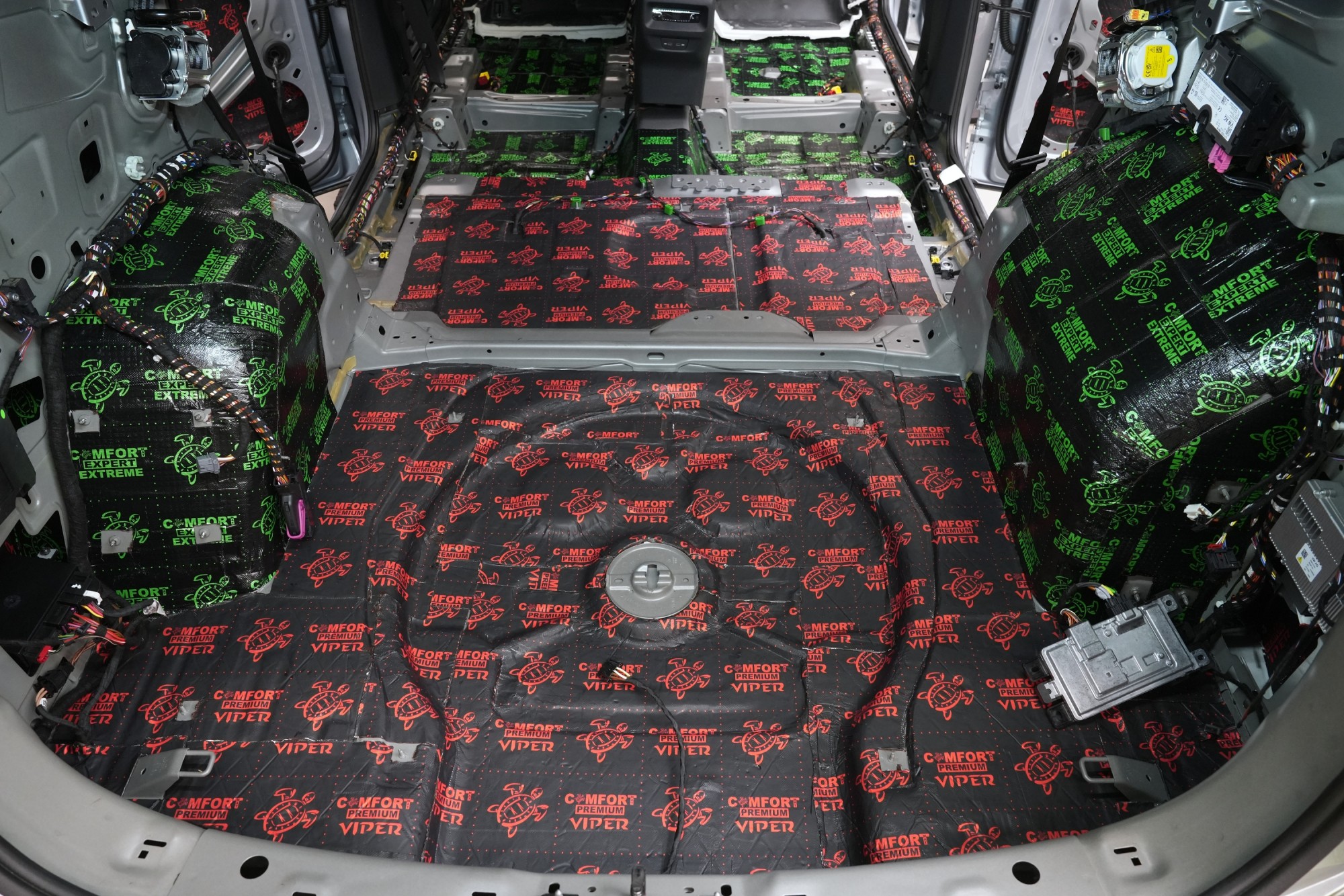 Клиентът затова избра нашия най-ефективен пакет Expert Plus, който комбинира многослойна шумоизолация с използване на висококачествени материали Comfortmat. В рамките на монтажа обработихме пода, покрива, вратите, предните и задните калници, задната част на автомобила и моторното отделение в областта на таблото. Най-голям акцент поставихме на пода и калниците, където използвахме най-мощните антивибрационни и звукоизолационни материали, които ефективно могат да елиминират нискочестотни шумове от гумите и окачването.