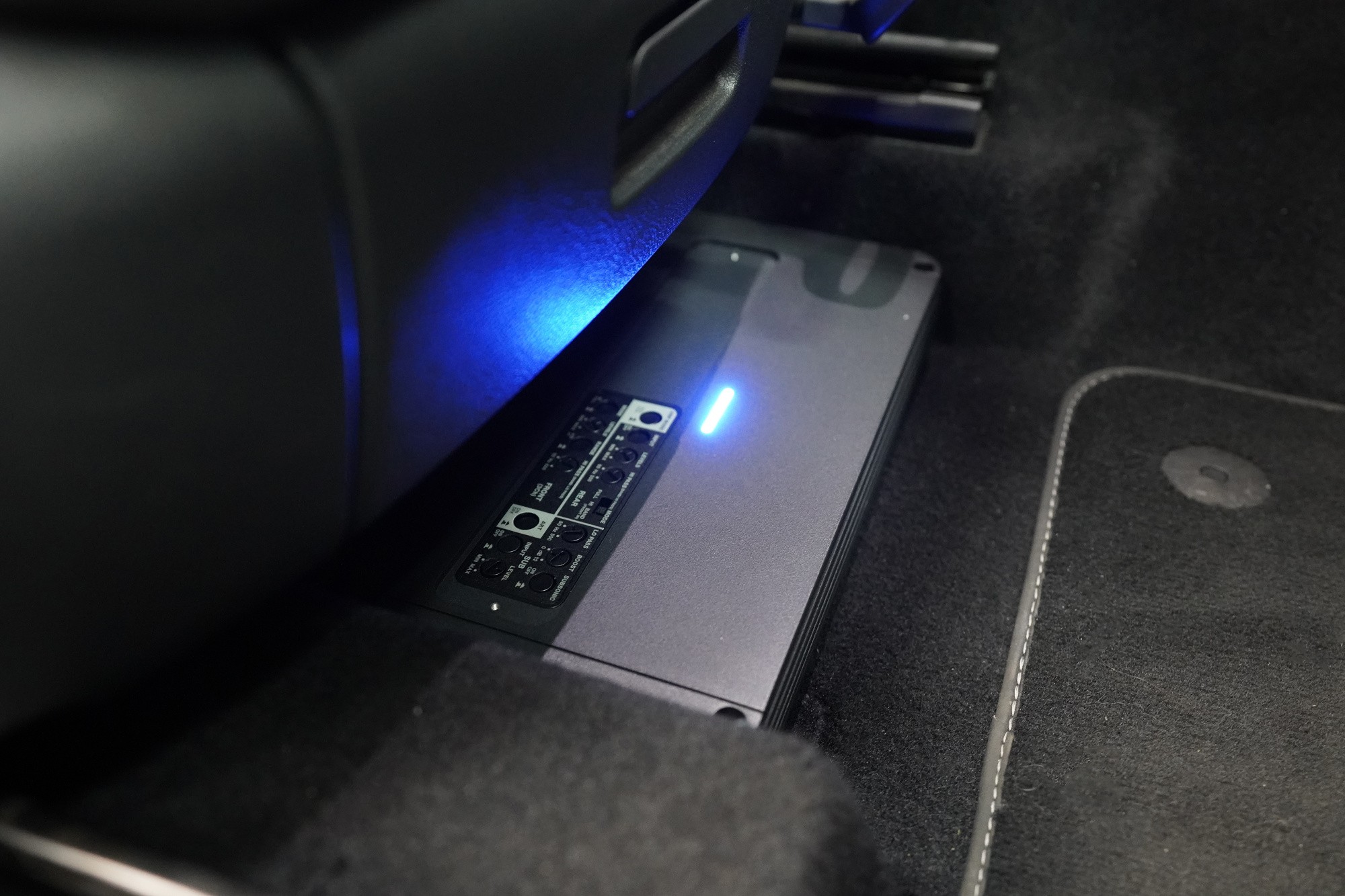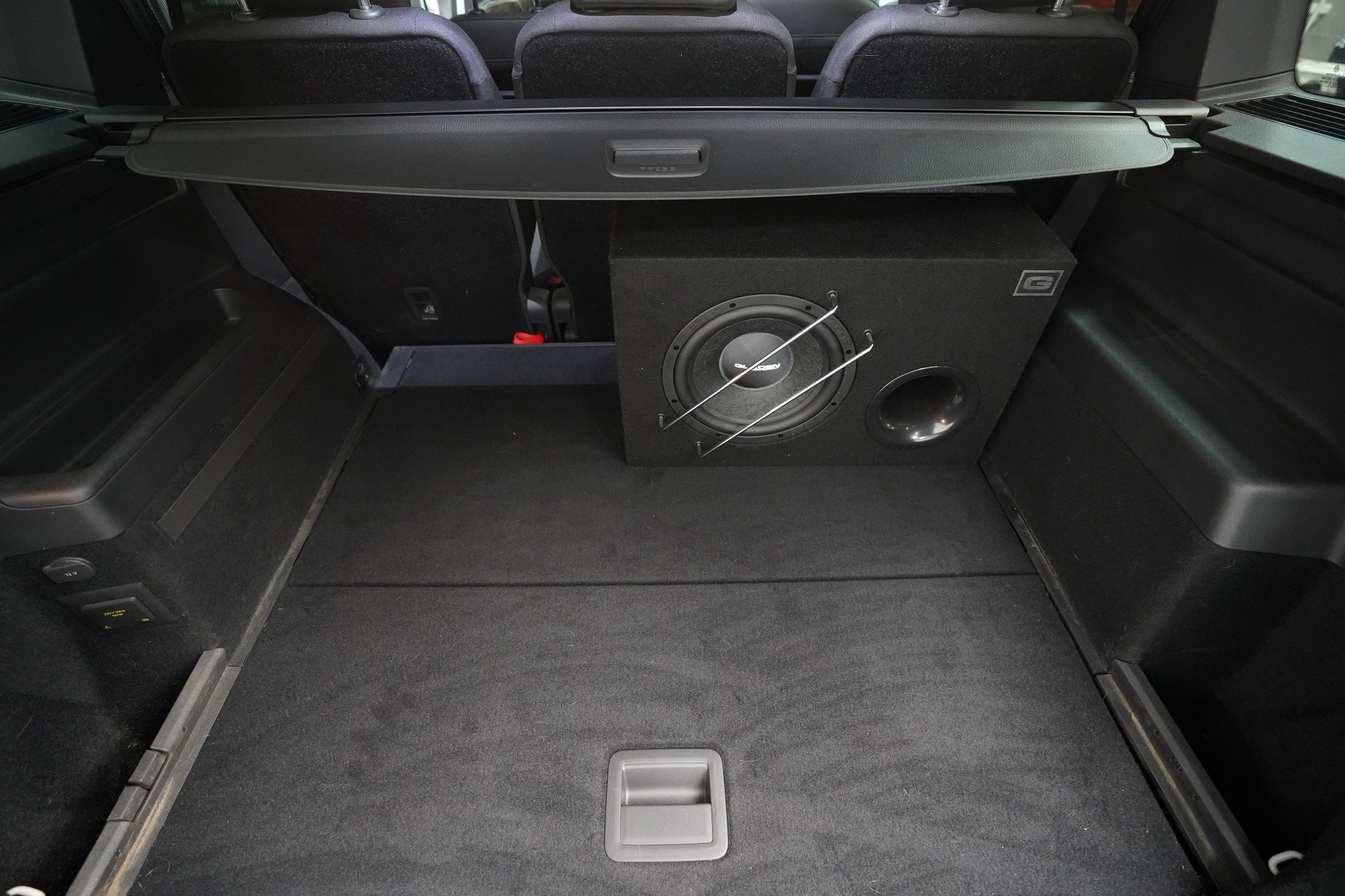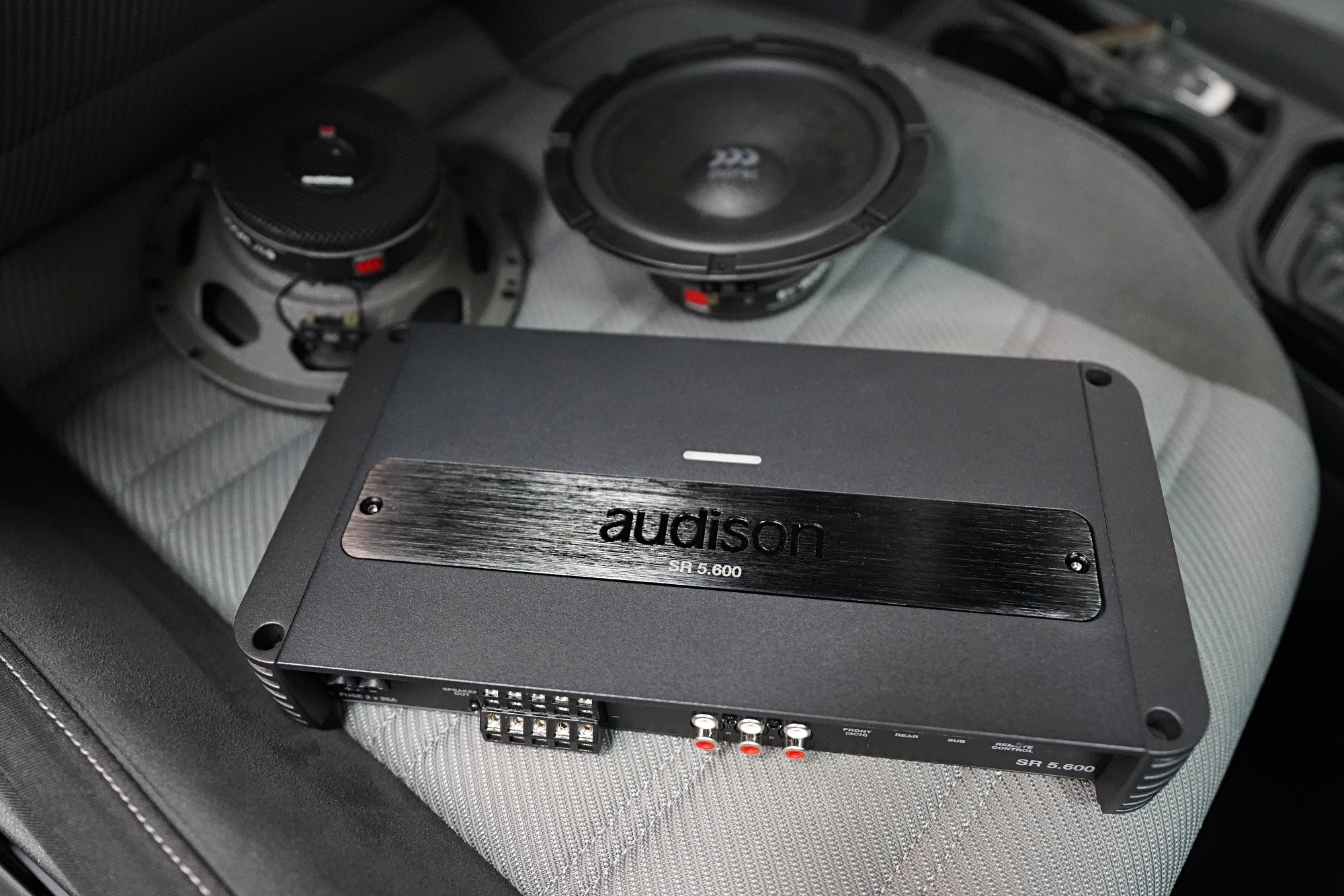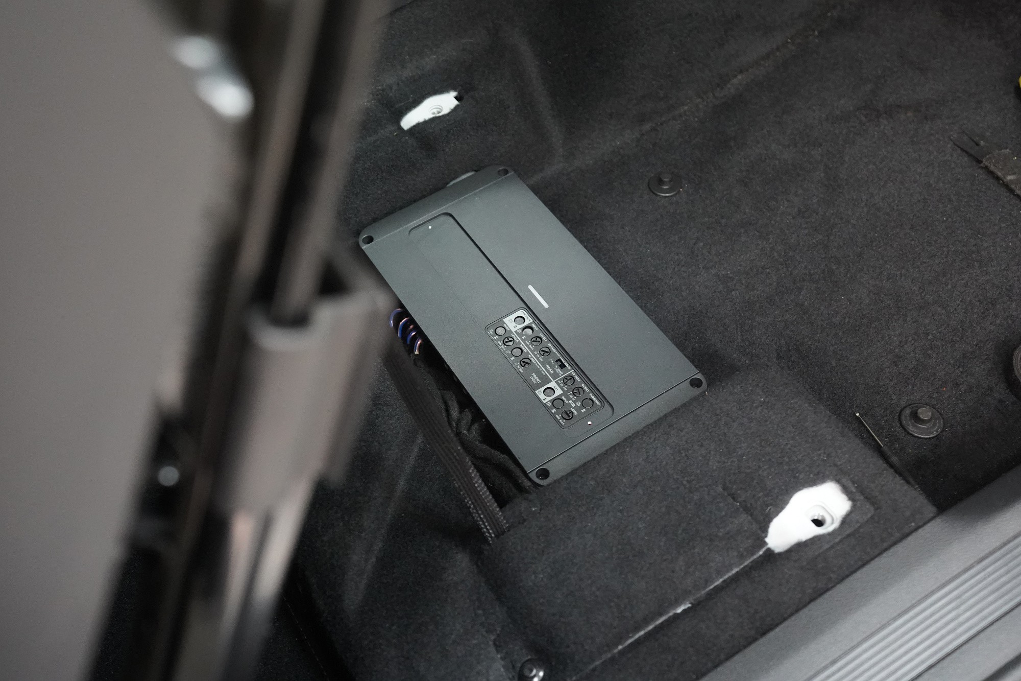 Вид на инсталациятаInstalace reproduktorů, 5kanálového zesilovače a subwooferu