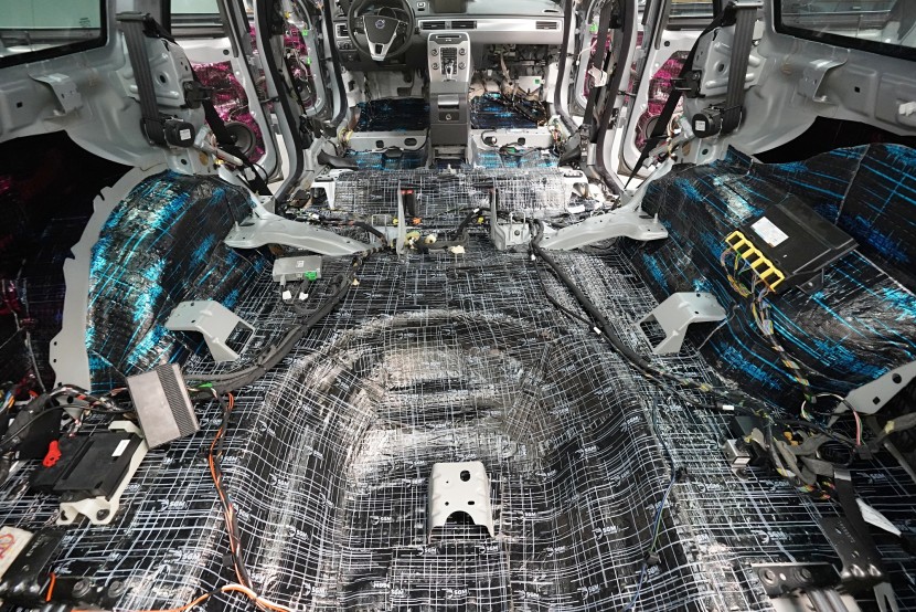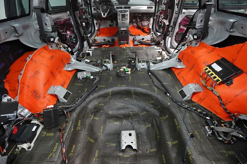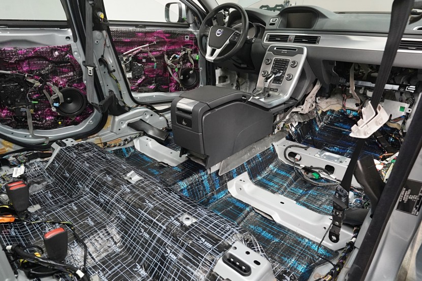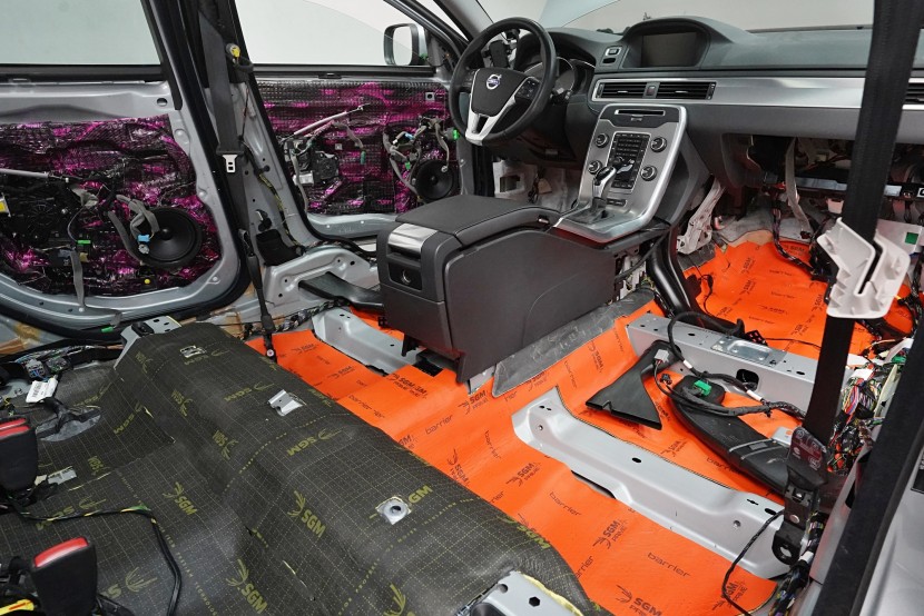 Пълна шумоизолация на автомобила Volvo XC 70 в най-високия възможен обхват и ефективност. Дори Volvo при много от своите модели не може да се похвали със свръхстандартна звукоизолация и пример за това е този комби. При тапицерията на пода и задните калници намираме по-дебел слой фабрична изолация, който допринася за намаляване на шума от пътя и гумите, но това е практически всичко откъм шумоизолация. Обратно, липсва по-изразена защита срещу вибрации, която се среща само точково на резервоара, вратите и пода. Нашата цел е да осигурим на целия автомобил антивибрационен материал, който да предотврати вибрациите и проникването на нискочестотен шум, особено от пода и предните и задните калници. Във втората фаза се фокусираме върху шума със средни и високи честоти, който се елиминира от мембранни звукоизолационни материали. Тъй като собственикът пожела автомобила да бъде шумоизолиран максимално без компромиси, решихме да използваме първокласни материали от руското производство SGM. Шумоизолирахме всички съществени зони на автомобила, конкретно предните, задните и петите врати, пода, товарното отделение включително задните калници, покрива, капака и предните калници от вътрешната страна. Материалите SGM имат и топлоизолационна функция, което ще използвате както през зимата, така и през лятото. По шумоизолацията работят едновременно четирима наши техници, които успяват монтажа в рамките на 1 работен ден.