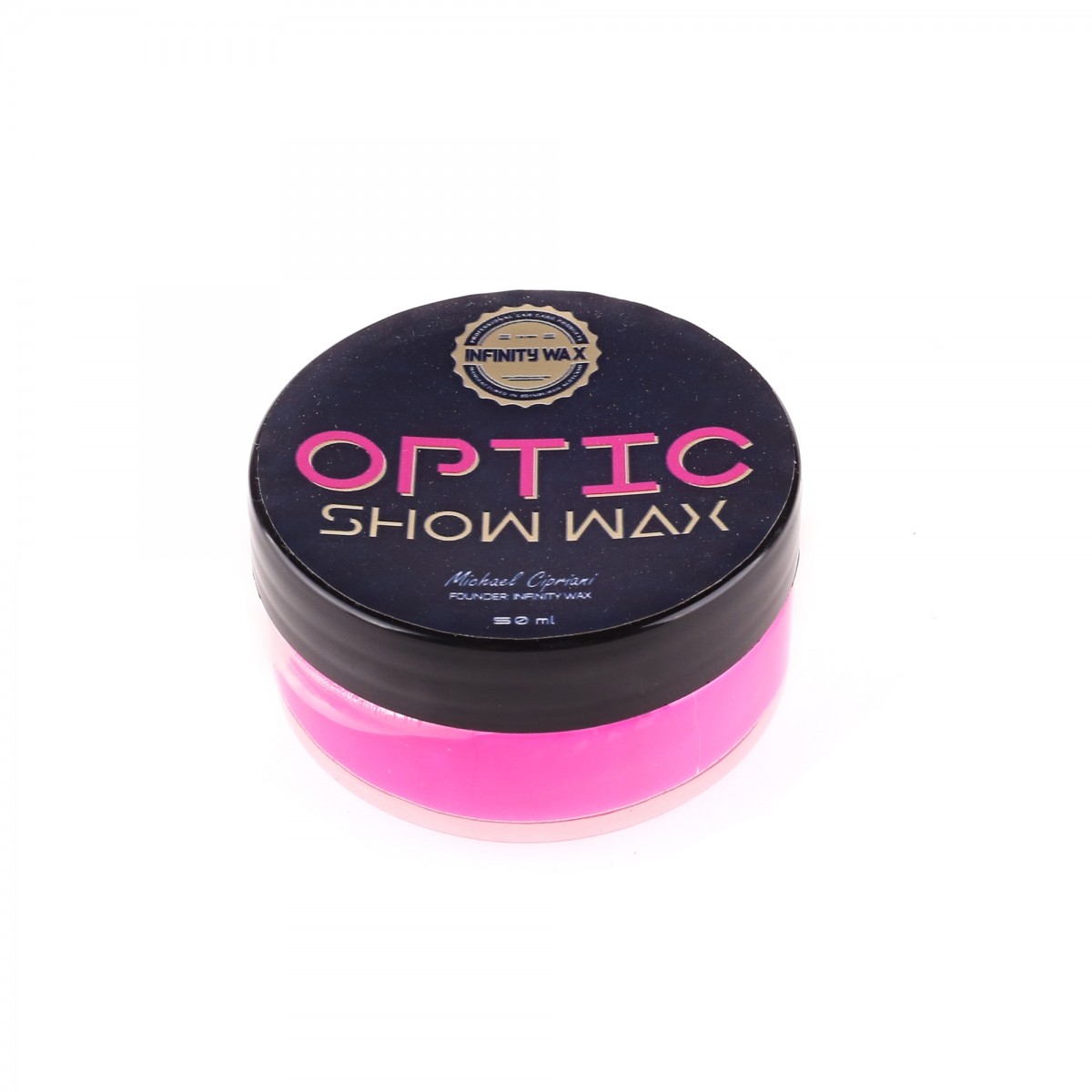 Optic Show Wax е напълно нов полимерен восък, който беше разработван в продължение на 14 месеца, за да осигури максимален блясък на вашия автомобил. Optic Show Wax е единственият восък в продуктовата гама на Infinity Wax, който използва натурално олио за увеличаване на блясъка. Съставът му осигурява защита на лака и хидрофобен ефект до 3 месеца. Въпреки че целта на този восък е да постигне изключителен блясък, можете да очаквате и отличен beading и бързо оттичане на водата. Огромно предимство е лесното му нанасяне — може да се нанася както при топло, така и при студено време, дори при лека мъгла. Идеален помощник, който да извлече максимума от лака ви при всякакви условия.