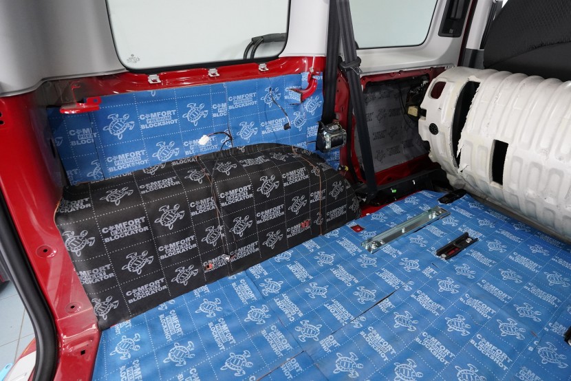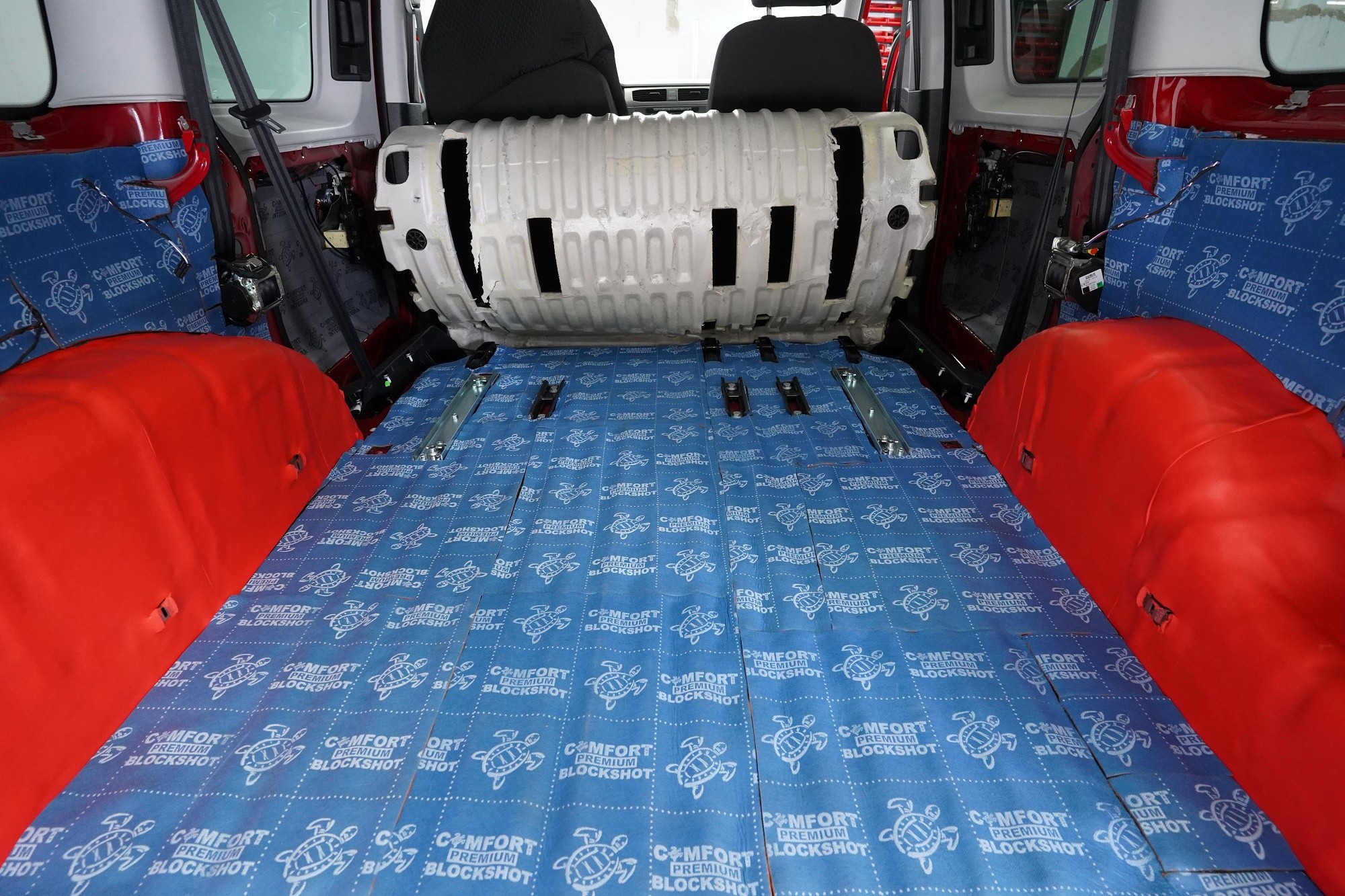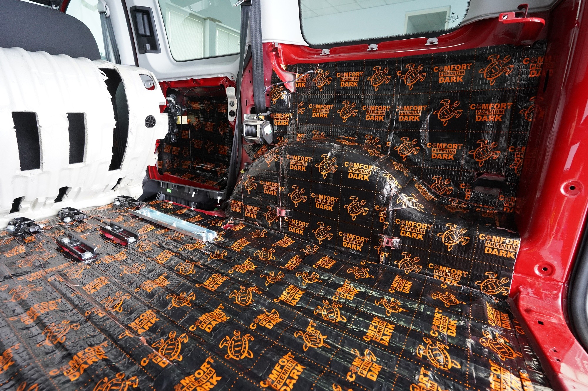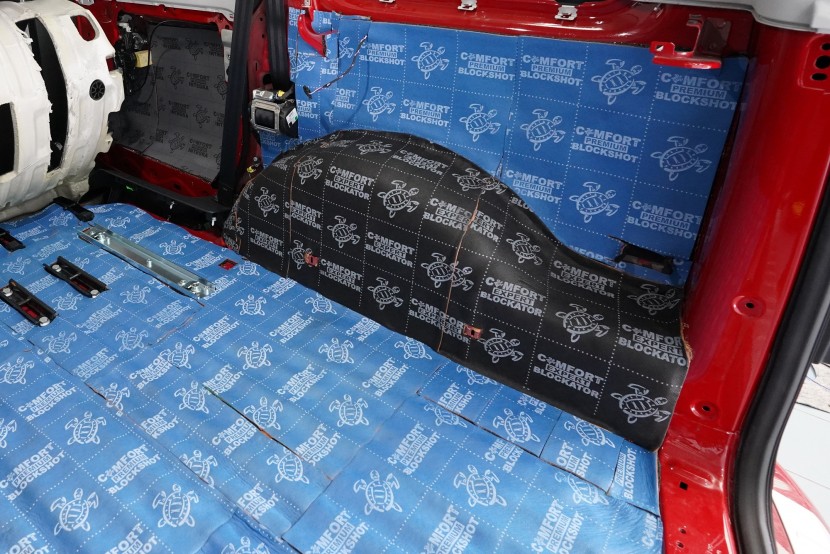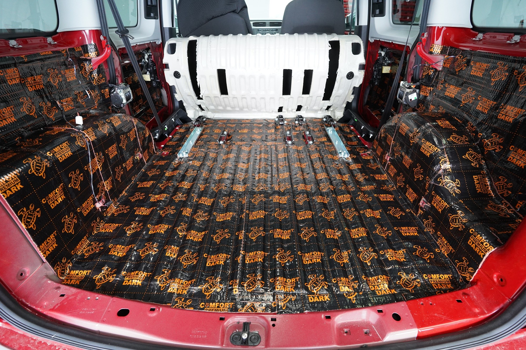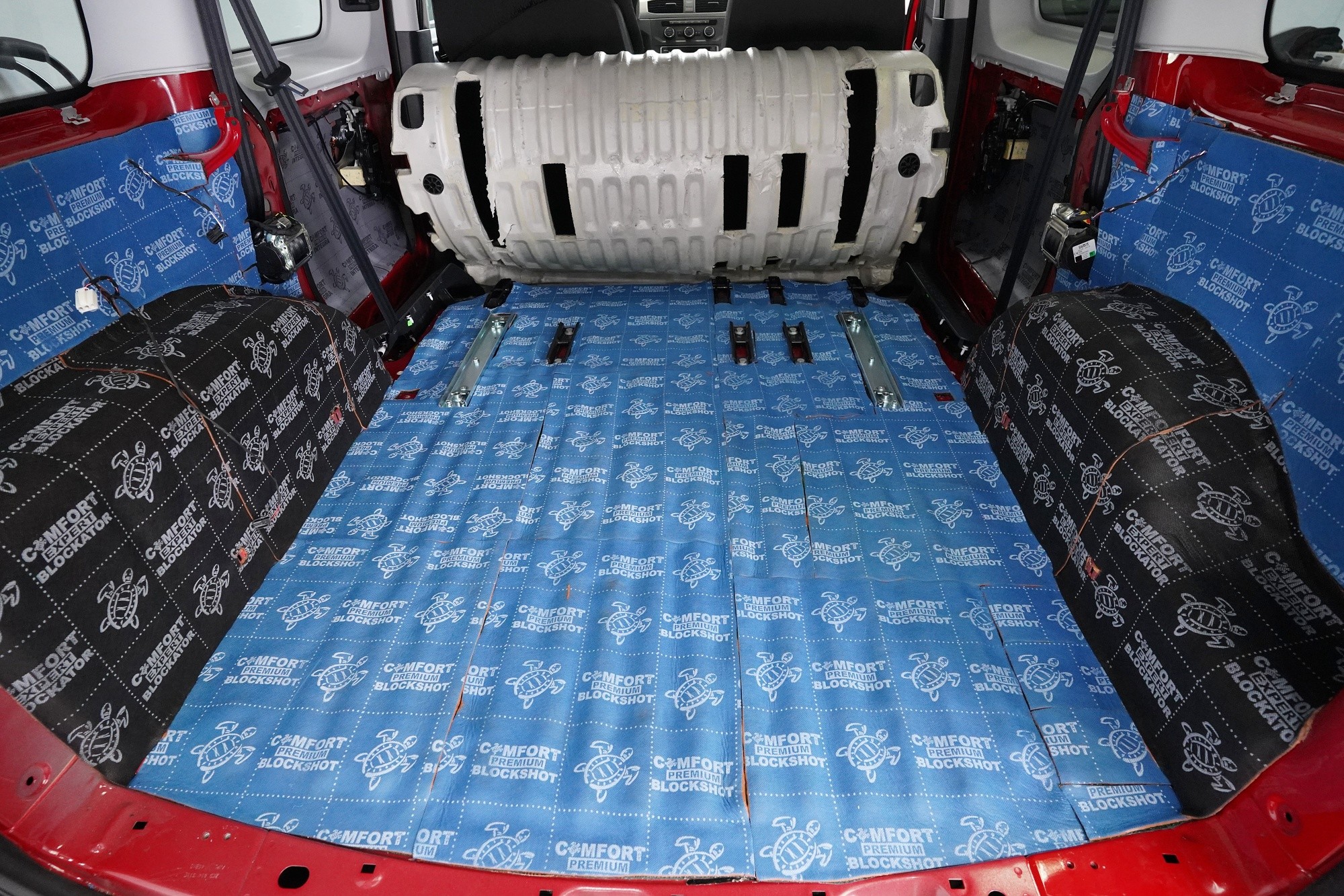 Багажното отделение шумоизолираме в рамките на пакета Premium Plus с до три слоя шумоизолация. На всички повърхности освен задните калници прилагаме виброизолационния материал Dark D2 с дебелина 2,3 мм. Само на калниците обаче лепим по-ефективния материал Dark D3 с дебелина 3 мм и по-висок MLF 0,41. Това е поради по-голямото натоварване от вибрации и шум в задните калници на автомобила. Вторият слой представлява върху цялата площ на багажника премиум шумопоглъщащият материал Comfortmat Blockshot с висока способност за звукова изолация до -31 dB. Такова високо число е възможно благодарение на многослойната конструкция със специална антиишумна мембрана, която предотвратява проникването на шум към интериора на автомобила. Само на калниците прилагаме втория и третия слой под формата на Comfortmat Vision и Comfortmat Blockator. Комбинацията от тези материали има способност за звукова изолация до екстремни -35 dB.
