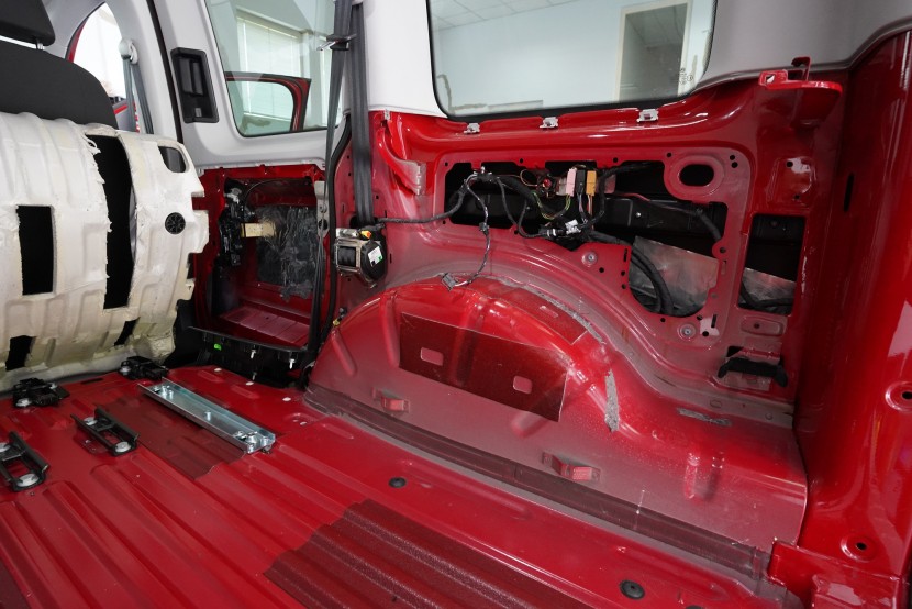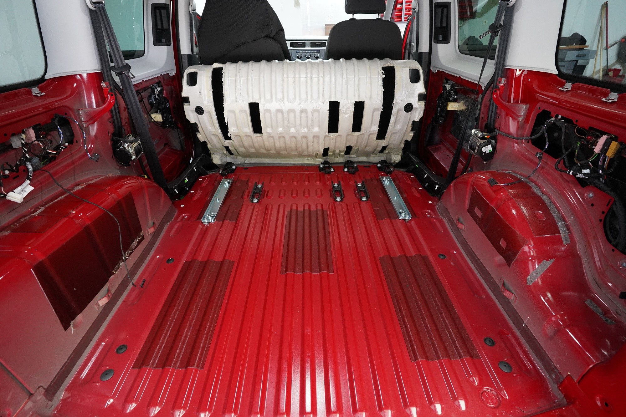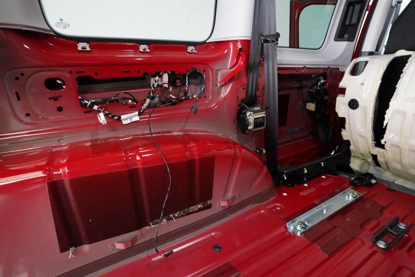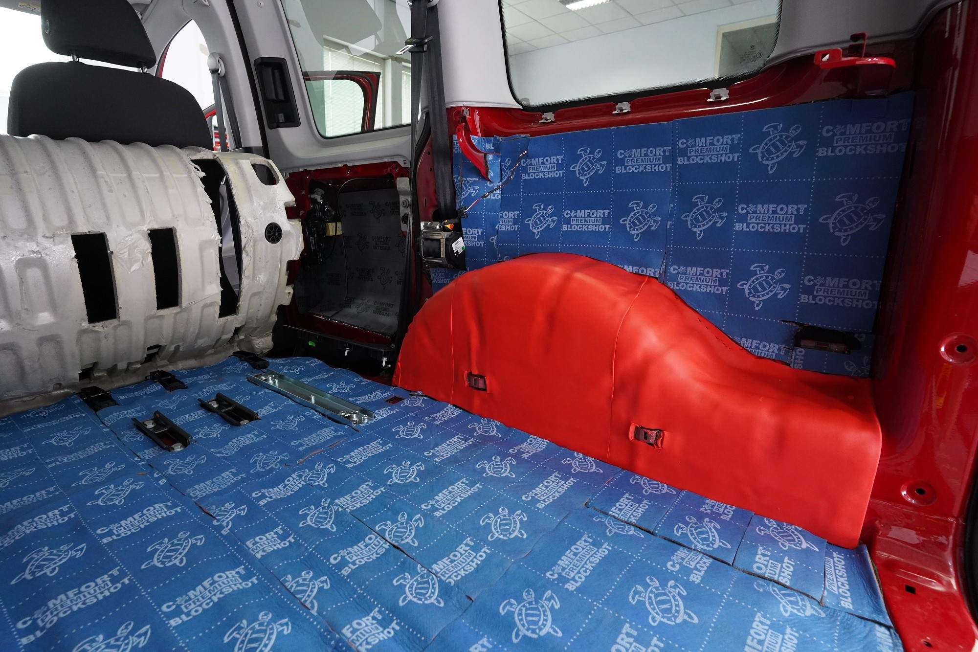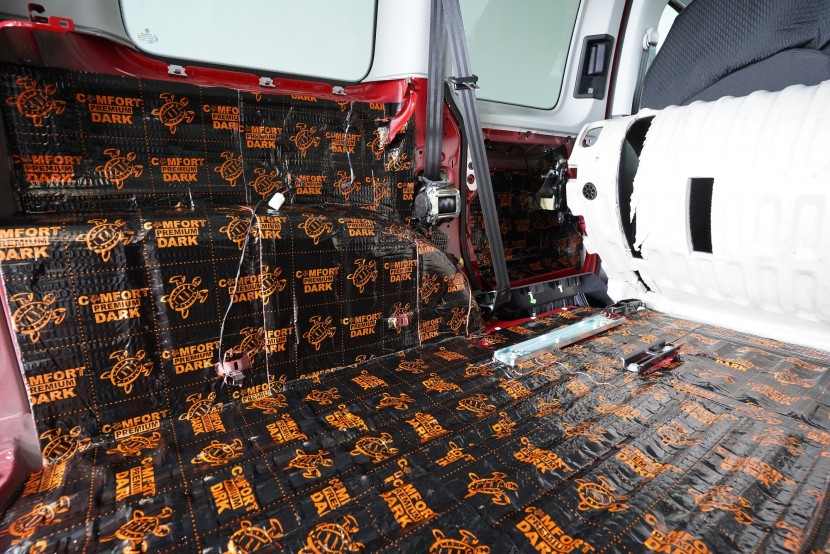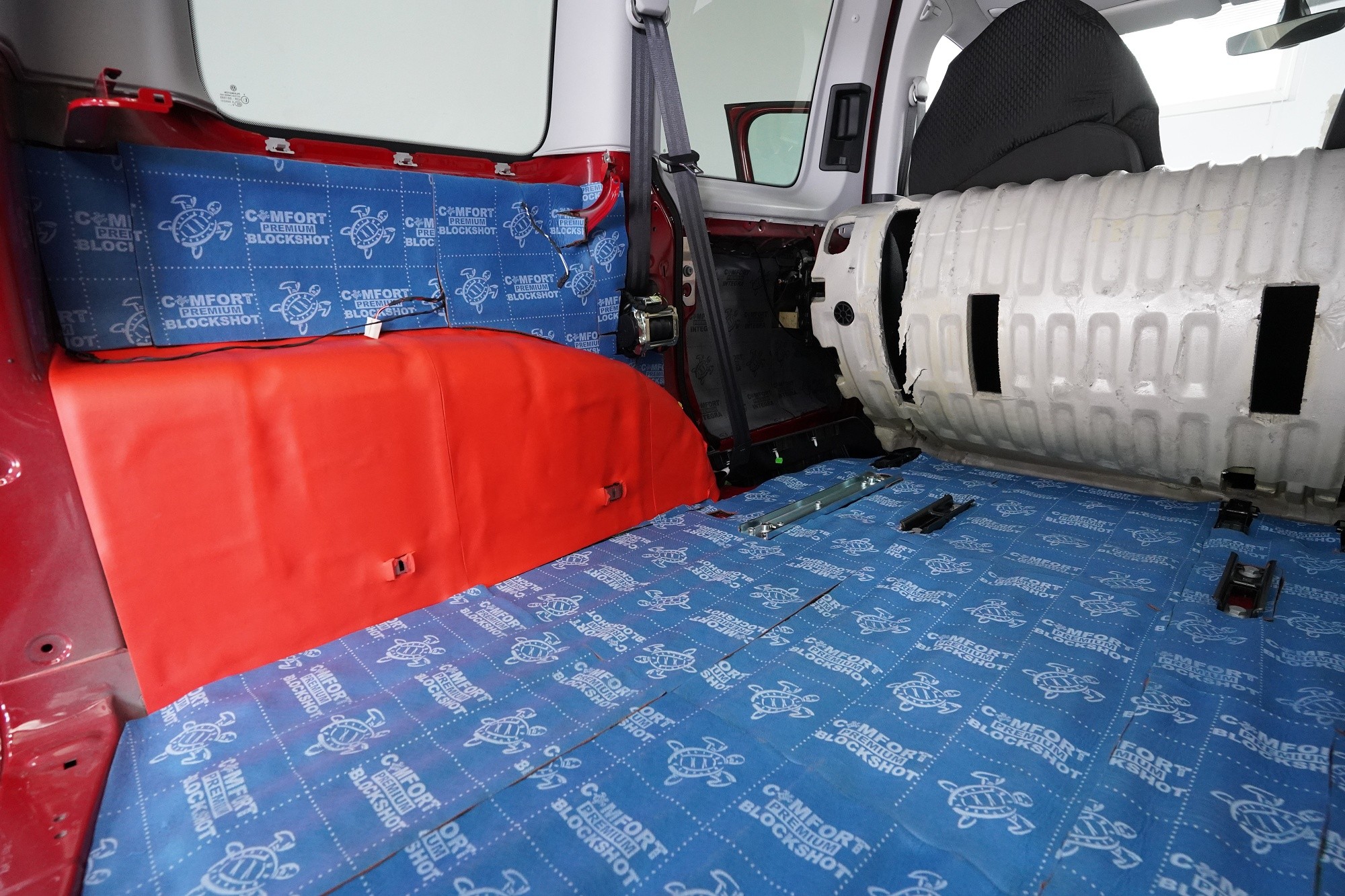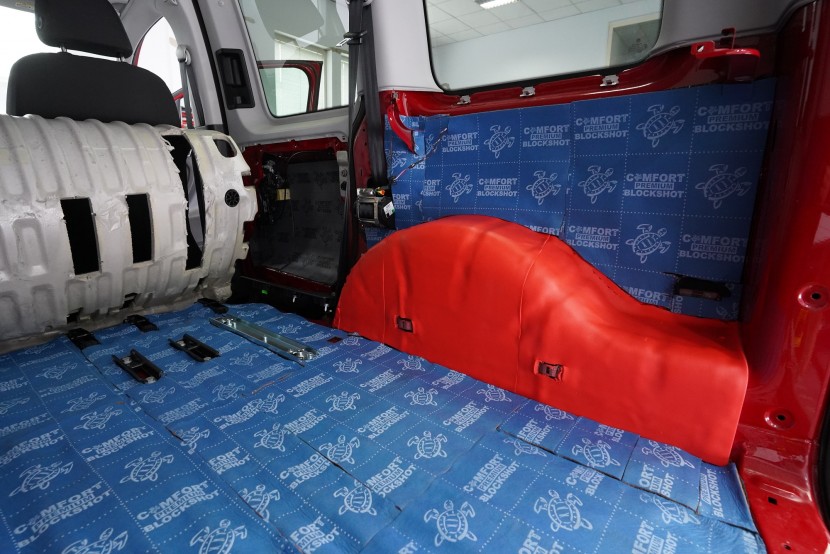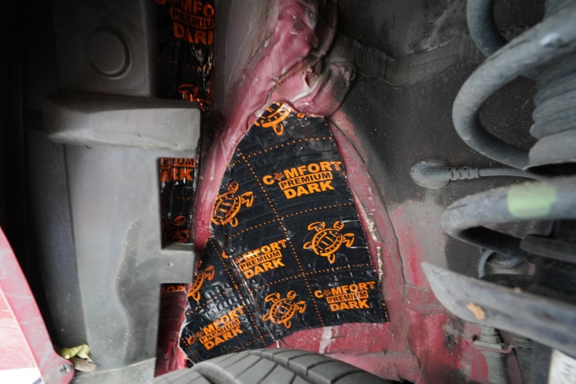 Багажното отделение шумоизолираме в рамките на пакета Premium Plus с до три слоя шумоизолация. На всички повърхности освен задните калници прилагаме виброизолационния материал Dark D2 с дебелина 2,3 мм. Само на калниците обаче лепим по-ефективния материал Dark D3 с дебелина 3 мм и по-висок MLF 0,41. Това е поради по-голямото натоварване от вибрации и шум в задните калници на автомобила. Вторият слой представлява върху цялата площ на багажника премиум шумопоглъщащият материал Comfortmat Blockshot с висока способност за звукова изолация до -31 dB. Такова високо число е възможно благодарение на многослойната конструкция със специална антиишумна мембрана, която предотвратява проникването на шум към интериора на автомобила. Само на калниците прилагаме втория и третия слой под формата на Comfortmat Vision и Comfortmat Blockator. Комбинацията от тези материали има способност за звукова изолация до екстремни -35 dB.
