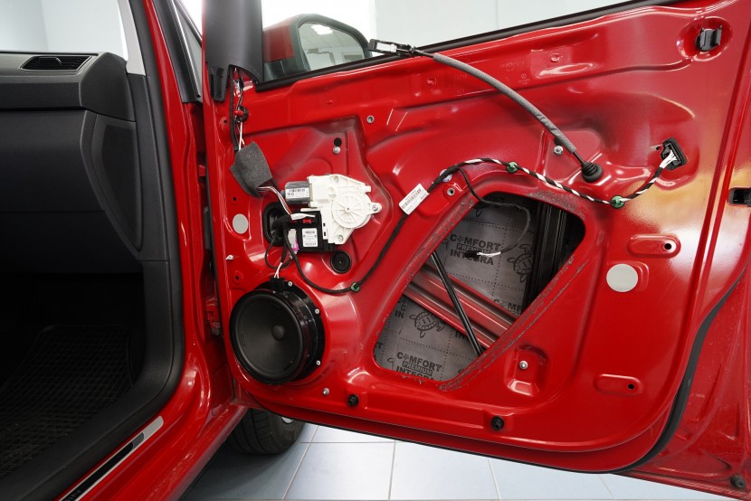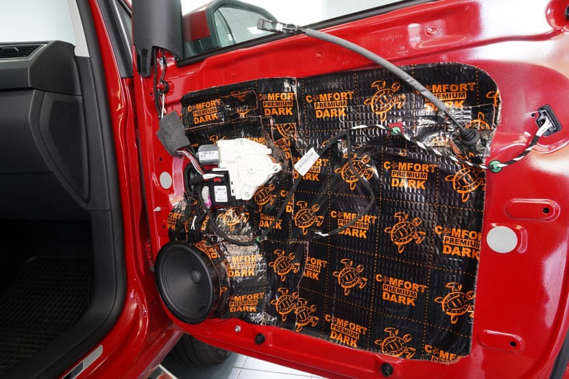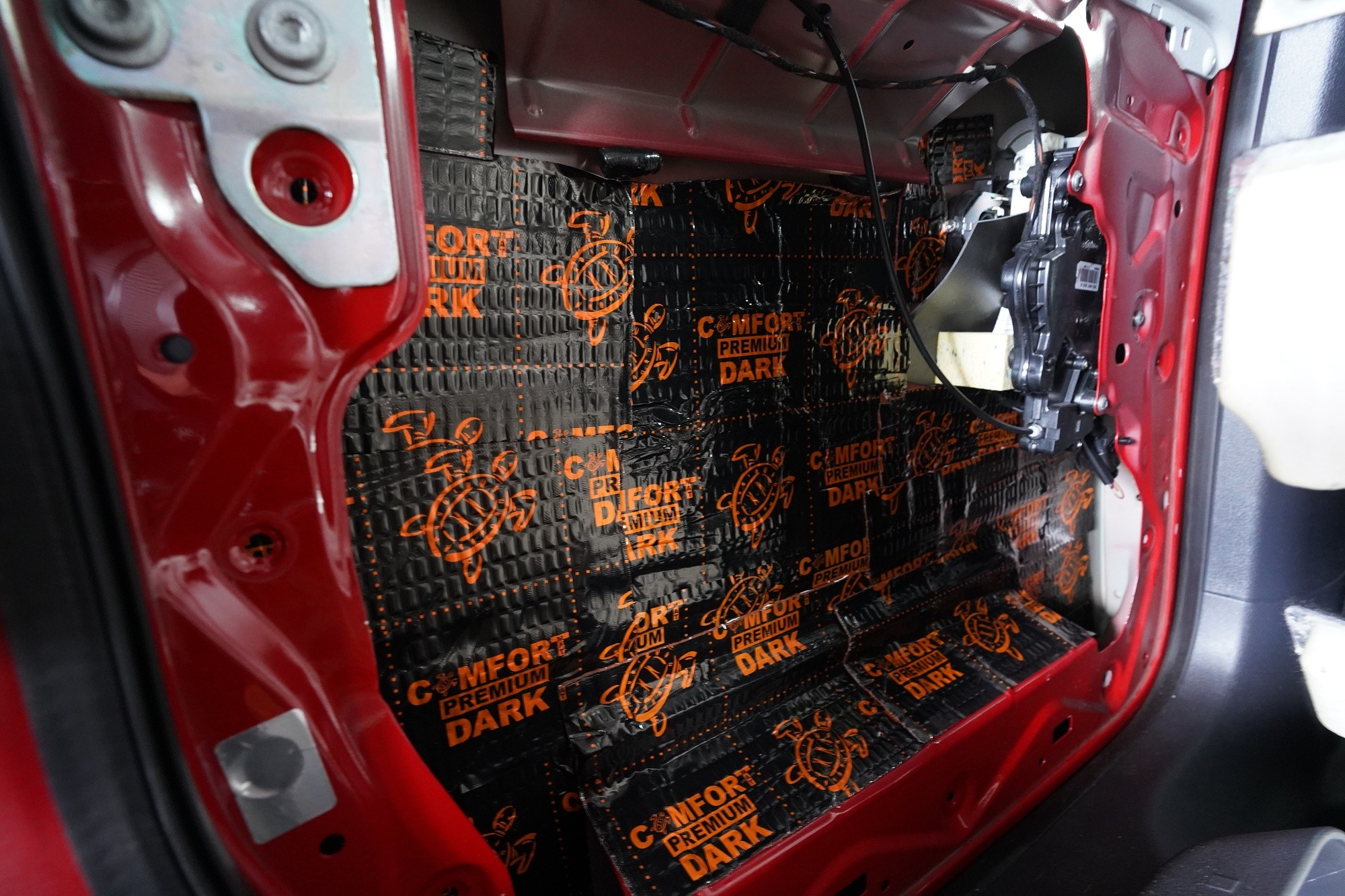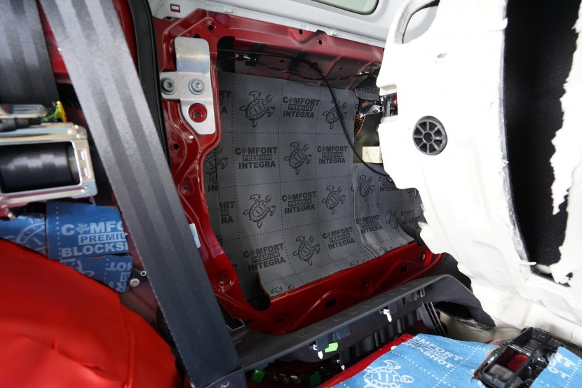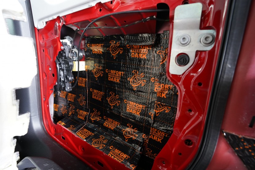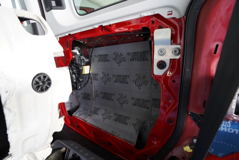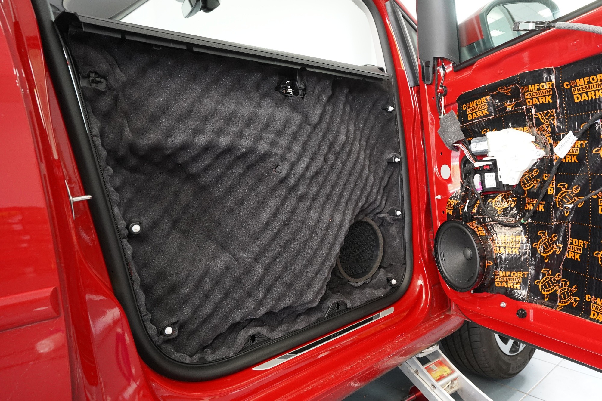 Предните врати шумоизолираме в 4 слоя, тъй като това е област, силно натоварена с вибрации и шум. Първо на външния ламаринен панел прилагаме премиум виброизолационния материал Comfortmat D2 и след това шумопоглъщащия материал Comfortmat Integra, който е специално предназначен за вратите на автомобила. Този материал позволява благодарение на уникалната си антирушаща мембрана безпрецедентна способност за шумоизолация на вратите и осигурява звукова изолация до -28 dB. След това отново поставяме виброизолационния материал Comfortmat D2 върху вътрешния ламаринен панел на вратата. Последната стъпка е шумоизолацията на обшивката на вратата с помощта на гъвкавата формова пяна Comfortmat Soft Wave. Подобна процедура и същите материали използваме и в случай на петата врата.