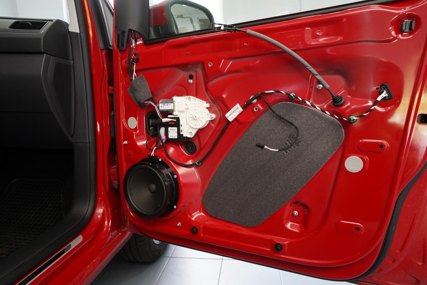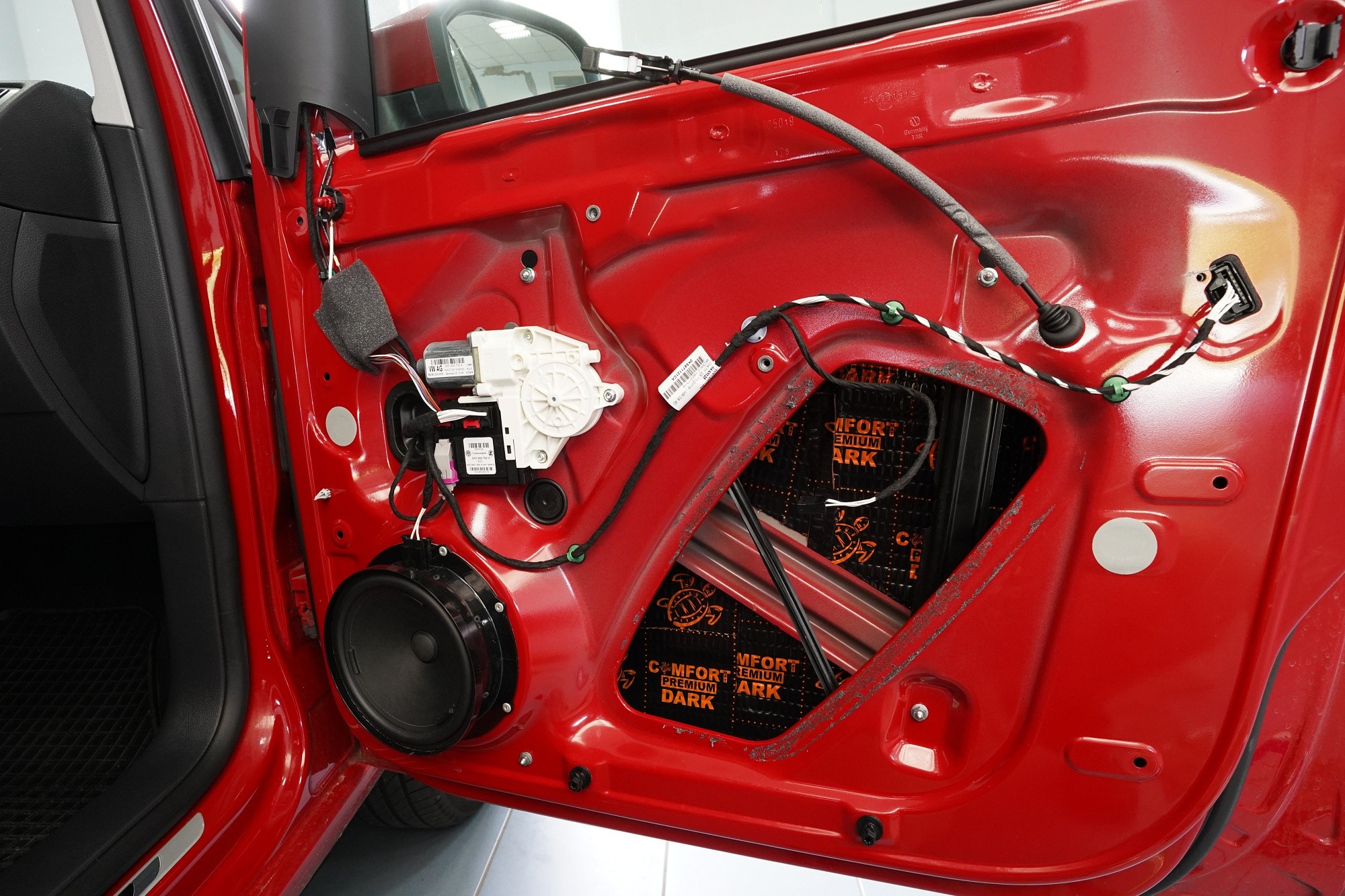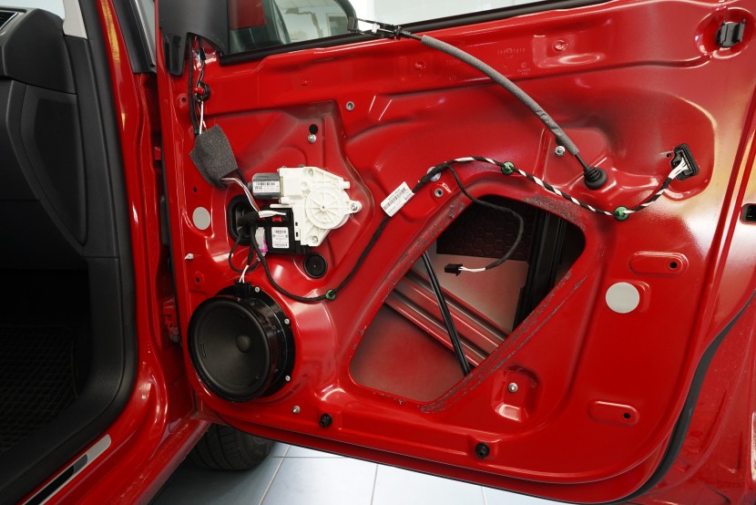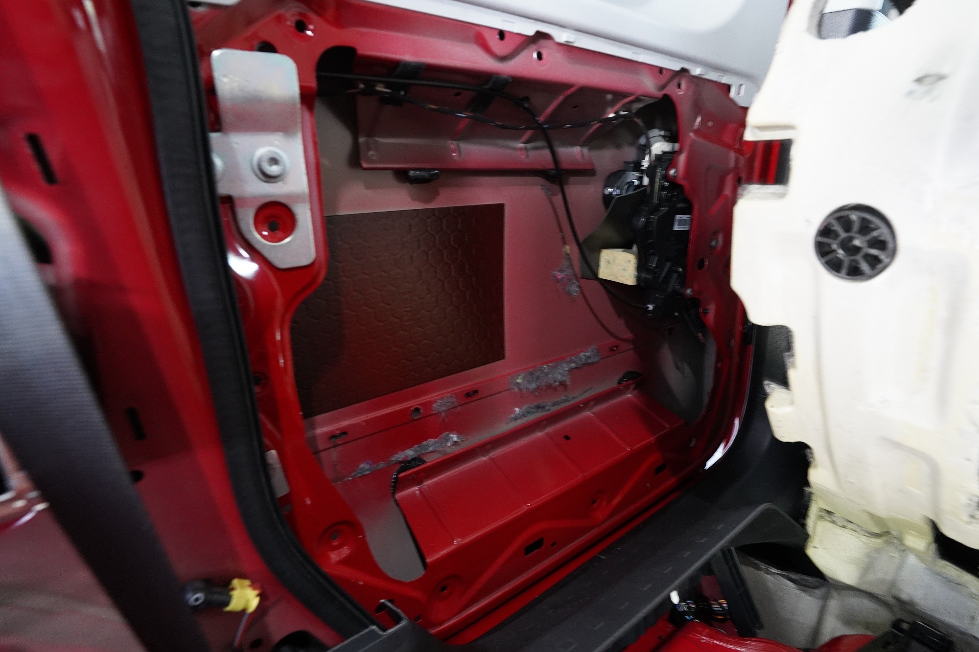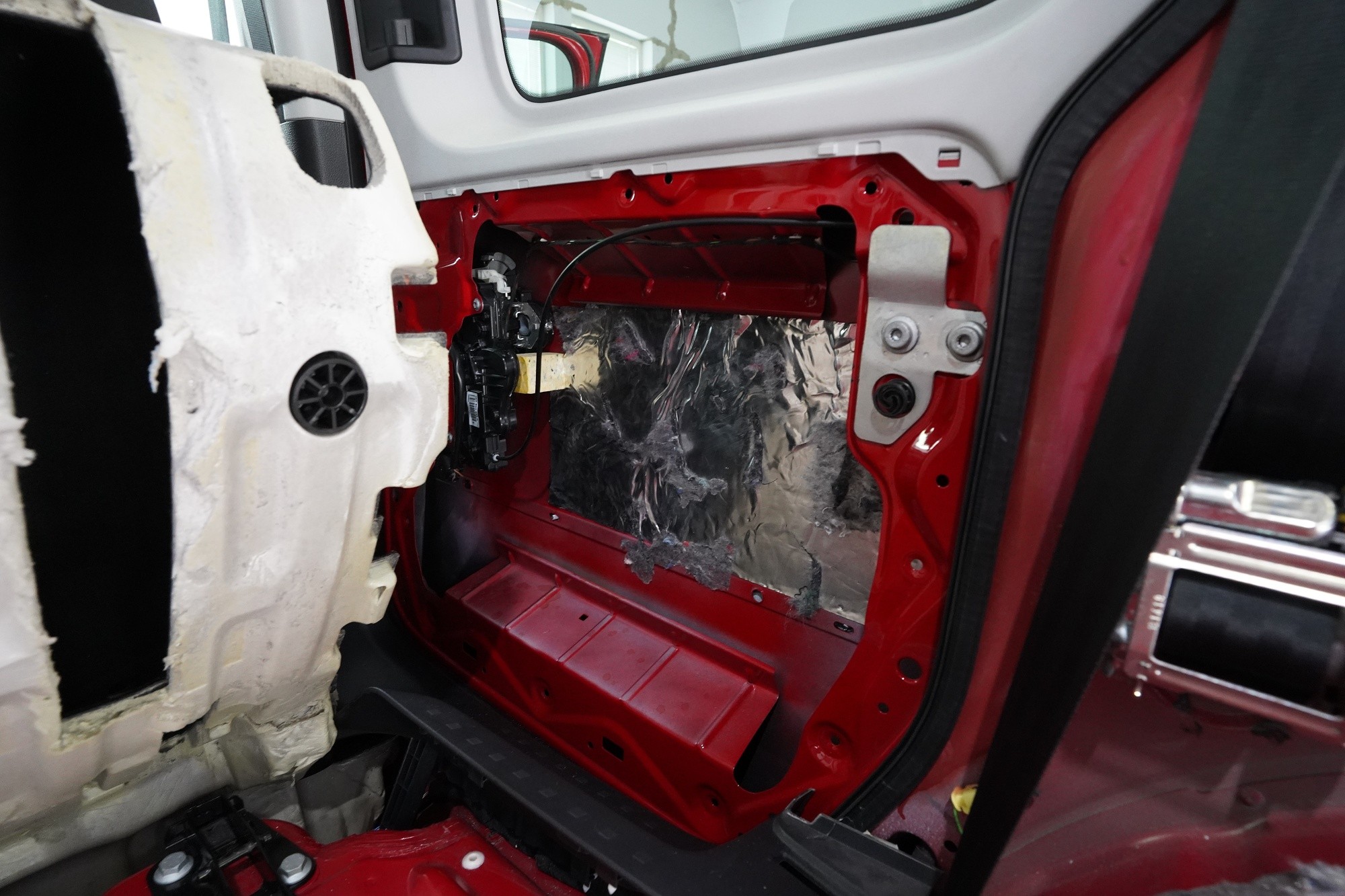 Предните врати шумоизолираме в 4 слоя, тъй като това е област, силно натоварена с вибрации и шум. Първо на външния ламаринен панел прилагаме премиум виброизолационния материал Comfortmat D2 и след това шумопоглъщащия материал Comfortmat Integra, който е специално предназначен за вратите на автомобила. Този материал позволява благодарение на уникалната си антирушаща мембрана безпрецедентна способност за шумоизолация на вратите и осигурява звукова изолация до -28 dB. След това отново поставяме виброизолационния материал Comfortmat D2 върху вътрешния ламаринен панел на вратата. Последната стъпка е шумоизолацията на обшивката на вратата с помощта на гъвкавата формова пяна Comfortmat Soft Wave. Подобна процедура и същите материали използваме и в случай на петата врата.