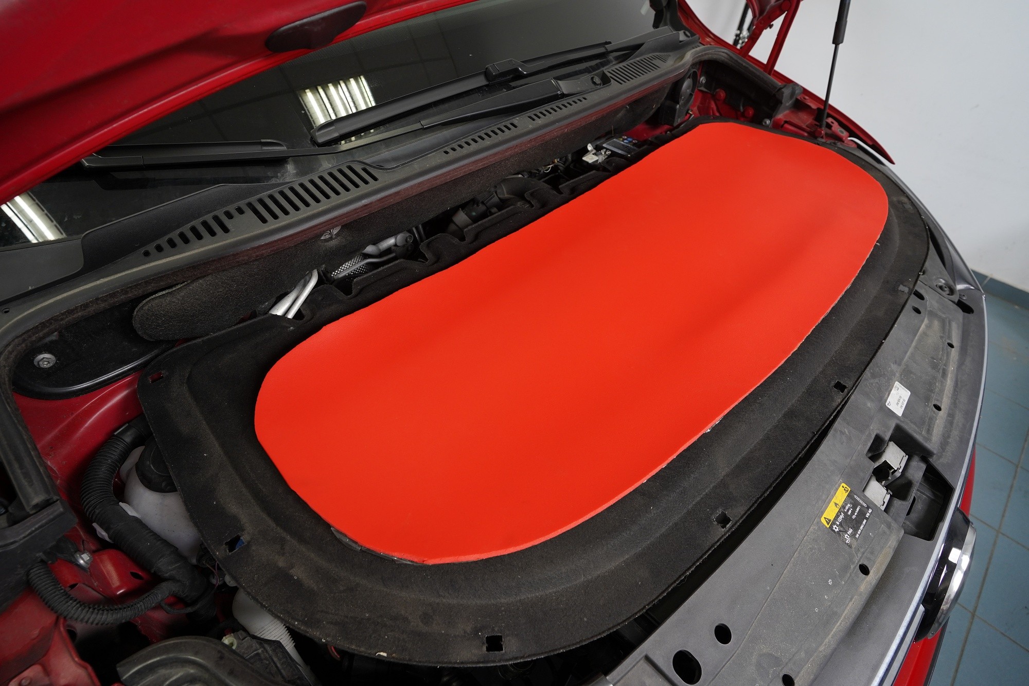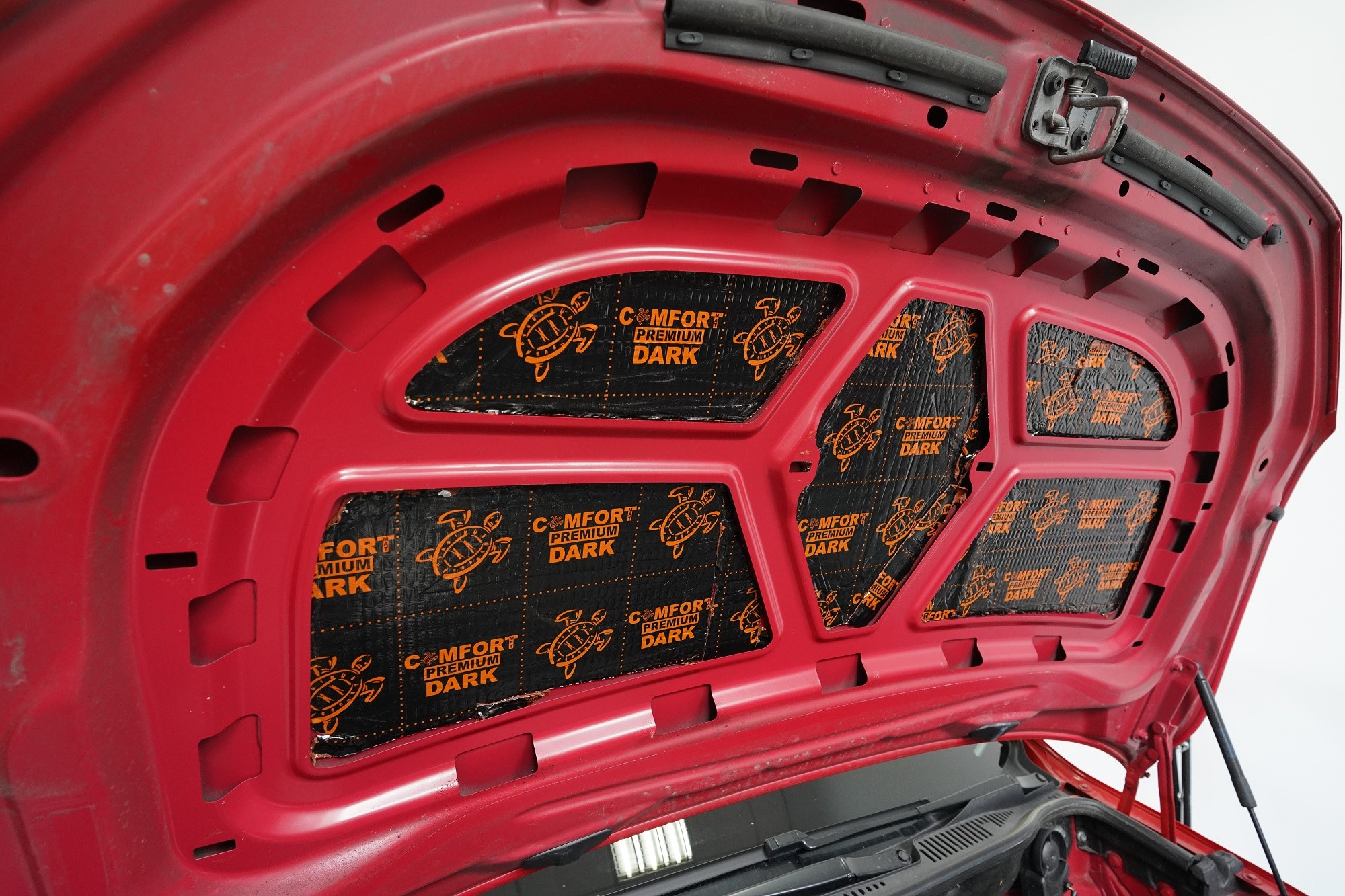Капакът заглушаваме в два слоя - виброизолационен материал върху ламарината на капака и след това шумопоглъщащ материал Comfortmat Vision върху оригиналния капак на двигателя, благодарение на което запазваме желаната оригинална визия на моторния отсек. Друга област на шумоизолация в рамките на пакета Premium Plus са предните калници. Металната част на предните калници заглушаваме с мощен виброизолационен материал Comfortmat D4 с дебелина 4 мм и висок акустичен загубен фактор (MLF) с стойност 0,49. Предните пластмасови калници шумоизолираме с мембранен шумопоглъщащ материал Comfortmat Blockshot.