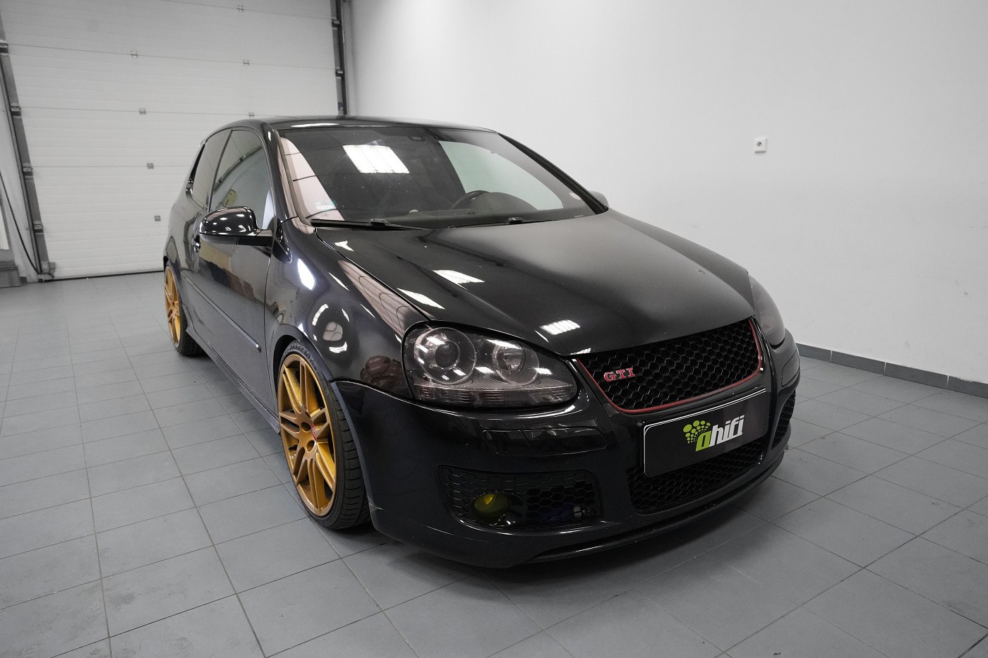 Монтаж на субуфер в страничната облицовка на багажника при VW Golf от 5-то поколение. Идеалното решение за клиенти, които искат да подобрят басовата част на озвучаването, без да губят обем от багажното отделение. За целта използваме OEM кутия, изработена за конкретния модел автомобил, и субуфер, подходящ за кутия с малък обем. В този случай избрахме субуфер с диаметър 250 mm Hertz с достатъчна мощност 300 W RMS. Усилвателят на същия производител, който захранва не само субуфера, но и предните говорители, поставихме в двойното дъно на багажника.
