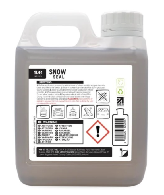ValetPRO Snow Seal е специално създадено защитно покритие за използване с пенна приставка и високонапорен почиствач. Snow Seal "обгръща" вашия автомобил с издръжливо хидрофобно покритие, което води до желан ефект на оформяне на водни капки. Snow Seal също оставя впечатляващо блестяща повърхност на лака. Приложението не може да бъде по-лесно - просто напръскайте върху чист автомобил в препоръчано разреждане, изплакнете и след това подсушете.Основни характеристики