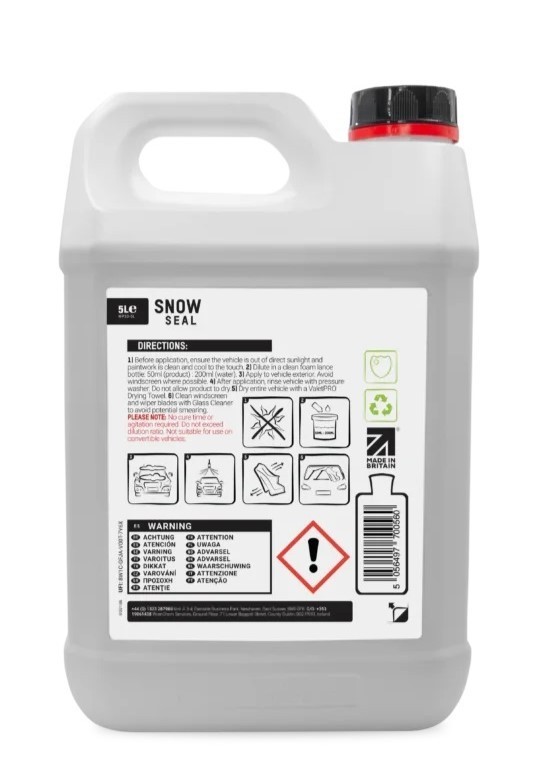 ValetPRO Snow Seal е специално създадено защитно покритие за използване с пенна приставка и високонапорен почиствач. Snow Seal "обгръща" вашия автомобил с издръжливо хидрофобно покритие, което води до желан ефект на оформяне на водни капки. Snow Seal също оставя впечатляващо блестяща повърхност на лака. Приложението не може да бъде по-лесно - просто напръскайте върху чист автомобил в препоръчано разреждане, изплакнете и след това подсушете.Основни характеристики