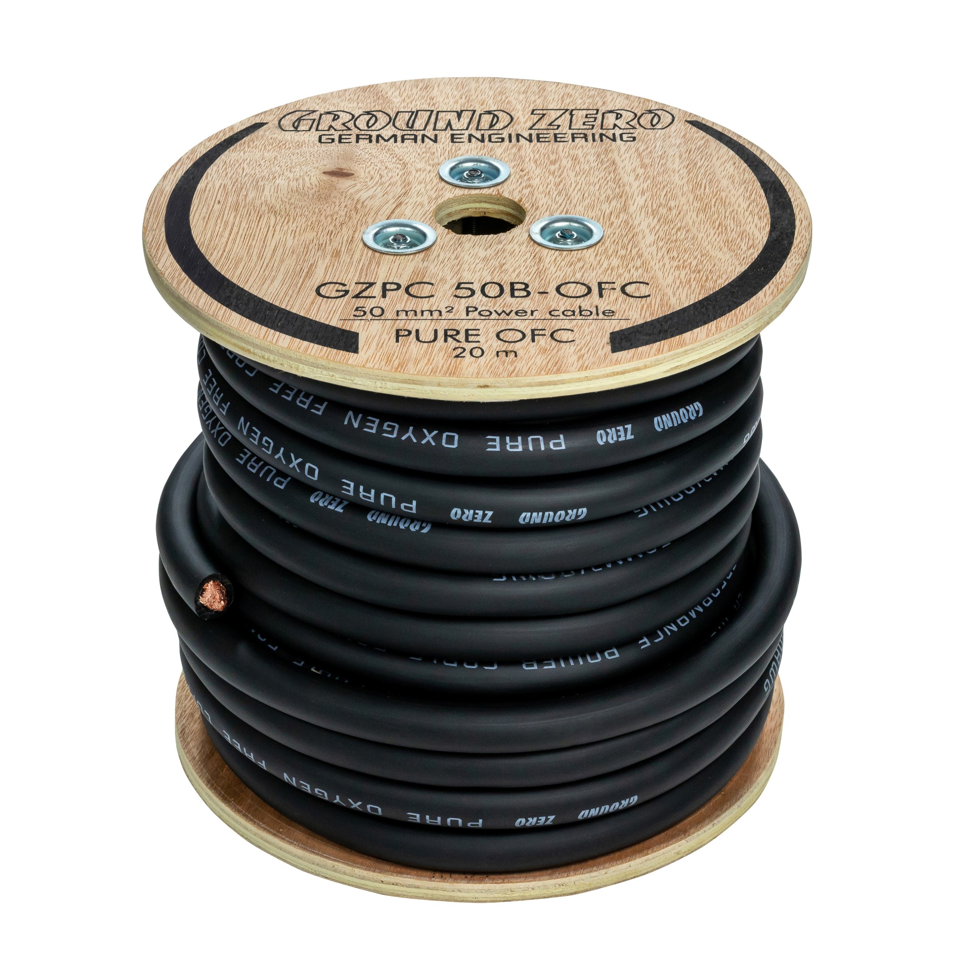 Ground Zero GZPC 50B-OFC е висококачествен захранващ кабел с напречно сечение 35 mm², предназначен за взискателни аудиоинсталации. Жилото е изработено от чиста безкислородна мед (OFC – Oxygen Free Copper), която гарантира минимални контактни съпротивления, висока проводимост и дълготрайна стабилност дори при високи токове. В сравнение с по-евтините CCA кабели осигурява значително по-ниски загуби на напрежение, по-добър пренос на мощност и по-висока устойчивост на окисляване. Благодарение на изключително гъвкавата изолация кабелът е лесен за работа дори в стеснени пространства на автомобила. Здрава черна обвивка осигурява механична издръжливост, защита срещу триене и дълъг живот дори при професионални инсталации. Кабелът е навит на дървена макара и се доставя на метър.