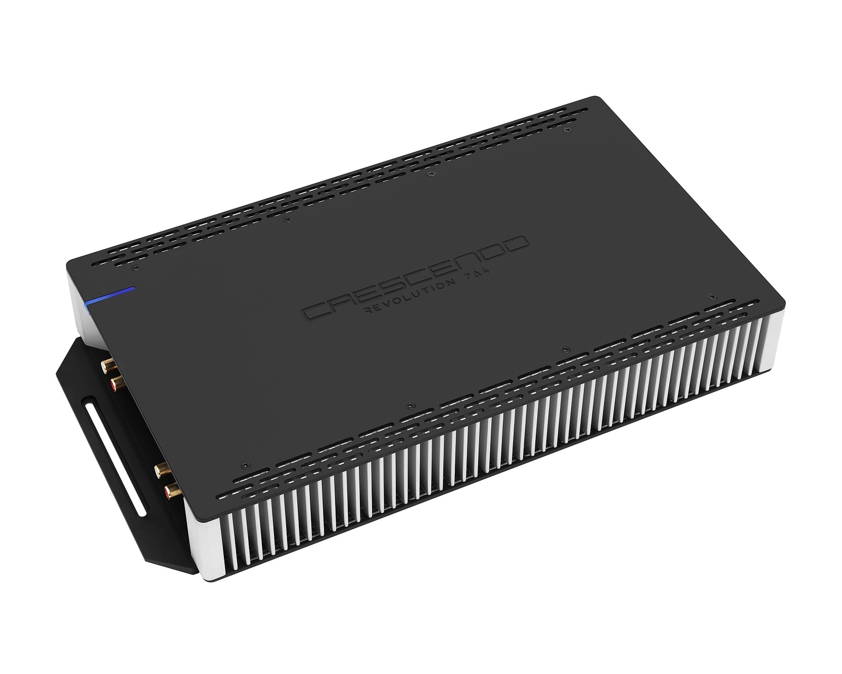 Crescendo представя своето върхово майсторско произведение. 4-каналният усилвател Crescendo Revolution 7A4 се отличава с безпрецедентно качество на звуковото възпроизвеждане и абсолютна неутралност, което го прави предпочитан избор за аудиофили, професионалисти в бранша и музикални ентусиасти на sound quality конкурси. Изключителният звук на този усилвател е директно следствие от използването на high-end компоненти, които обещават изключително звуково преживяване, надхвърлящо границите на върховия клас. Revolution 7A4 постига перфектен баланс между детайлност и музикалност благодарение на идеалната комбинация от напреднала технология и висококачествени вътрешни компоненти. Особено заслужават внимание висококласните Burr Brown преобразуватели, high-end кондензатори Elna за осигуряване на ефективно и непрекъснато захранване и високоефективни потенциометри. Всеки канал на усилвателя е също индивидуално пригоден за перфектно балансиране. Можете да разчитате и на стабилна мощност благодарение на двойното симетрично захранване със защитени трансформатори и големи кондензатори. Само по себе си е отличната свързаност с клеми позлатени с 24-каратово злато, които красят и печатните платки. Екструдираният радиатор с оптимизация за пренос на топлина осигурява оптимална температура дори при интензивна употреба. Отделна тема е изключително ниското хармонично изкривяване и отличните стойности на съотношението сигнал-шум, които гарантират кристално чист звук. Забележите и луксозния дизайн на това красиво устройство, което комбинира черни и сребристи елементи в най-модерен облик. Можете да разчитате не само на изискан звук с огромна мощност, но и на ненадминат дизайн, който ще изпъкне във всяка инсталация. Фокусът върху абсолютното звуково качество е видим и по отсъствието на всички филтри и филтриращи вериги, които биха могли негативно да повлияят крайния звук. Поради това в Crescendo считат външния DSP процесор за незаменима част от всяка качествена инсталация. За свързване са предвидени единствено нисконивоови RCA входове. Усилвателят е подготвен и за възпроизвеждане на музика с висока резолюция благодарение на изключително разширения честотен диапазон. Ако търсите съвършенство, Crescendo Revolution 7A4 е ясен избор. Версията Deluxe съдържа изработени по поръчка high-end Mini ANL предпазители Harmonic Harmony от сребро за още по-детайлен звук без компромиси.