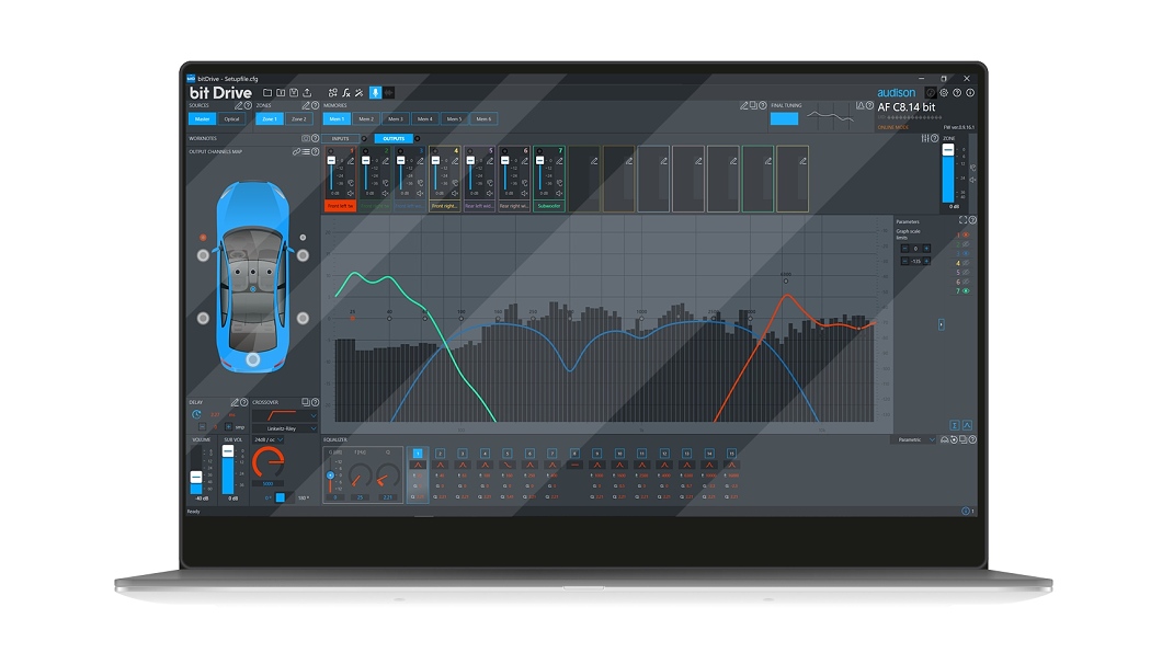 Изцяло новият бит Drive PC софтуер на Audison може да анализира, маршрутизира и коригира сигнала по напълно нови начини – вече можете да измервате, смесвате и накрая нагаждате звука с един мощен инструмент! Новият графичен потребителски интерфейс опростява всяко управление и функция, интегрира акустичните измервания и осигурява ефективно настройване и страхотен звук! Acoustic RTA е интегриран в графиката на еквалайзера и е съвместим с вашия USB микрофон или звукова карта. Функцията Final EQ позволява крайна еквализация без увреждане на деликатните отношения между лявата и дясната честота. Шестте обработвани изхода на предусилвателя са допълнение към осемте усилени канала, което позволява на DSP секцията на Forza лесно да управлява по-голяма система.