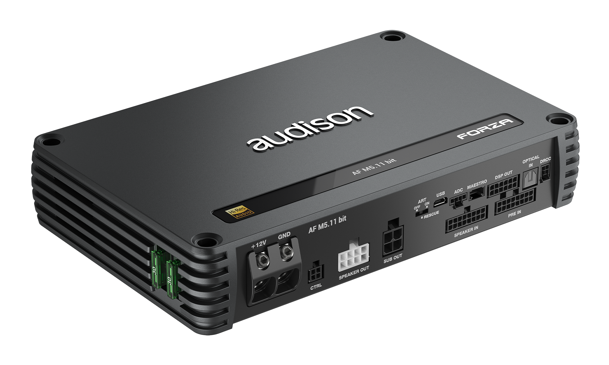 Audison AF M5.11 bit от най-новото поколение усилватели Forza от 2022 г. предлага 5 високофиделни усилени канала 100 W x 4 + 400 W на 4 Ω, 150 W x 4 + 600 W на 2 Ω с аудиофилски звук благодарение на най-новото поколение технология Audison D-Class. По-високата честота на превключване, по-стръмното филтриране и компонентите с по-висока толерантност предоставят звук, надхвърлящ очакванията за клас D – в удивително компактен корпус! Това е комбинирано с нативен DSP, работещ при 24 bit/96 kHz, разширявайки звуковия обхват до 40 kHz и позволявайки постигането на желаната сертификация High-Resolution. Усилвателят може да работи и в мостов режим, което позволява гъвкава и мощна производителност. Поддръжката на функцията Absolute Volume Audison B-CON гарантира максимална битова дълбочина дори при безжична връзка.Нов софтуер за настройка на DSP